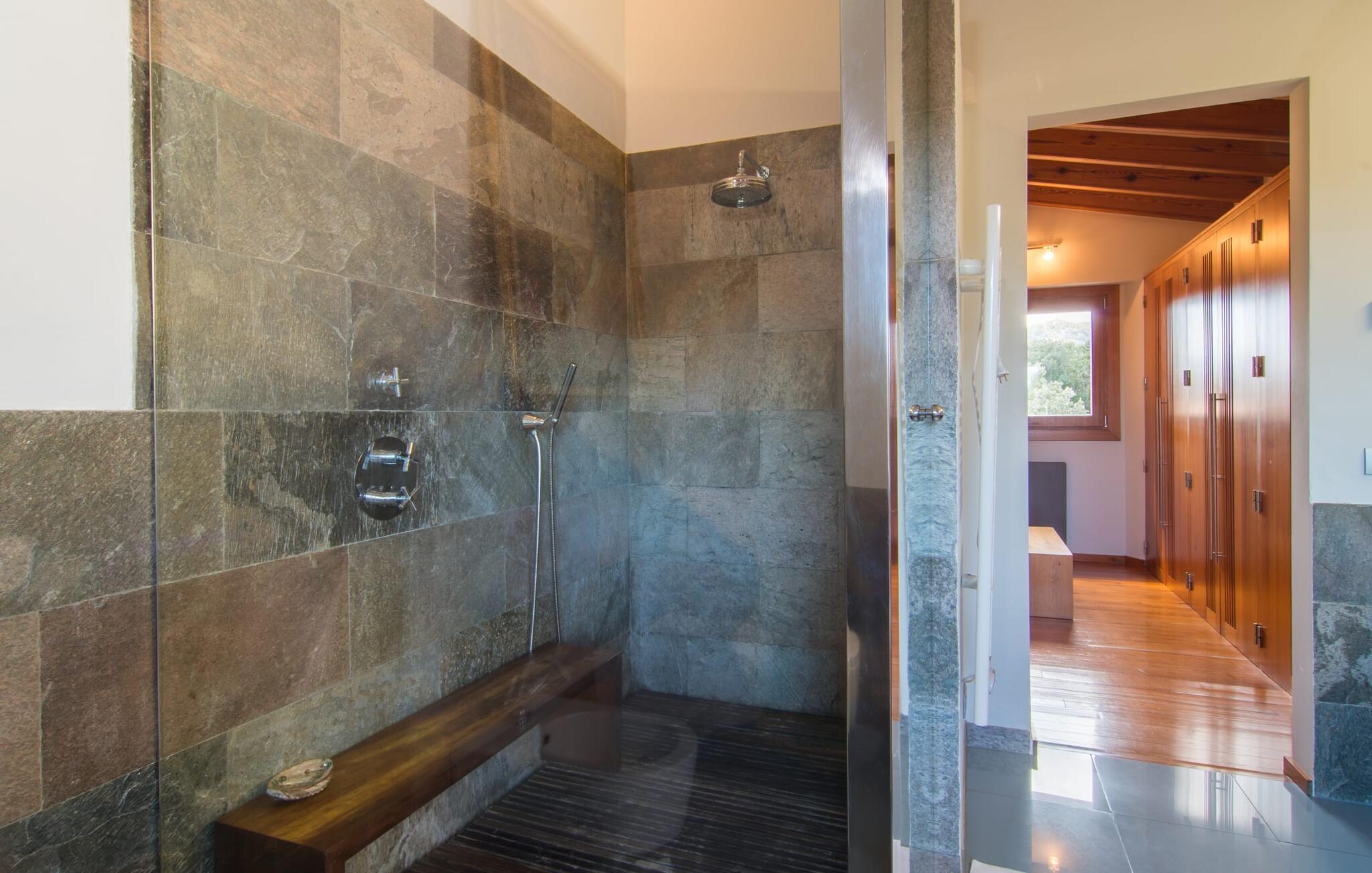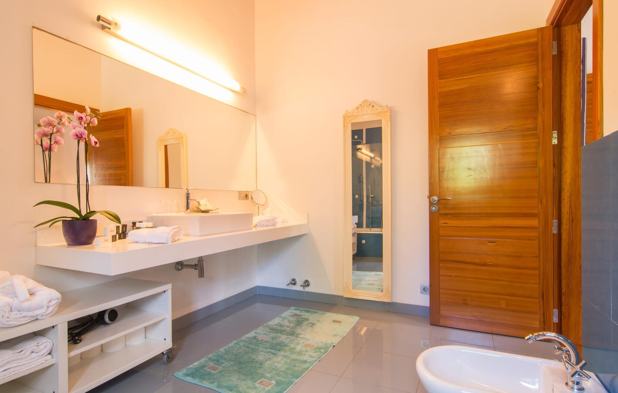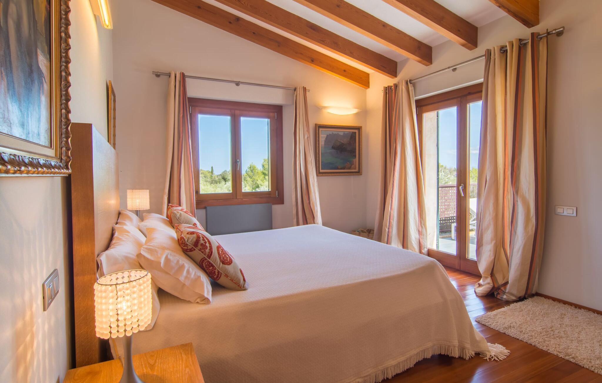Apropos Spannung: Auch im Inneren der Villa gibt es einiges zu entdecken. Da hat jemand wirklich sein Gespür für Design und Flair bewiesen. Das gesamte Gebäude ist dank der riesigen Fensterfronten lichtdurchflutet und vom Wohnzimmer über den Essbereich bis zur Küche stilvoll eingerichtet. Eine dezente Farbpalette und schicke Designermöbel verleihen dem Interieur des Hauses einen ganz eigenen Charakter. Und die Ausstattung passt mehr als zum Design: eine hochwertige Küche, in der Träume wahr werden können, mit einer zentralen Insel und einer ganzen Reihe elektrischer Annehmlichkeiten; ein Wohnzimmer mit Flachbildfernseher und gemütlichem Kamin für ruhige Abende. Auch in den Schlafzimmern der Villa, die jeweils über ein stilvolles Bad en Suite verfügen, fehlt es in dieser Hinsicht nicht. Der Stil ist in jedem Raum spürbar. Darüber hinaus gibt es für Kunstliebhaber ein besonderes Highlight: Neben der Sammlung von Kunstwerken an vielen Wänden der Villa gibt es auch eine nette kleine Kunstecke mit einer exquisiten Auswahl an verschiedenen Gemälden und Stilen. Warum nicht vorher noch einen edlen Wein aus der riesigen Sammlung im selben Raum erwerben? Dann werden wissenschaftliche Diskussionen über Farben und Epochen umso freier geführt.
