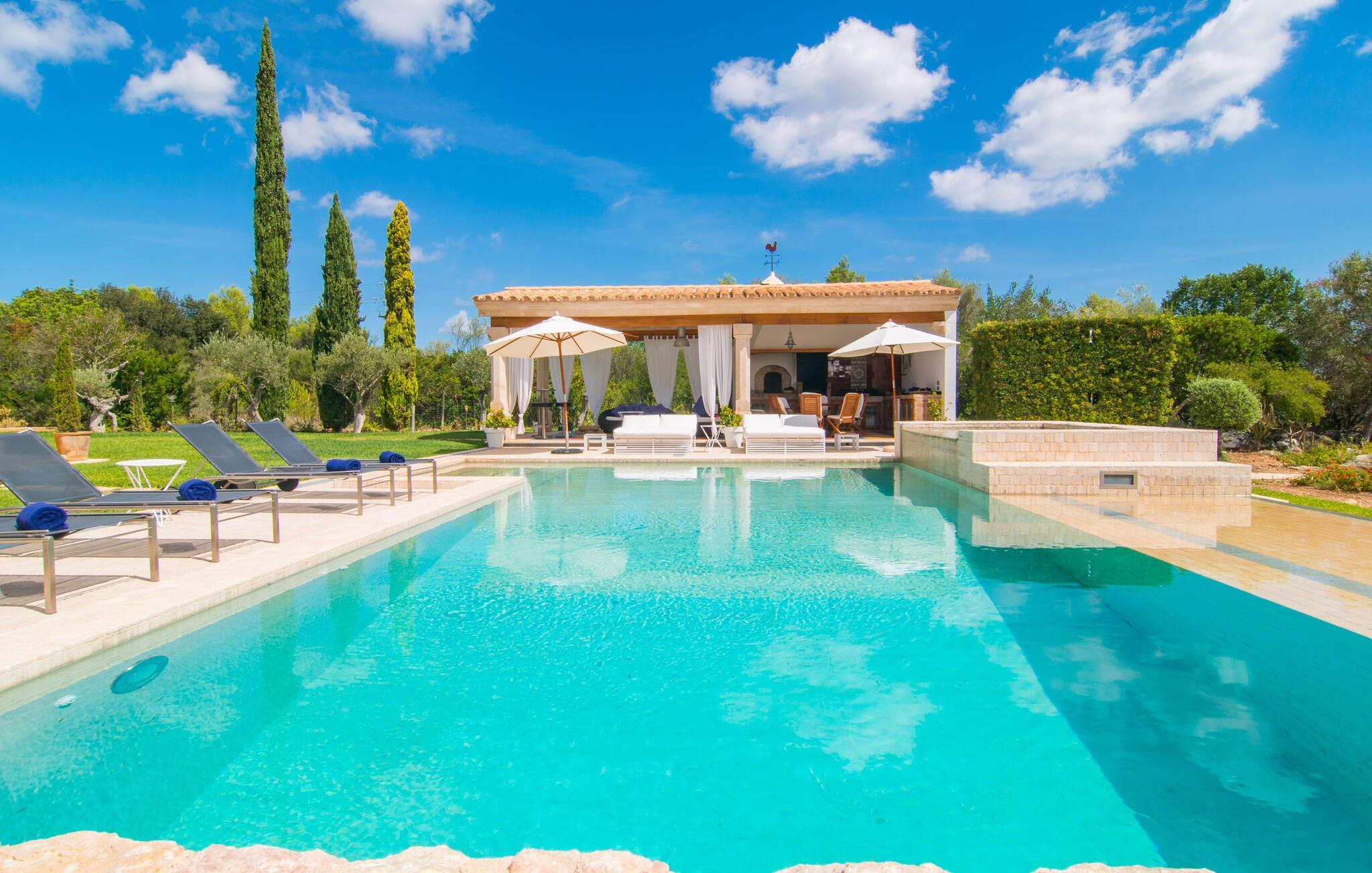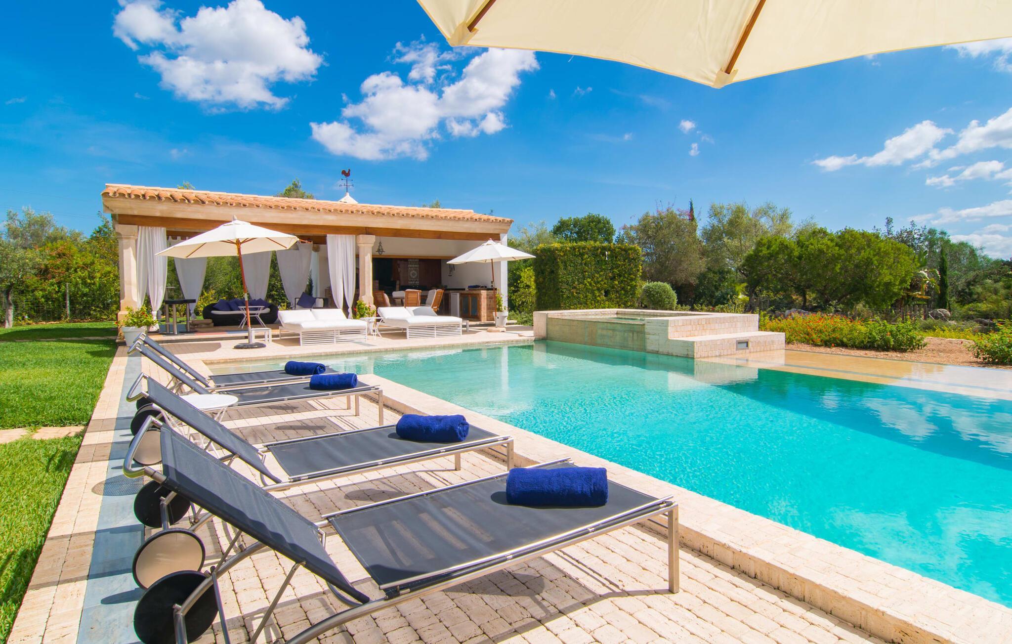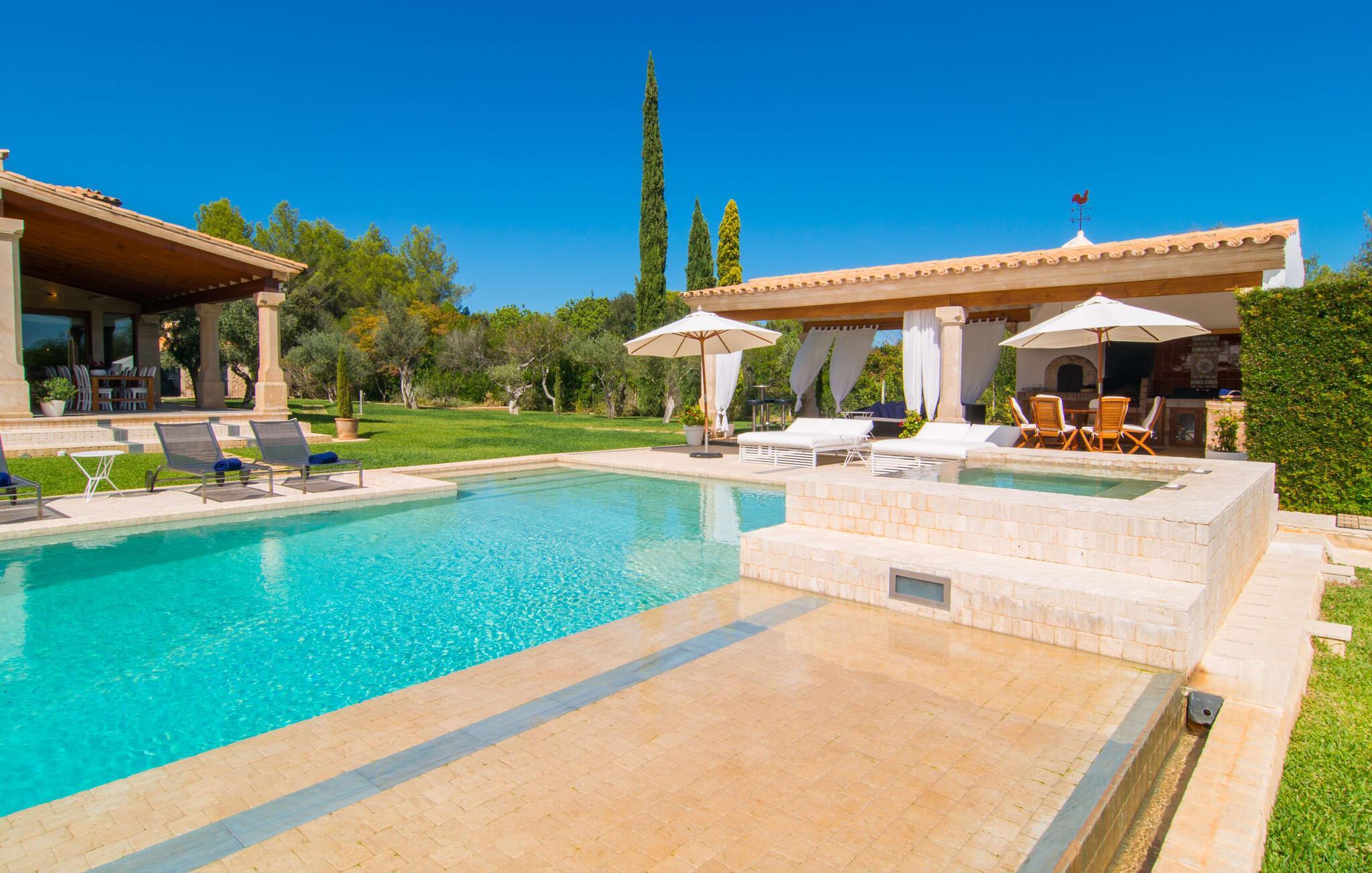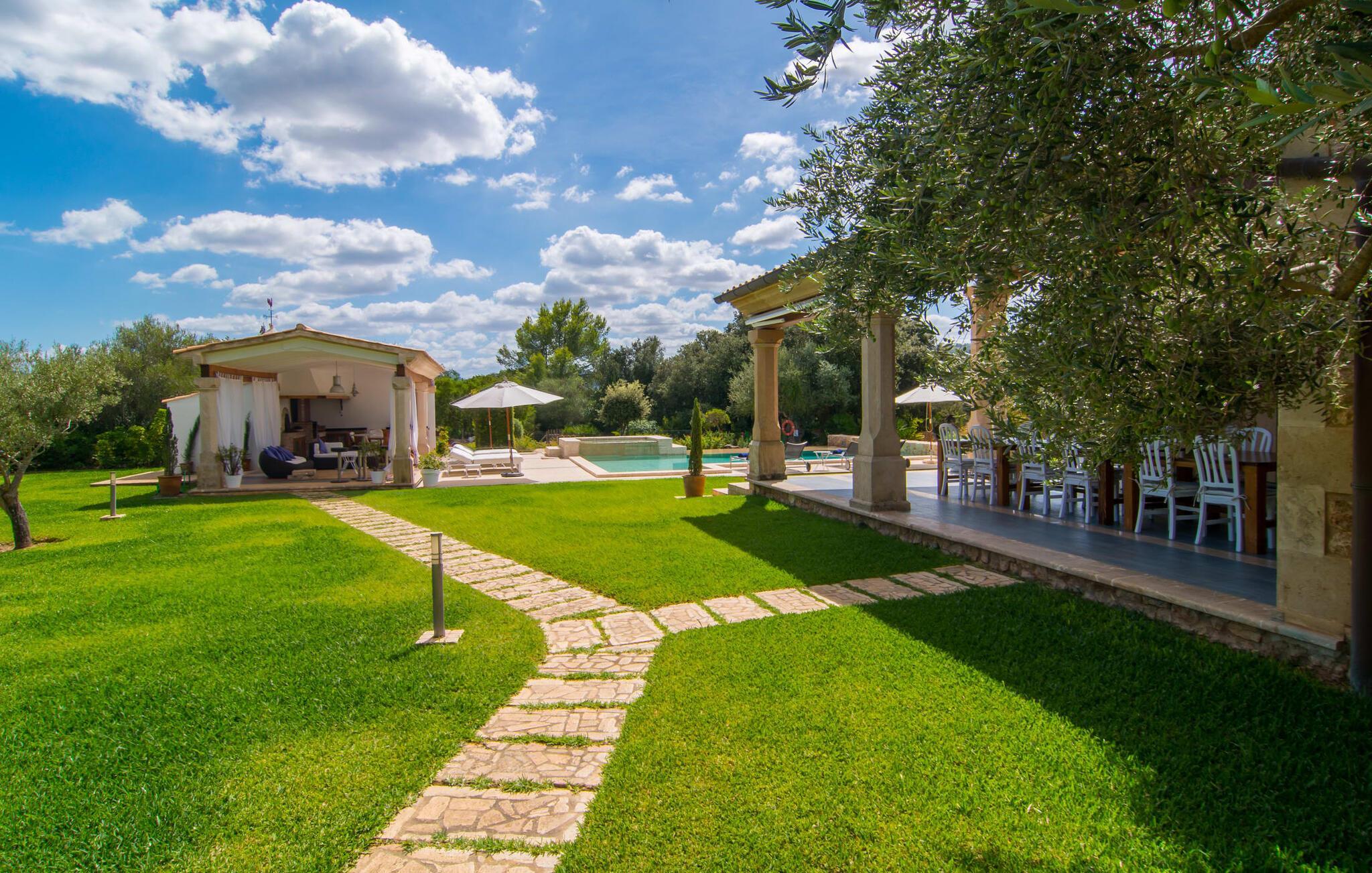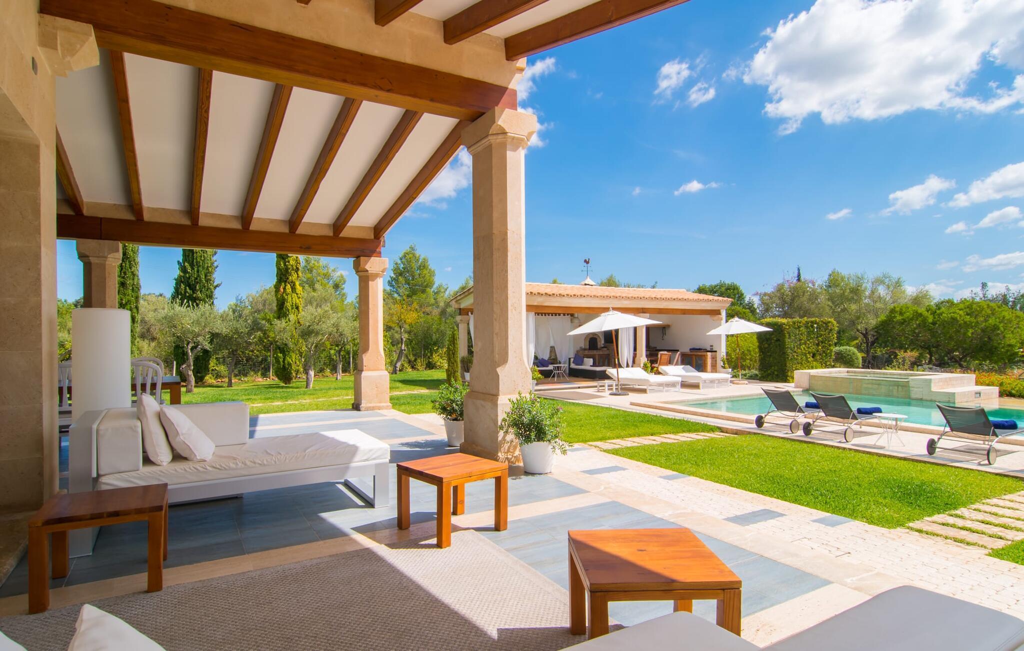 Dieses äußerst moderne Anwesen aus typisch mallorquinischem Sandstein liegt auf einem fantastischen Anwesen in absolut ruhiger Lage. Sobald Sie ankommen, werden Sie vom besonderen Charakter und der Lage der Villa „Golf Marina“ begrüßt – inmitten eines riesigen Gartenbereichs – mit modernem Design und wunderbarem Geschmack in Hülle und Fülle. Der Außenbereich ist wirklich unglaublich! Die große Sonnenterrasse erstreckt sich von der Rückseite des Hauses und der große Pool mit integriertem Whirlpool ist nur ein paar Schritte weiter. Es ist der perfekte Ort für ein schönes langes Bad. Ein Highlight des Anwesens ist sicherlich die große offene Außenküche, die sich für die Ausrichtung echter Grillfeste eignet. Inklusive mehrerer Arbeitsplatten, einer Spüle und einem fantastisch großen Grill – ganz im Einklang mit dem rustikalen Design – lässt dies das Herz jedes Grillliebhabers höher schlagen. Sie speisen entweder direkt neben dem Grill oder ganz stilvoll auf der Terrasse des Hauptgebäudes, die über einen geschmackvoll gestalteten Essbereich im Schatten verfügt. Um das Ganze abzurunden, hat der Garten auch etwas Spannendes für die Kleinen zu bieten: einen magischen Teich voller Fische und Frösche, der sie mit Sicherheit ins Staunen versetzen wird.