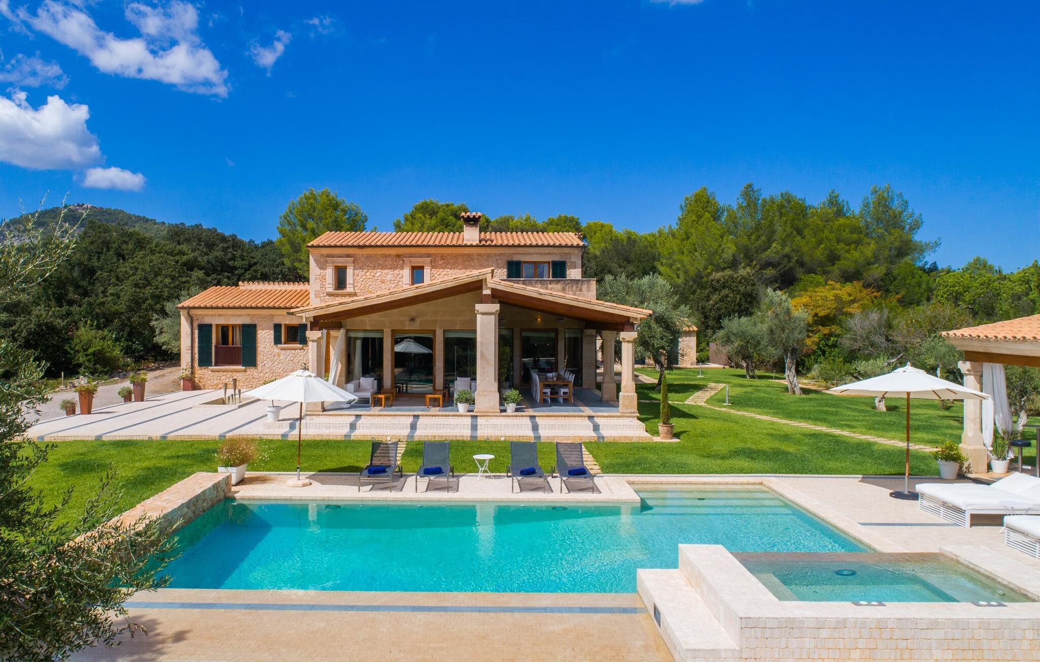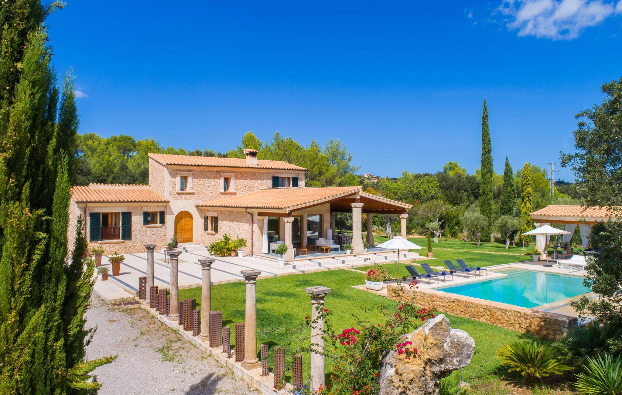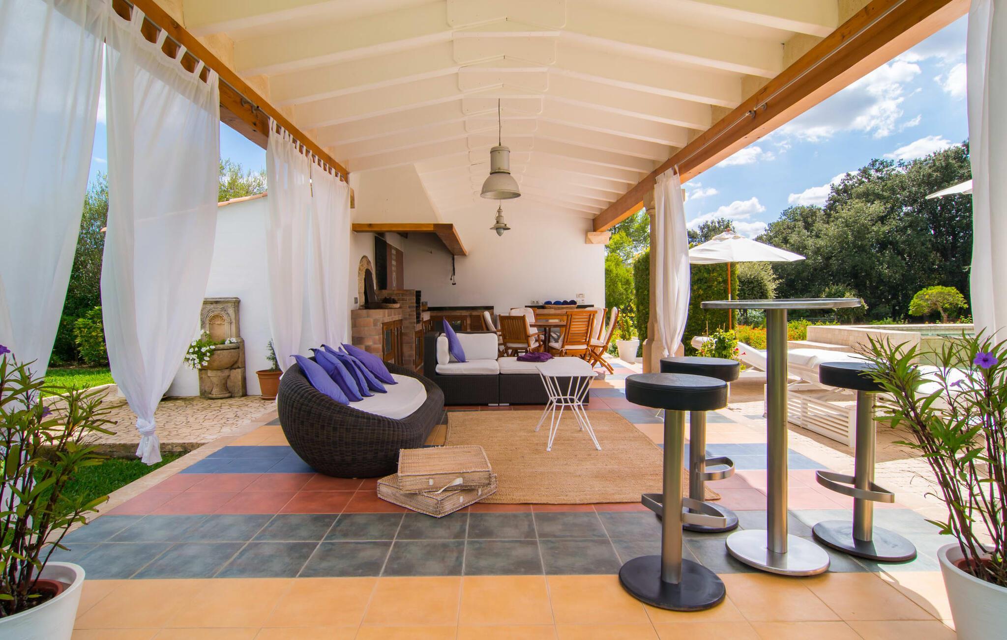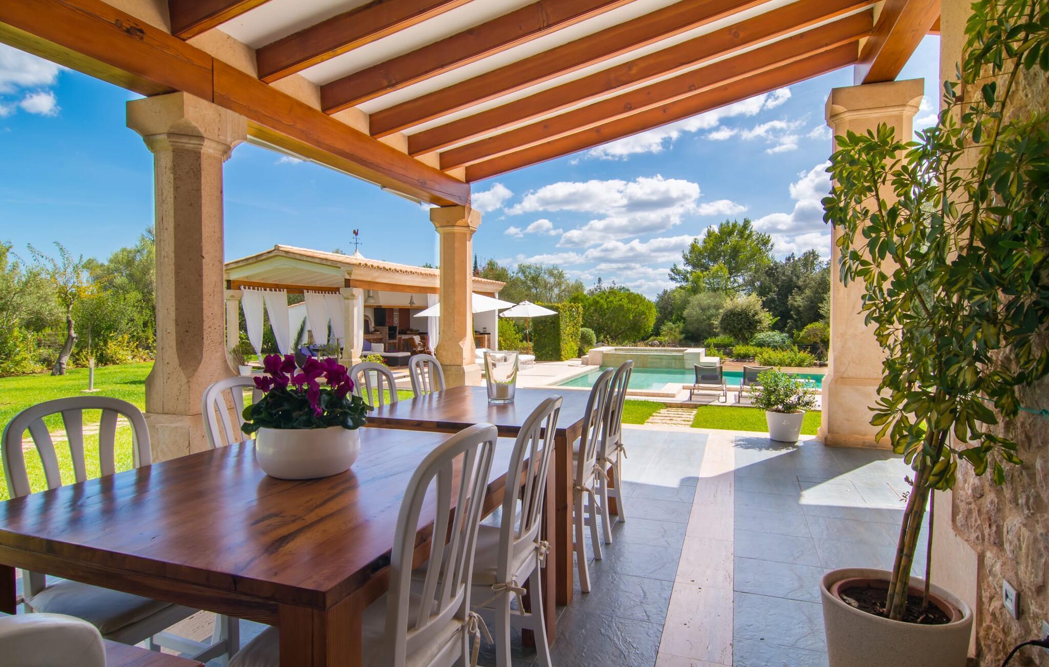 Dieses äußerst moderne Anwesen aus typisch mallorquinischem Sandstein liegt auf einem fantastischen Anwesen in absolut ruhiger Lage. Sobald Sie ankommen, werden Sie vom besonderen Charakter und der Lage der Villa „Golf Marina“ begrüßt – inmitten eines riesigen Gartenbereichs – mit modernem Design und wunderbarem Geschmack in Hülle und Fülle. Der Außenbereich ist wirklich unglaublich! Die große Sonnenterrasse erstreckt sich von der Rückseite des Hauses und der große Pool mit integriertem Whirlpool ist nur ein paar Schritte weiter. Es ist der perfekte Ort für ein schönes langes Bad. Ein Highlight des Anwesens ist sicherlich die große offene Außenküche, die sich für die Ausrichtung echter Grillfeste eignet. Inklusive mehrerer Arbeitsplatten, einer Spüle und einem fantastisch großen Grill – ganz im Einklang mit dem rustikalen Design – lässt dies das Herz jedes Grillliebhabers höher schlagen. Sie speisen entweder direkt neben dem Grill oder ganz stilvoll auf der Terrasse des Hauptgebäudes, die über einen geschmackvoll gestalteten Essbereich im Schatten verfügt. Um das Ganze abzurunden, hat der Garten auch etwas Spannendes für die Kleinen zu bieten: einen magischen Teich voller Fische und Frösche, der sie mit Sicherheit ins Staunen versetzen wird.