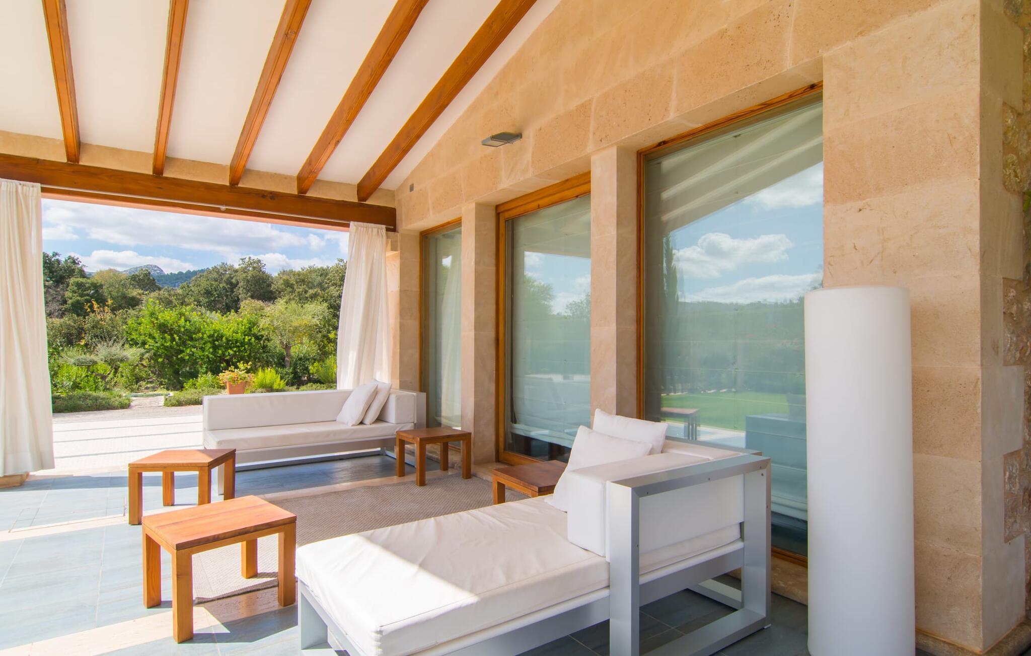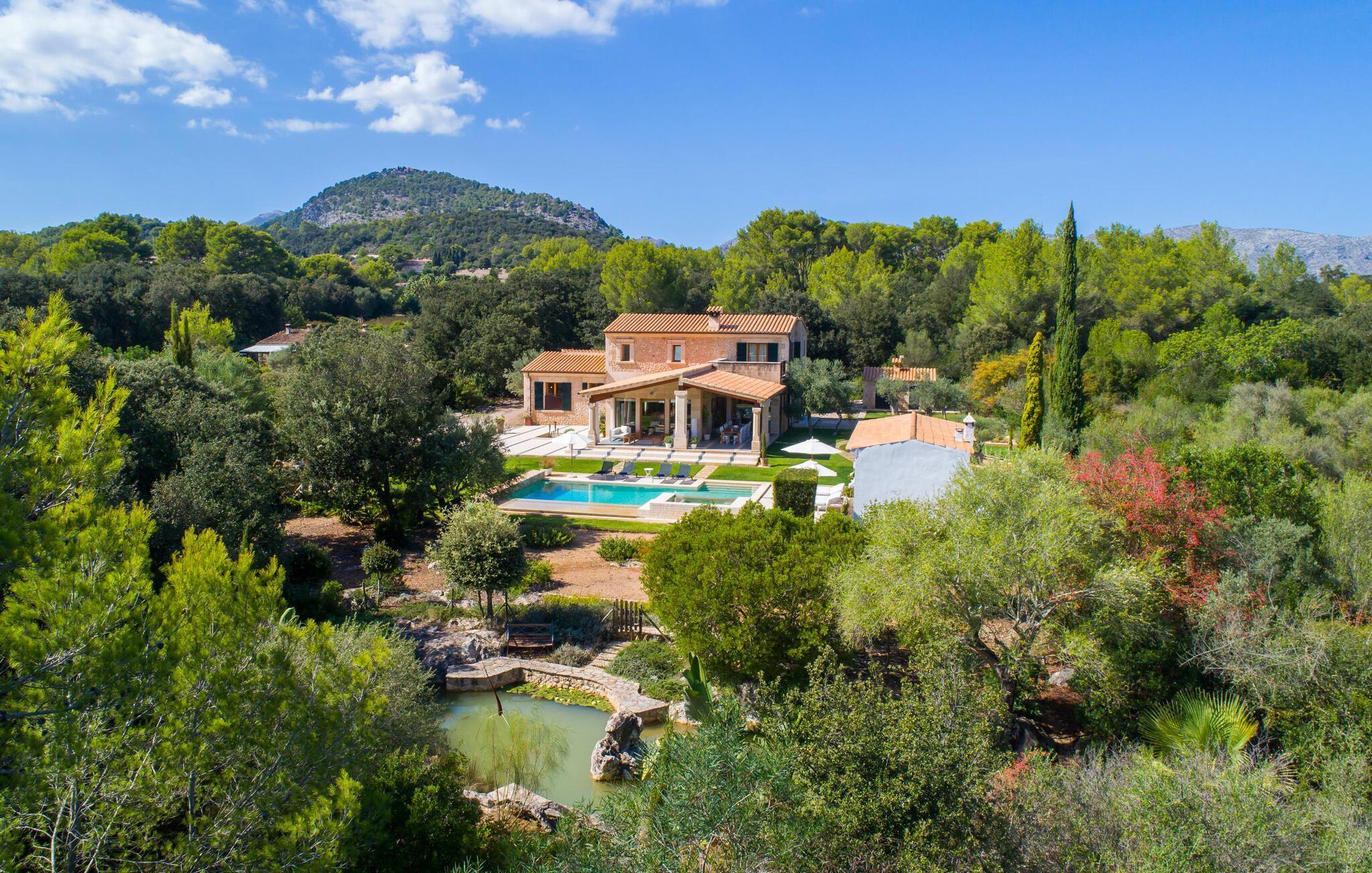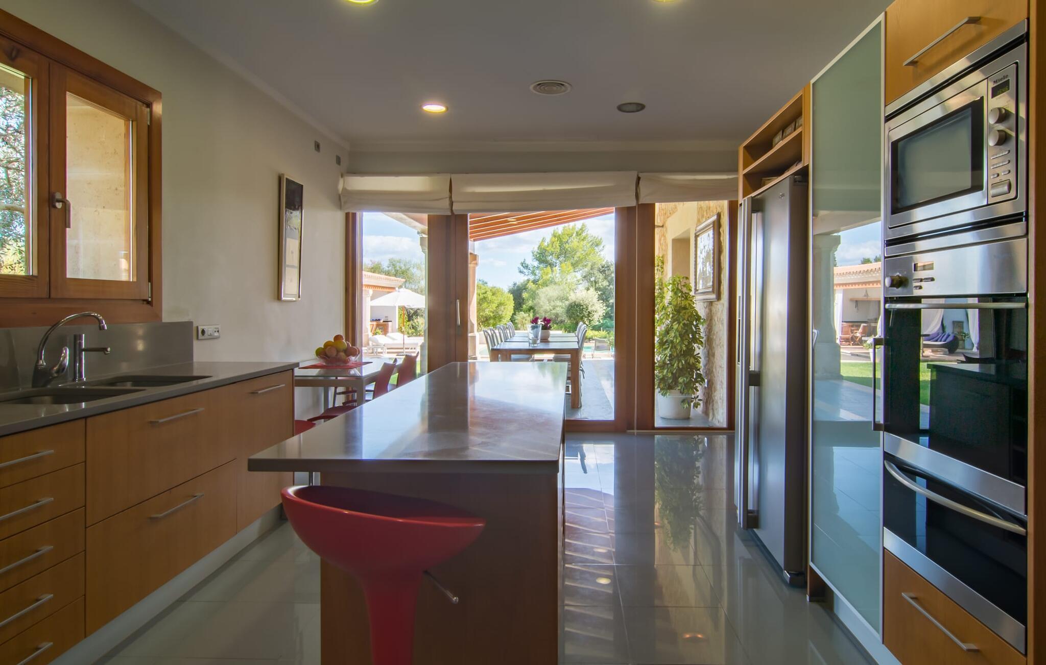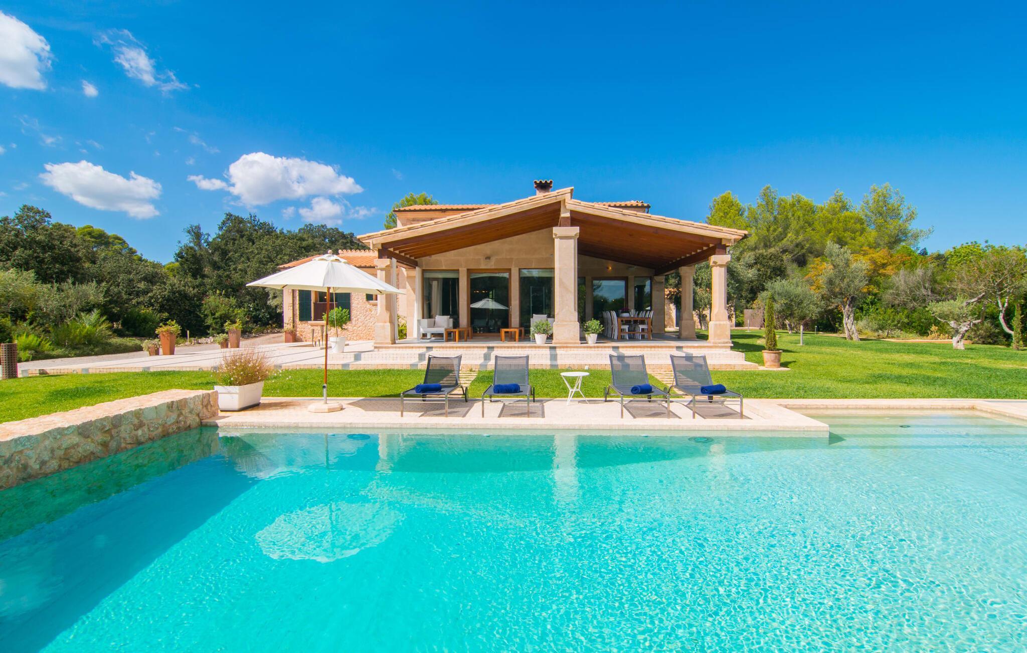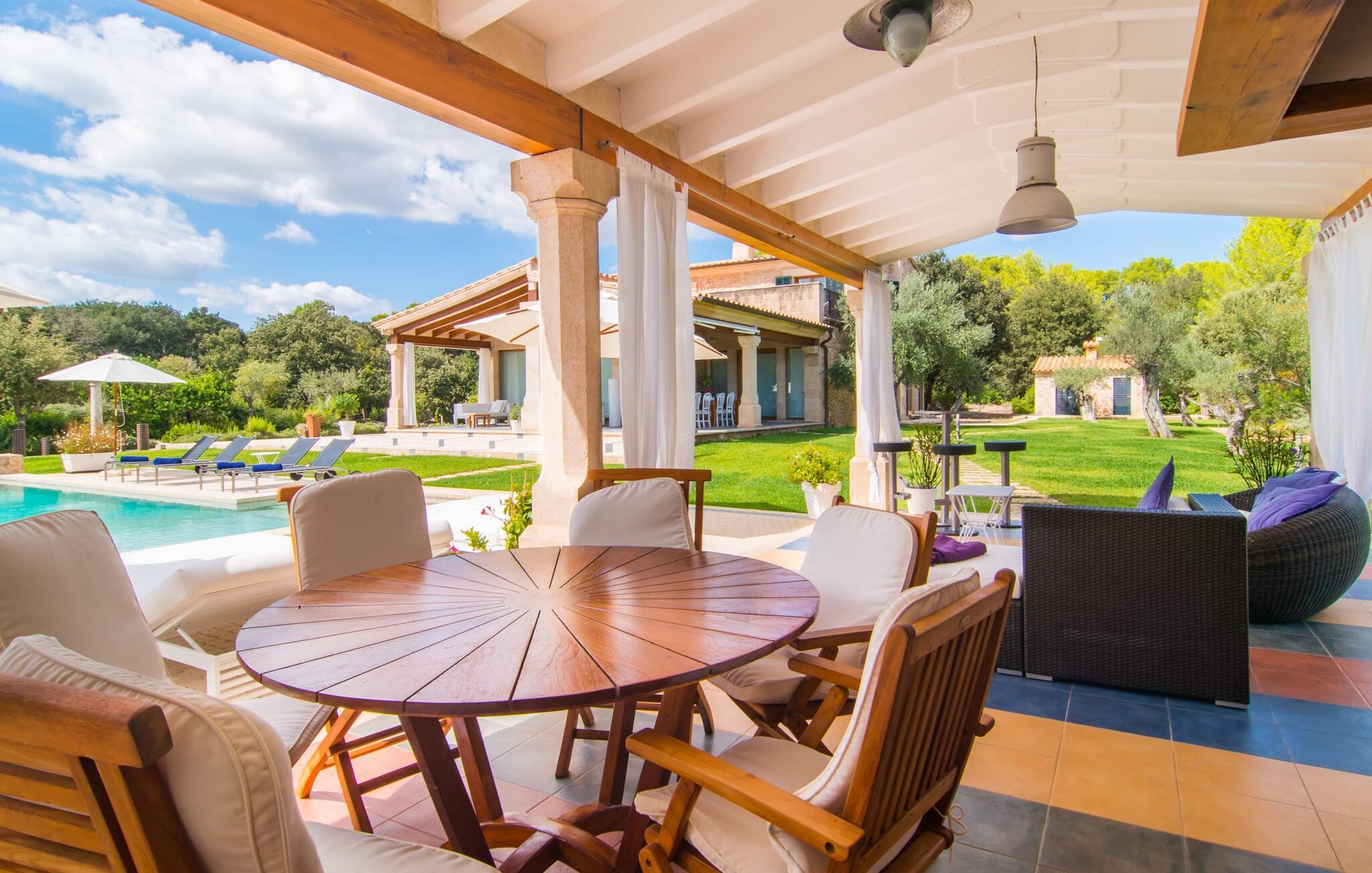 Dieses äußerst moderne Anwesen aus typisch mallorquinischem Sandstein liegt auf einem fantastischen Anwesen in absolut ruhiger Lage. Sobald Sie ankommen, werden Sie vom besonderen Charakter und der Lage der Villa „Golf Marina“ begrüßt – inmitten eines riesigen Gartenbereichs – mit modernem Design und wunderbarem Geschmack in Hülle und Fülle. Der Außenbereich ist wirklich unglaublich! Die große Sonnenterrasse erstreckt sich von der Rückseite des Hauses und der große Pool mit integriertem Whirlpool ist nur ein paar Schritte weiter. Es ist der perfekte Ort für ein schönes langes Bad. Ein Highlight des Anwesens ist sicherlich die große offene Außenküche, die sich für die Ausrichtung echter Grillfeste eignet. Inklusive mehrerer Arbeitsplatten, einer Spüle und einem fantastisch großen Grill – ganz im Einklang mit dem rustikalen Design – lässt dies das Herz jedes Grillliebhabers höher schlagen. Sie speisen entweder direkt neben dem Grill oder ganz stilvoll auf der Terrasse des Hauptgebäudes, die über einen geschmackvoll gestalteten Essbereich im Schatten verfügt. Um das Ganze abzurunden, hat der Garten auch etwas Spannendes für die Kleinen zu bieten: einen magischen Teich voller Fische und Frösche, der sie mit Sicherheit ins Staunen versetzen wird.