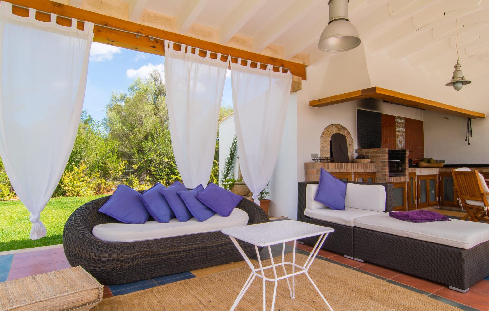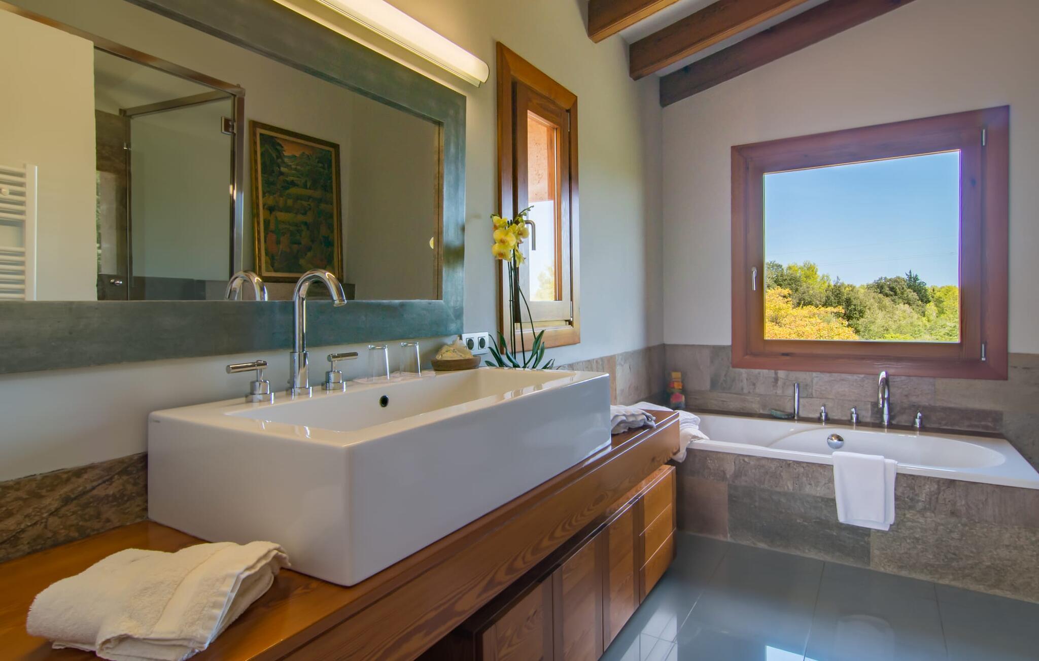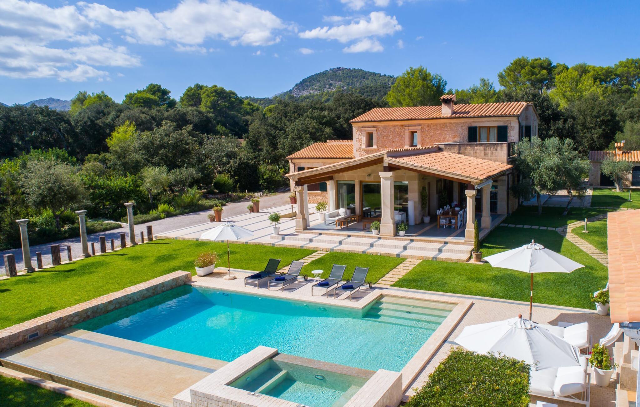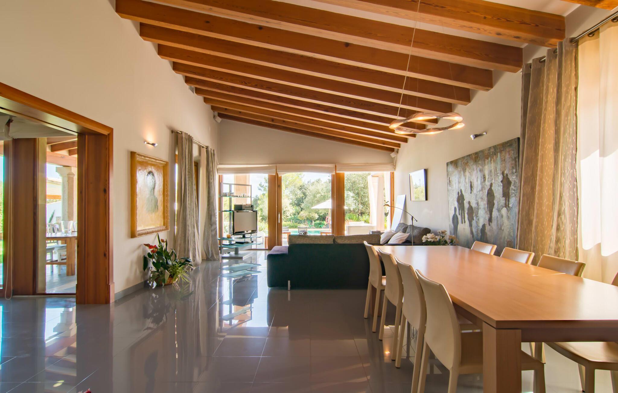 Dieses äußerst moderne Anwesen aus typisch mallorquinischem Sandstein liegt auf einem fantastischen Anwesen in absolut ruhiger Lage. Sobald Sie ankommen, werden Sie vom besonderen Charakter und der Lage der Villa „Golf Marina“ begrüßt – inmitten eines riesigen Gartenbereichs – mit modernem Design und wunderbarem Geschmack in Hülle und Fülle. Der Außenbereich ist wirklich unglaublich! Die große Sonnenterrasse erstreckt sich von der Rückseite des Hauses und der große Pool mit integriertem Whirlpool ist nur ein paar Schritte weiter. Es ist der perfekte Ort für ein schönes langes Bad. Ein Highlight des Anwesens ist sicherlich die große offene Außenküche, die sich für die Ausrichtung echter Grillfeste eignet. Inklusive mehrerer Arbeitsplatten, einer Spüle und einem fantastisch großen Grill – ganz im Einklang mit dem rustikalen Design – lässt dies das Herz jedes Grillliebhabers höher schlagen. Sie speisen entweder direkt neben dem Grill oder ganz stilvoll auf der Terrasse des Hauptgebäudes, die über einen geschmackvoll gestalteten Essbereich im Schatten verfügt. Um das Ganze abzurunden, hat der Garten auch etwas Spannendes für die Kleinen zu bieten: einen magischen Teich voller Fische und Frösche, der sie mit Sicherheit ins Staunen versetzen wird.
