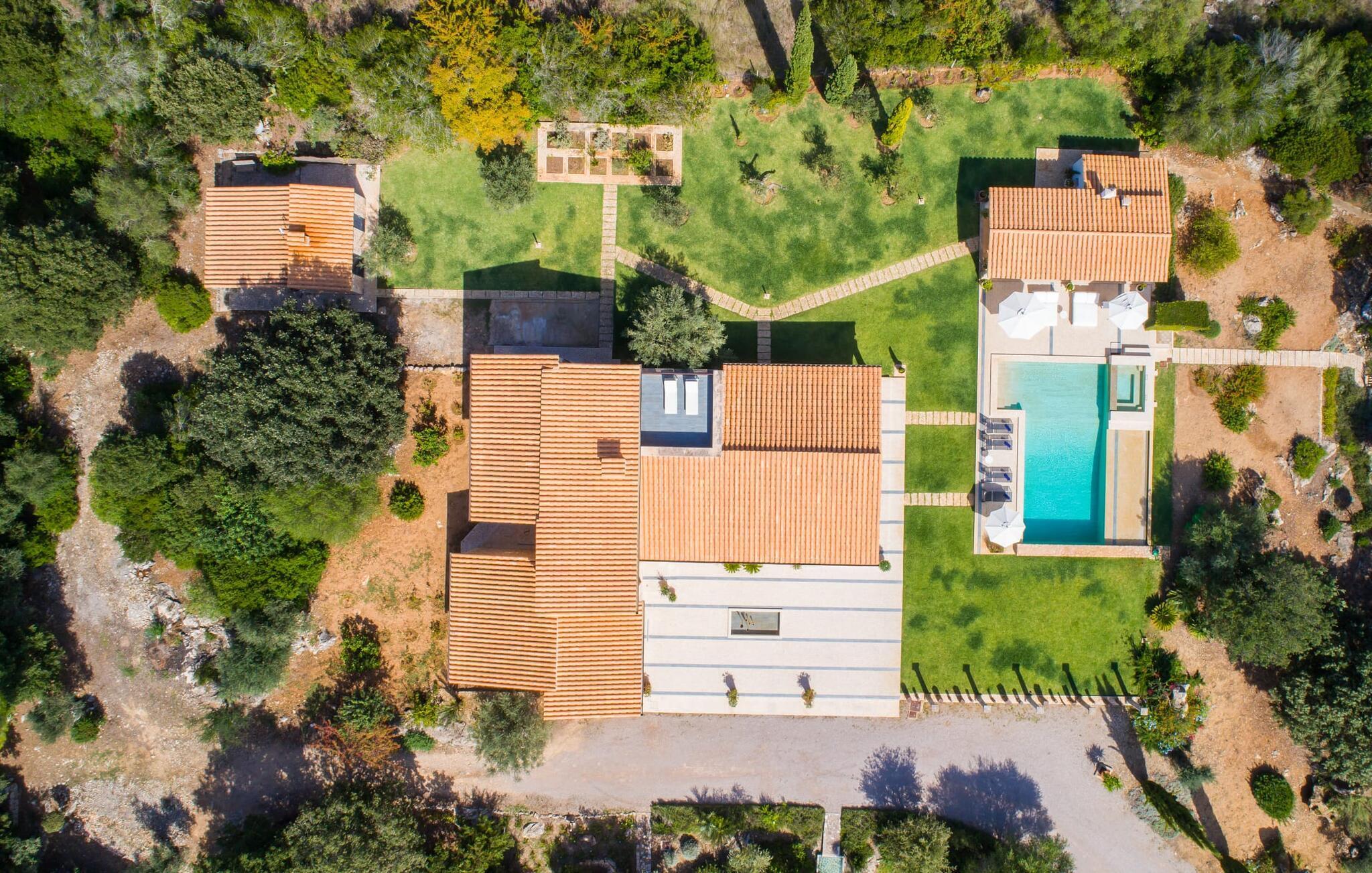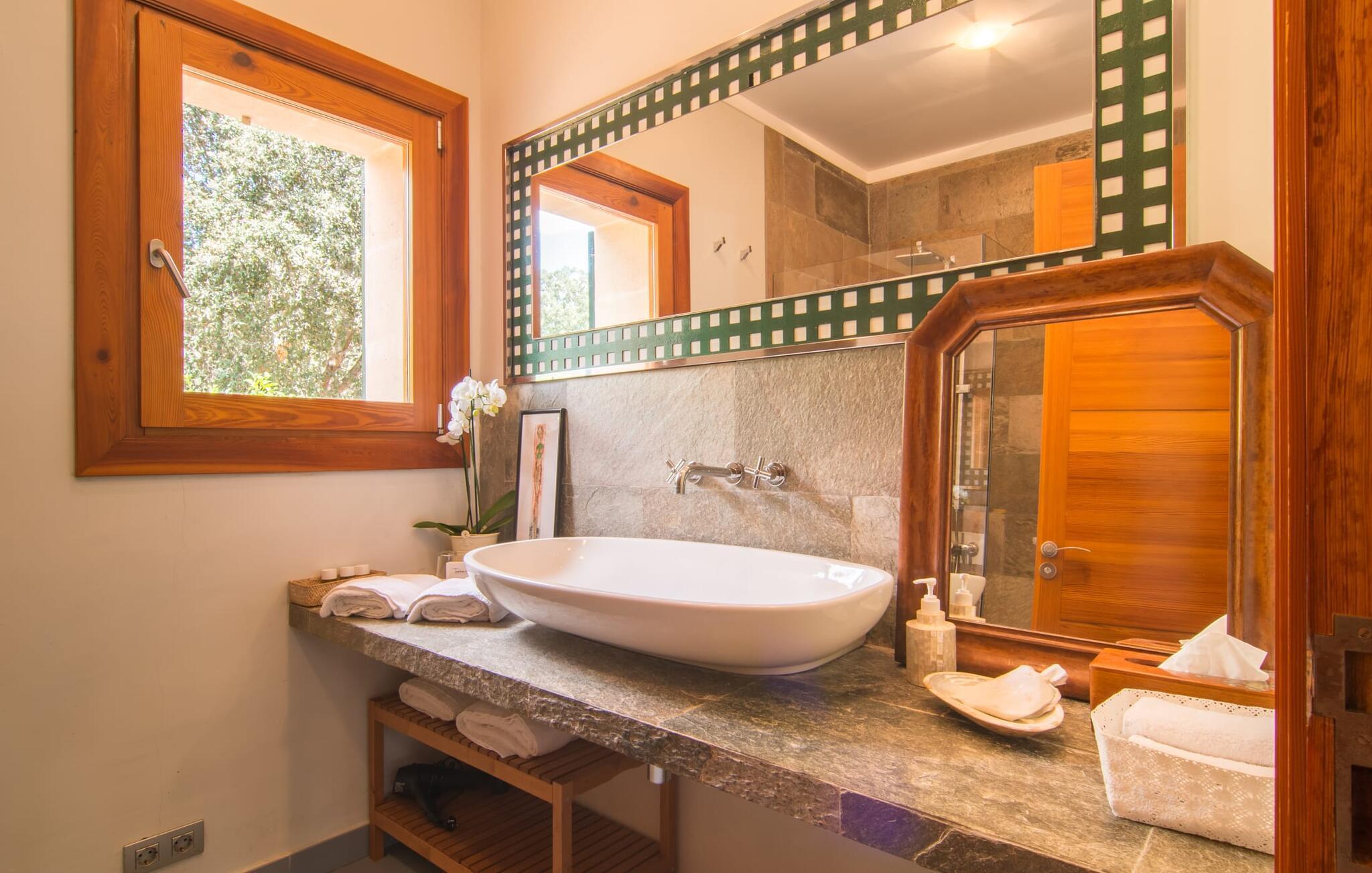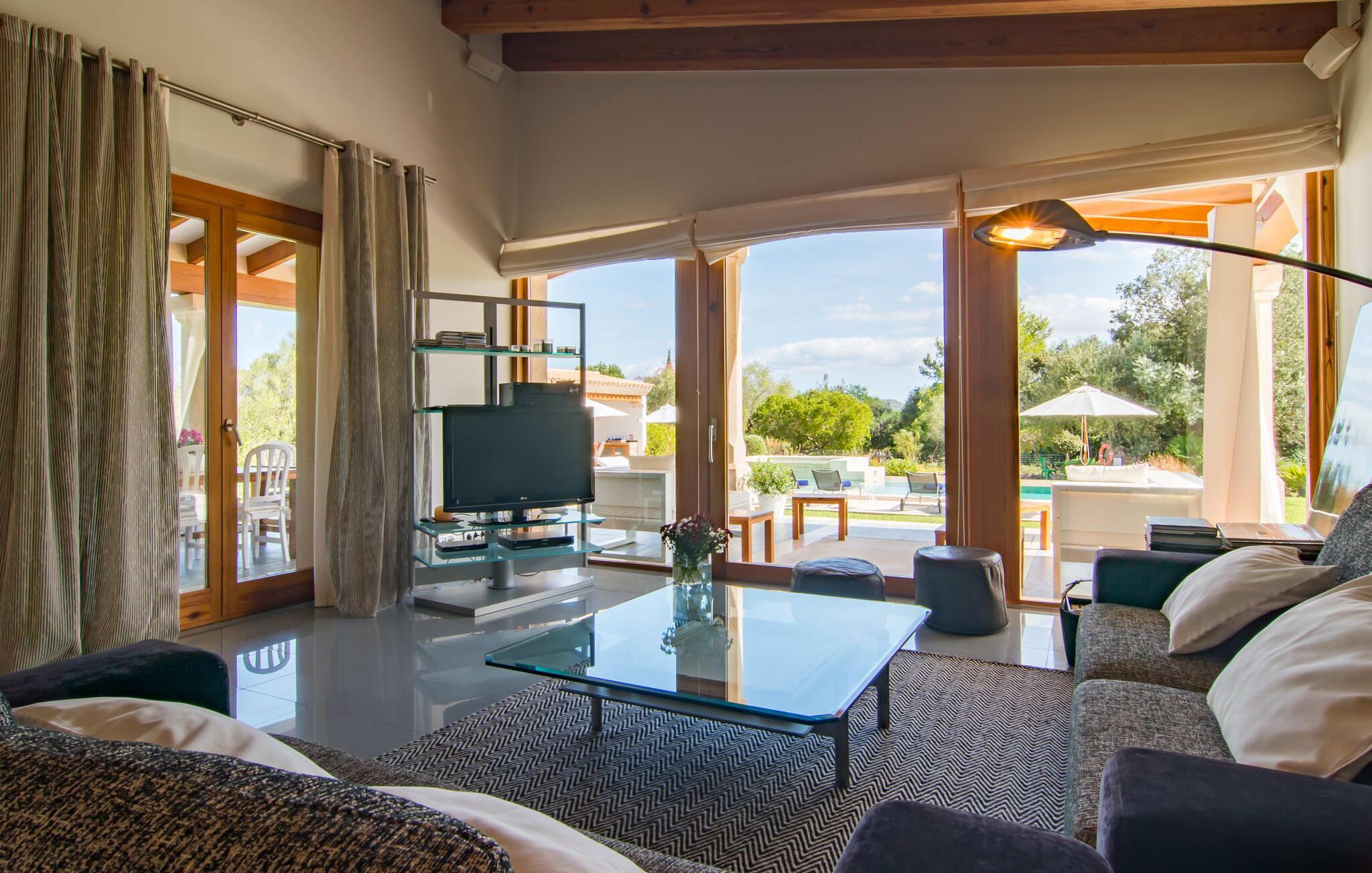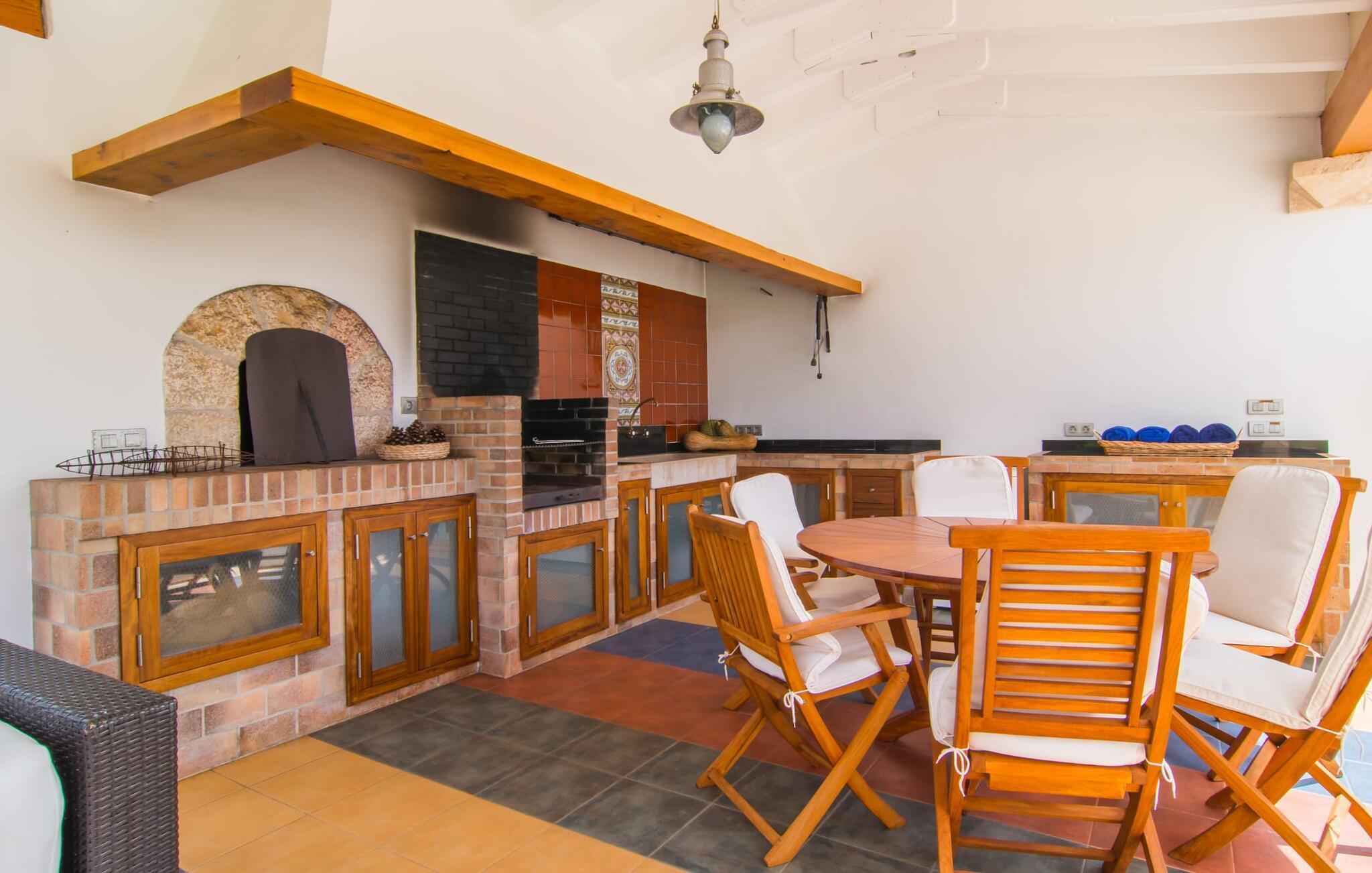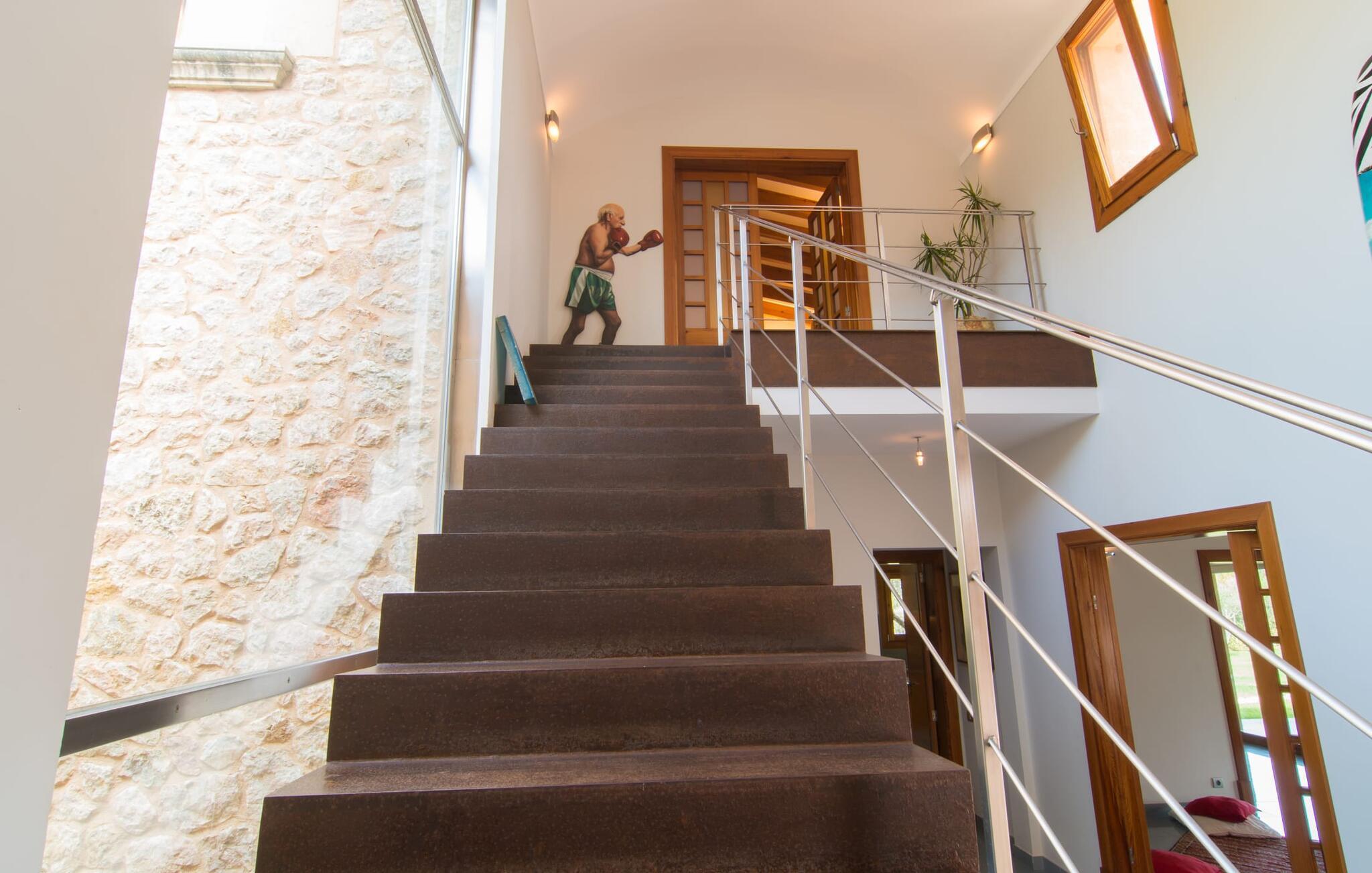 Dieses äußerst moderne Anwesen aus typisch mallorquinischem Sandstein liegt auf einem fantastischen Anwesen in absolut ruhiger Lage. Sobald Sie ankommen, werden Sie vom besonderen Charakter und der Lage der Villa „Golf Marina“ begrüßt – inmitten eines riesigen Gartenbereichs – mit modernem Design und wunderbarem Geschmack in Hülle und Fülle. Der Außenbereich ist wirklich unglaublich! Die große Sonnenterrasse erstreckt sich von der Rückseite des Hauses und der große Pool mit integriertem Whirlpool ist nur ein paar Schritte weiter. Es ist der perfekte Ort für ein schönes langes Bad. Ein Highlight des Anwesens ist sicherlich die große offene Außenküche, die sich für die Ausrichtung echter Grillfeste eignet. Inklusive mehrerer Arbeitsplatten, einer Spüle und einem fantastisch großen Grill – ganz im Einklang mit dem rustikalen Design – lässt dies das Herz jedes Grillliebhabers höher schlagen. Sie speisen entweder direkt neben dem Grill oder ganz stilvoll auf der Terrasse des Hauptgebäudes, die über einen geschmackvoll gestalteten Essbereich im Schatten verfügt. Um das Ganze abzurunden, hat der Garten auch etwas Spannendes für die Kleinen zu bieten: einen magischen Teich voller Fische und Frösche, der sie mit Sicherheit ins Staunen versetzen wird.
