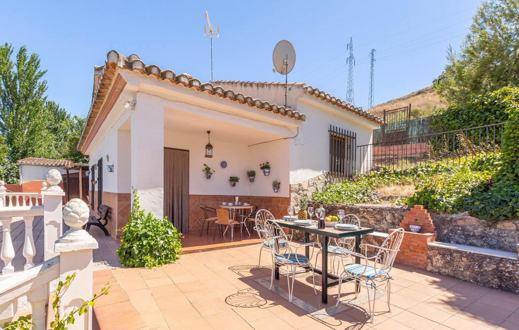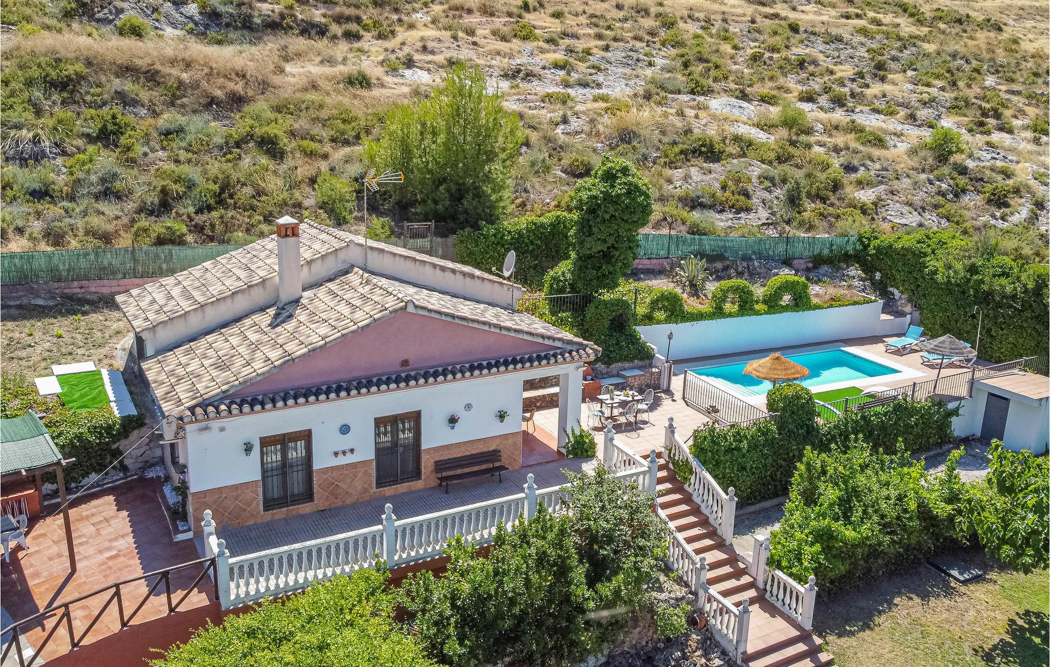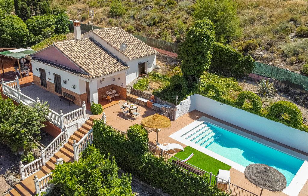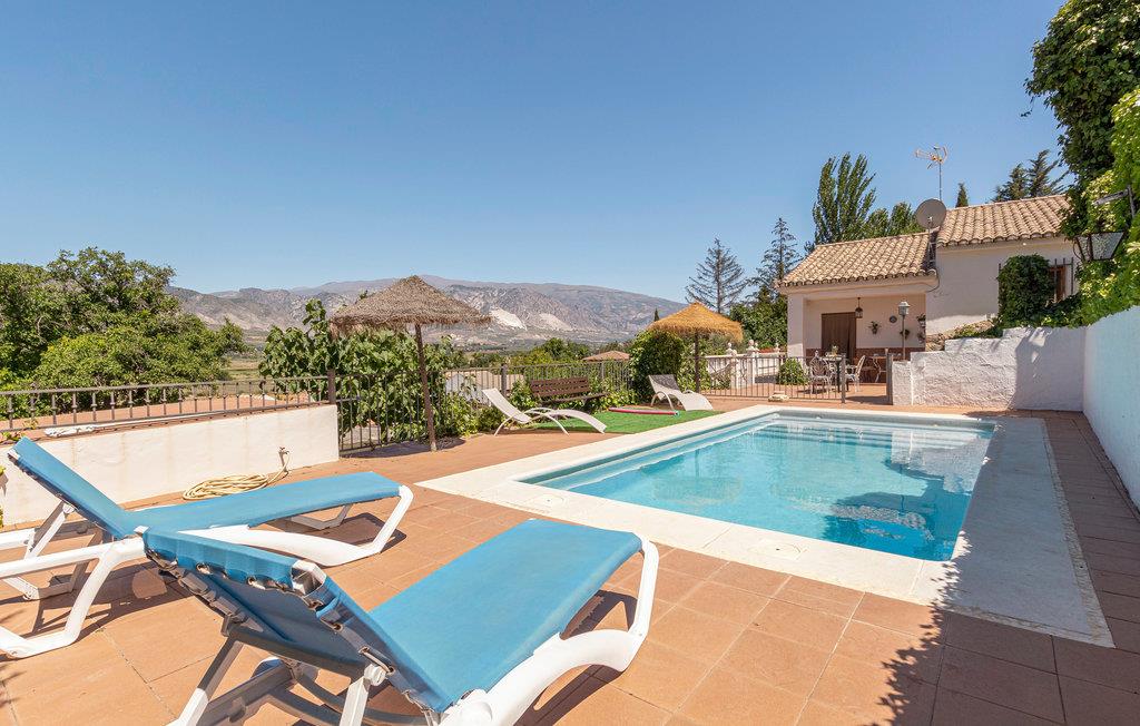 Gemütliches Ferienhaus mit Pool und Panoramablick auf die Berge.