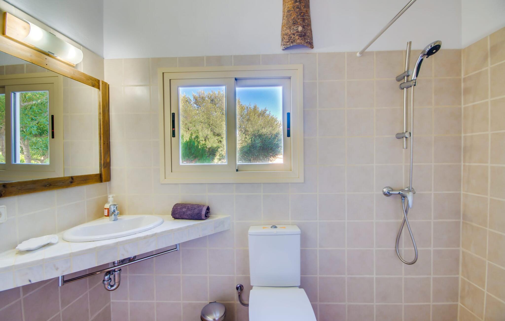Auch wenn das typisch milde mallorquinische Klima Lust darauf macht, die Tage draußen im schönen Garten zu verbringen, darf auch das Innere der renovierten Villa nicht zu kurz kommen. Das Innendesign ist eine spannende Mischung aus authentischen mallorquinischen Bauelementen und modernem Purismus. Die gestalterische Sanierung erfolgte akribisch, was erklärt, warum alles so gut zusammenpasst – denn das Gebäude hat sich „entwickelt“. Die bisher kleinen Räume wurden zu einem großen Raum erweitert, in dem sich der Wohnbereich an den schicken weißen Esstisch und die offene Küche anschließt. Dezente und überwiegend helle Möbel, Küchenschränke aus Stein und ein gemütlicher Kamin bilden den Mittelpunkt des Gemeinschaftsraums. Terrakotta-Bodenfliesen, sichtbare Steinwände, Holzbänke und helle Räume verleihen dem Gebäude seinen modernen Charakter. Zwischen den einzelnen Räumen finden Sie oft ein paar Stufen. Diese leicht unterschiedlichen Ebenen unterstreichen den individuellen Charakter des Innenraums. Sehr praktisch ist auch, dass an beide Schlafzimmer ein Badezimmer angrenzt. Beide Schlafzimmer haben eine angenehme Größe und viel Stauraum. Eines der Badezimmer ist modern und verfügt über eine ebenerdige Dusche. Das zweite Badezimmer ist Luxus pur. Hier wurden die unterschiedlichen Ebenen genutzt, um im oberen Teil der Treppe eine Designbadewanne zu platzieren. Das Badezimmer verfügt außerdem über eine große ebenerdige Dusche und zwei angrenzende Waschbecken. Das Badezimmer hat eine Tür, die Sie direkt aus dem Haus führt. Es ist aber auch von beiden Schlafzimmern aus zugänglich, so dass beide Schlafzimmer en suite sind. Auch die Inneneinrichtung dieser Villa ist absolut fantastisch. Dank der Heizung und des Kamins, die besonders im Winter nützlich sind, kann die Villa das ganze Jahr über gemietet werden. Ökologisch hat diese Finca die Nase vorn: Der gesamte Strom wird über Photovoltaik bezogen (die Anlage wurde 2018 neu installiert). Für den Notfall steht ein Generator zur Verfügung.