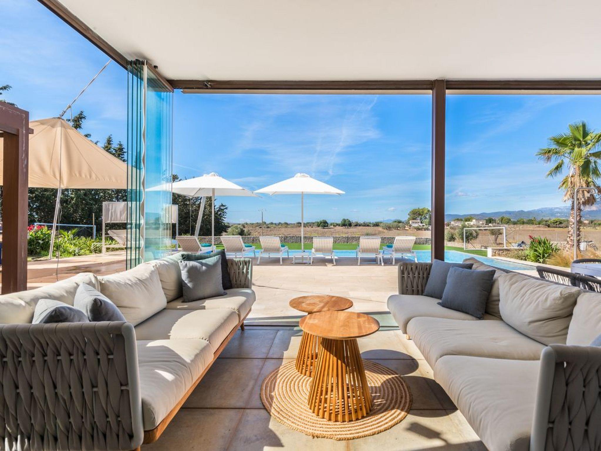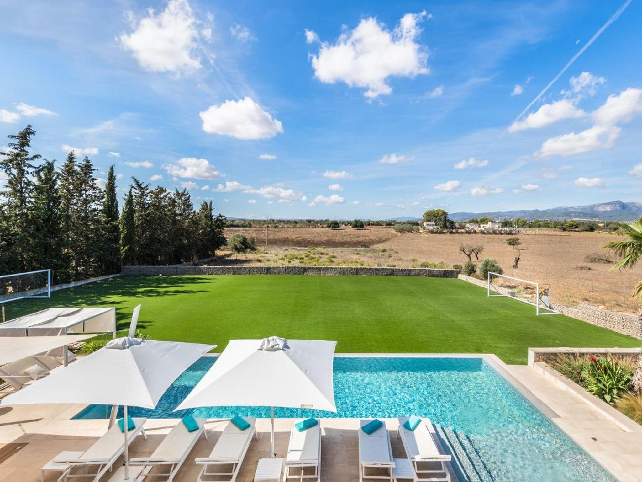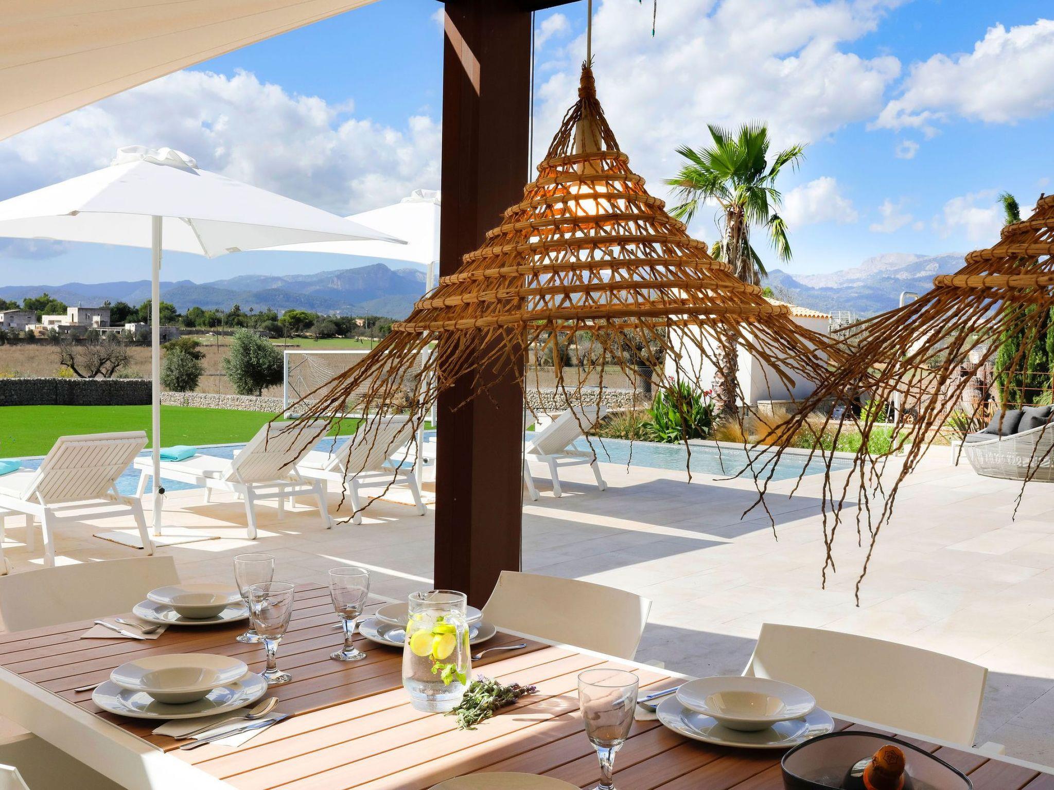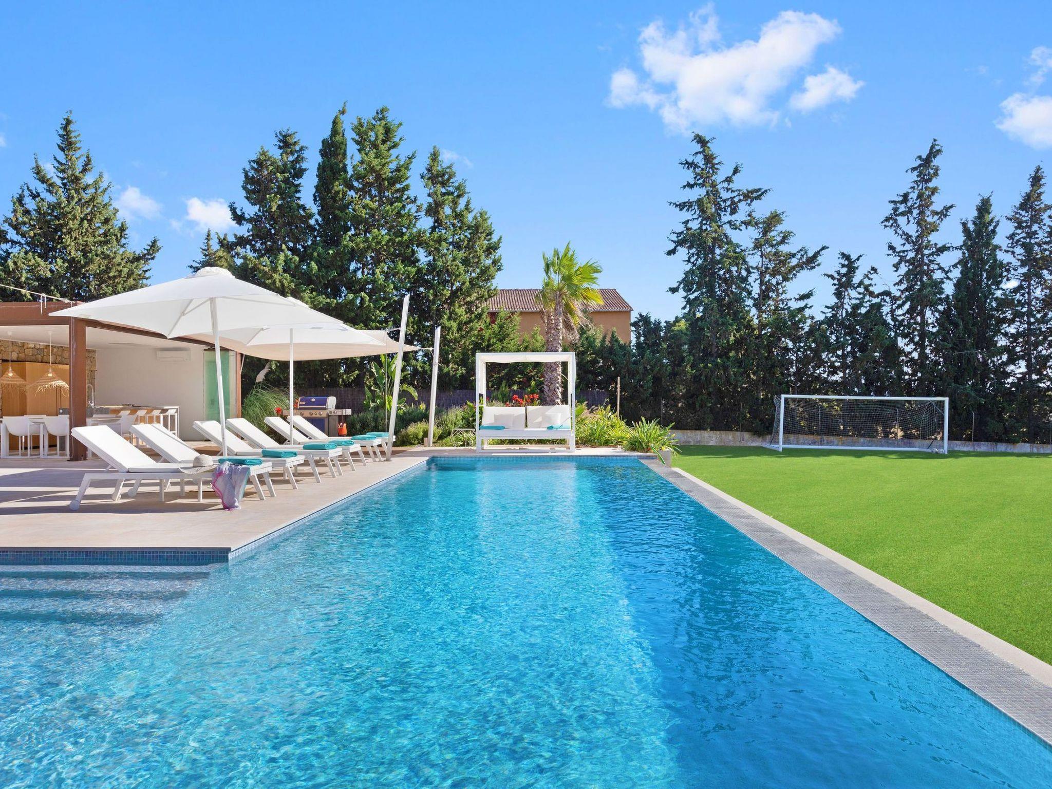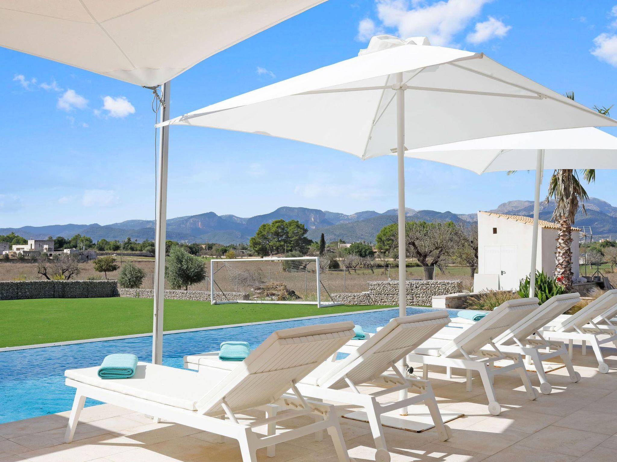 Im Außenbereich öffnet sich das Haus zu einer Welt der Freizeit und Entspannung. Die geräumige Terrasse lädt mit ihren luxuriösen Sonnenliegen, dem Chill-out-Bereich und dem Essbereich im Freien zum Genießen von Sonnentagen ein. Die Außenküche, die durch eine Bar und eine Grillbar ergänzt wird, verspricht unvergessliche Abende unter dem mallorquinischen Himmel. Der beheizte Swimmingpool und der Kinderfußballplatz sorgen für weitere Unterhaltung und Spaß während Ihres Aufenthalts.