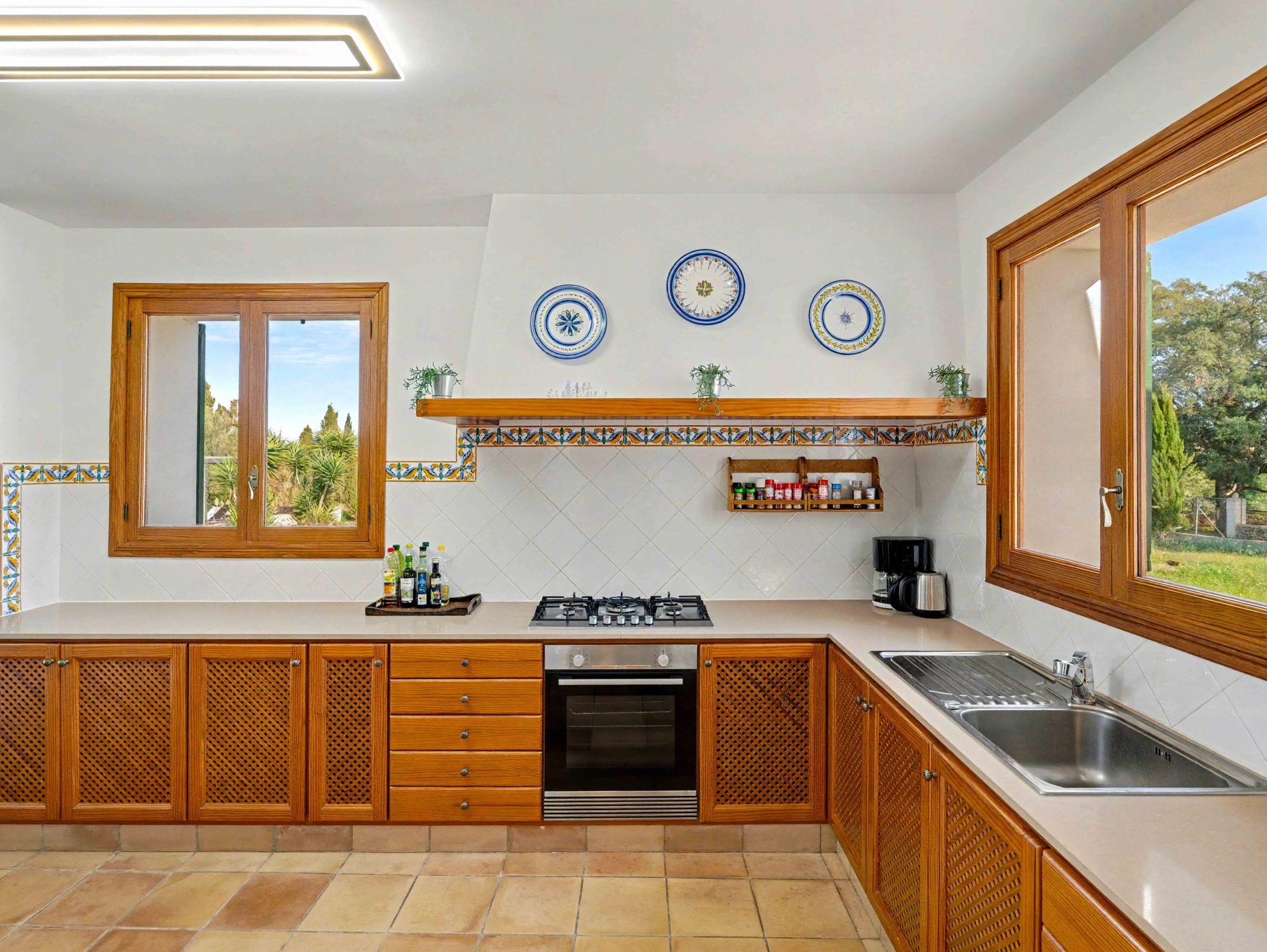 Die voll ausgestattete Küche im rustikalen Stil verbindet Tradition mit modernem Komfort. Es stehen drei individuell gestaltete Schlafzimmer mit Klimaanlage, zwei Badezimmer sowie ein Gäste-WC zur Verfügung.