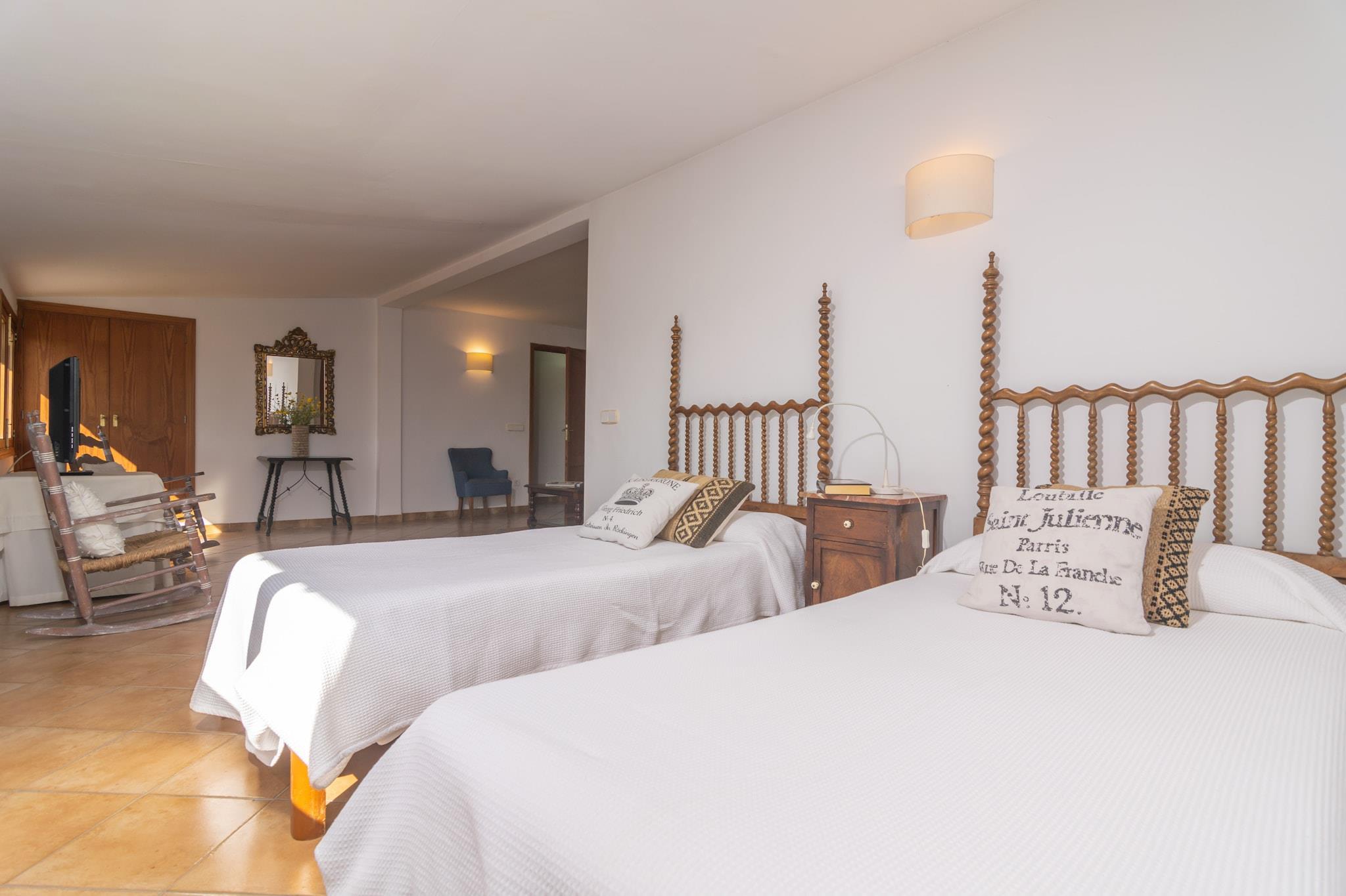 Der Garten des Landhauses lädt Sie ein die Seele baumeln zu lassen und abzuschalten. Obstbäume im Naturgarten, eine hübsch möblierte Veranda mit 2 Sonnenliegen, ein natürlicher Teich mit Fischen und ein Grill sorgen dafür, dass Sie das milde Klima in vollen Zügen genießen können. Das Grundstück ist eingezäunt und es gibt einige Nachbarn in der Umgebung. Esszimmer mit Klimaanlage, ideal, um gemeinsam zu essen und dann zu plaudern oder sich beim Fernsehen (Satellit) zu entspannen. Die Küche ist unabhängig und bietet einen Gasherd, einen Ofen und einen schönen mallorquinischen Stil, neben vielen anderen Dingen. Es gibt zwei Badezimmer mit Duschen auf dieser Etage, die dem ganzen Haus dienen, obwohl eines von ihnen sich draußen befindet und über die Garage zugänglich ist. Zum Ausruhen gibt es drei Schlafzimmer, zwei im Erdgeschoss mit Schränken, eines mit einem Doppelbett und das andere mit einem Einzelbett. Dann gibt es das dritte Schlafzimmer oben mit zwei Einzelbetten und einem Sitzbereich mit einem Fernseher (ohne Satellit). Auf der Terrasse gibt es eine Waschmaschine sowie ein Bügeleisen und ein Bügelbrett. Ein Kinderbett und ein Hochstuhl sind ebenfalls verfügbar. Die Kleinstadt Inca hat familiäres Flair und es werden alle Dienstleistungen angeboten die Sie für einen Urlaub in Eigenregie benötigen. Neben verschieden Supermärkten, Läden, Banken, Apotheken etc. gibt es eine Reihe guter Restaurants mit typischer Küche. Da die Stadt in der Inselmitte liegt können Sie jeden Punkt der Insel schnell und gut erreichen. Donnerstags findet der traditionelle Wochenmarkt statt und Sie haben die Möglichkeit Obst und Gemüse der Region zu kaufen. Der nächste Strand heißt Playa de Muro, lockt mit weißem, feinem Sand, klarem Wasser und ist ca. 27,3 km entfernt. Hinweis: Diese Unterkunft richtet sich an Familien und Gäste über 30 Jahre, die einen ruhigen Aufenthalt suchen. Buchungen für Partys oder Feiern werden nicht akzeptiert. Eine Kopie des Ausweisdokuments aller Gäste ist erforderlich, um die Reservierung zu bestätigen. Eventuelle Nebenkosten müssen beim Anbieter nachgefragt werden. Haustiere sind verboten. Partys oder ähnliche Veranstaltungen sind nicht gestattet. Es gibt Freiluftparkplätze für 3 Autos. Entfernungen Strand: 27.3 km - Platges de Muro Flughafen: 37.3 km - Son Sant Joan Golfplatz: 29.5 km - Golf Alcanada Ortsmitte: 1.3 km - Inca Bahnhof: 2.5 km - Inca Bushaltestelle: 2 km - Inca Fähre: 28.5 km - Puerto de Alcúdia Krankenhaus: 2.8 km - Hospital Comarcal d'Inca Touristen Lizenz: ETV/12466Einheitsregister: ESFCTU0000070110002977820000000000000000000ETV/124665Auf den Balearen gibt es eine Touristensteuer, die Ecotasa genannt wird. Diese Steuer muss vom Gast bezahlt werden. Der zu zahlende Betrag beträgt zwischen 0.55EURO pro Nacht und Gast in der Nebensaison und 2.2EURO pro Nacht und Gast in der Hochsaison. Ab dem 9. Tag reduziert sich die Steuer um die Hälfte. Personen unter 16 Jahren sind davon ausgenommen