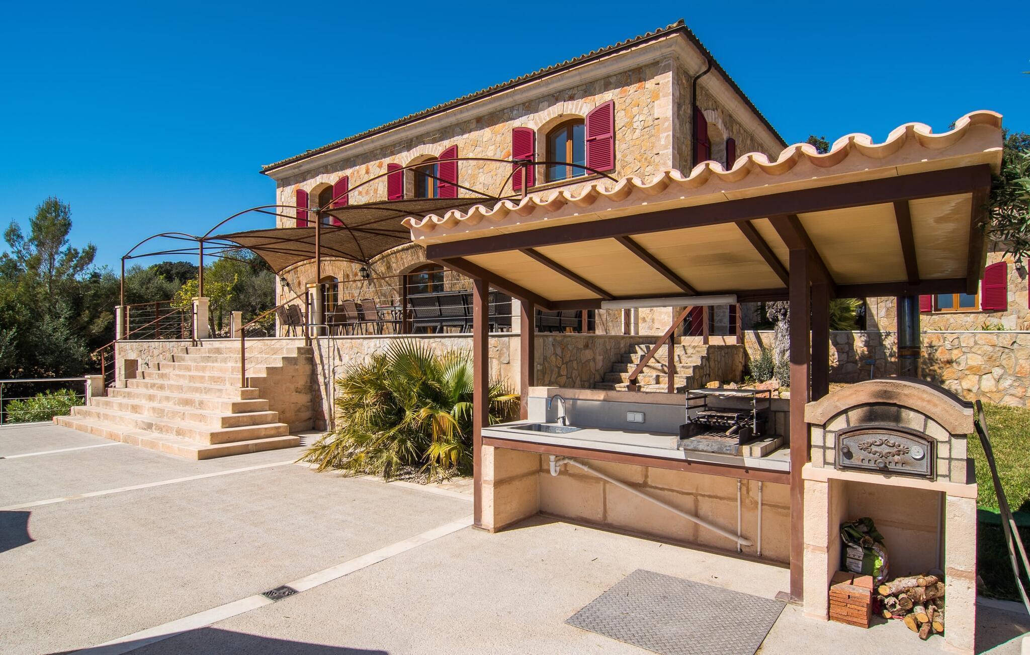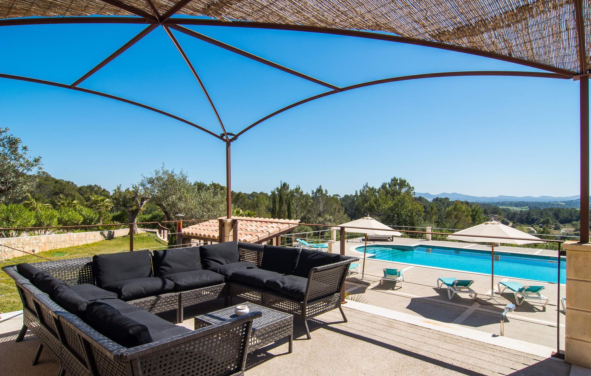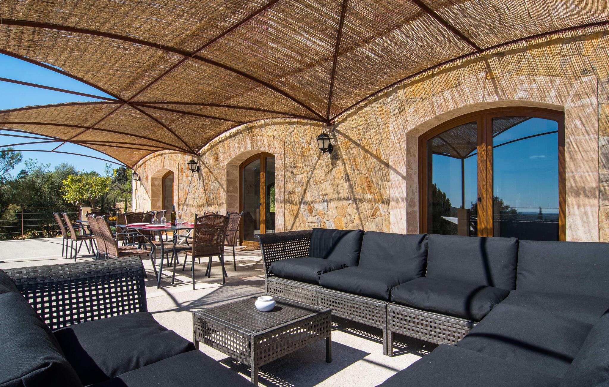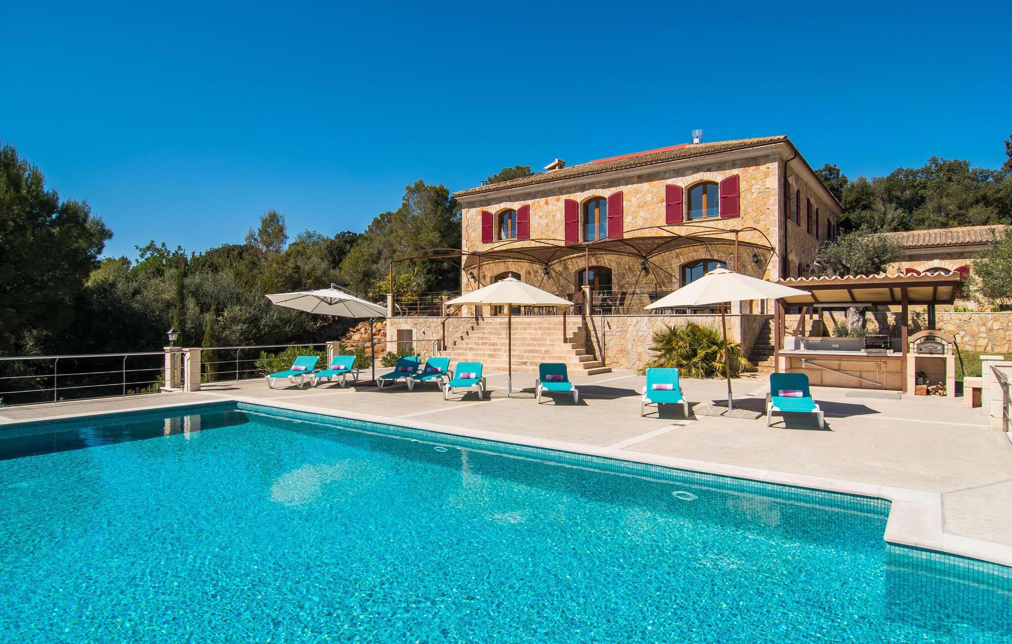 Sobald Sie angekommen sind, spendet die überdachte Terrasse mit einem außergewöhnlichen Blick auf den Pool Schatten beim täglichen Zusammensitzen und beim Grillen – und in der Außenküche steht sogar ein Pizzaofen bereit! Von der wunderschönen Villa gelangen Sie über ein paar Schritte direkt zum azurblauen Pool mit Panoramablick, der Sie bereits unter der mallorquinischen Sonne erwartet. Rund um den Pool laden bequeme Sonnenliegen und ein hochwertiges Tagesbett im Freien zum Mittagsschläfchen oder zum Lesen Ihres Lieblingsbuchs ein.