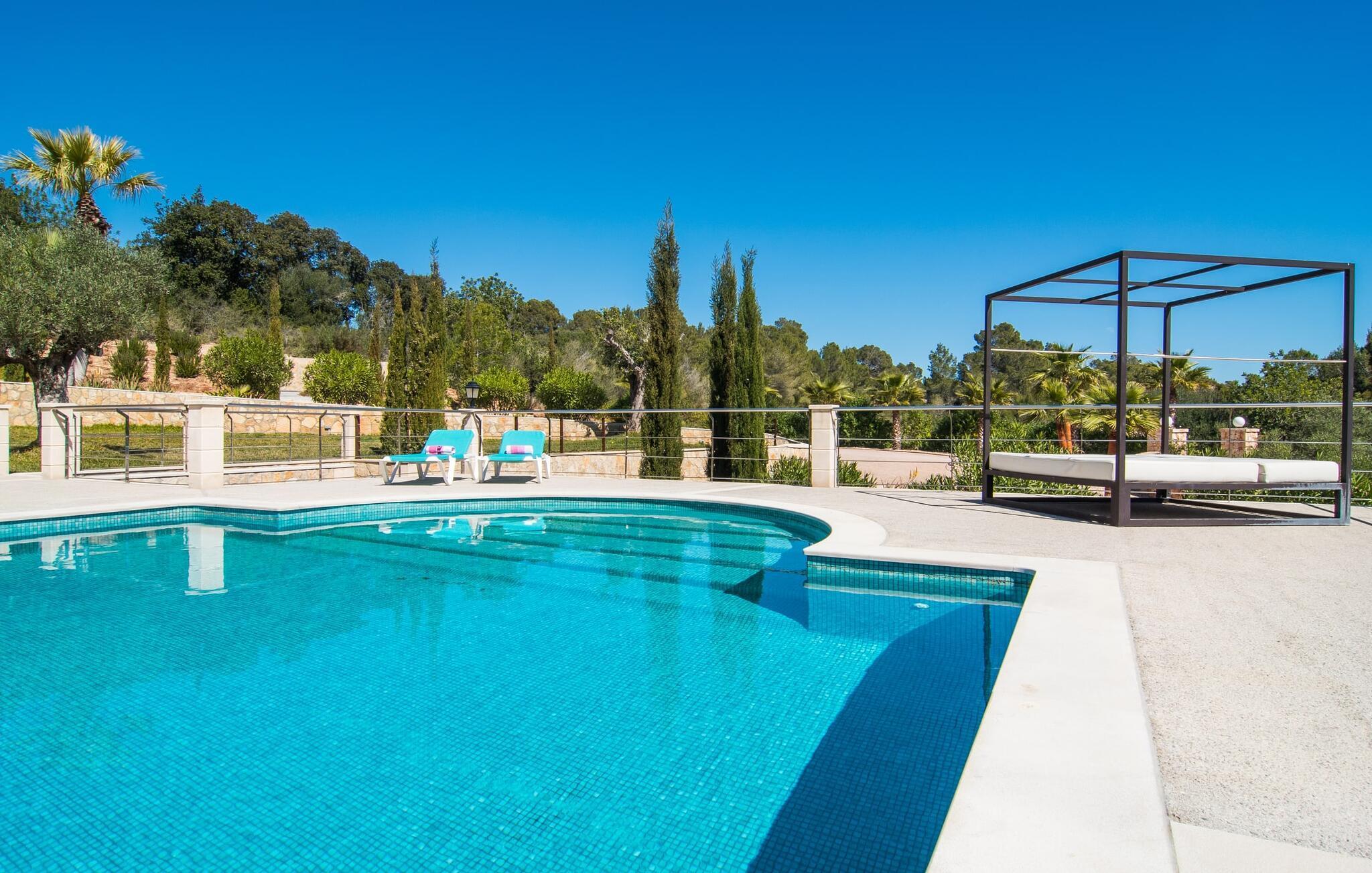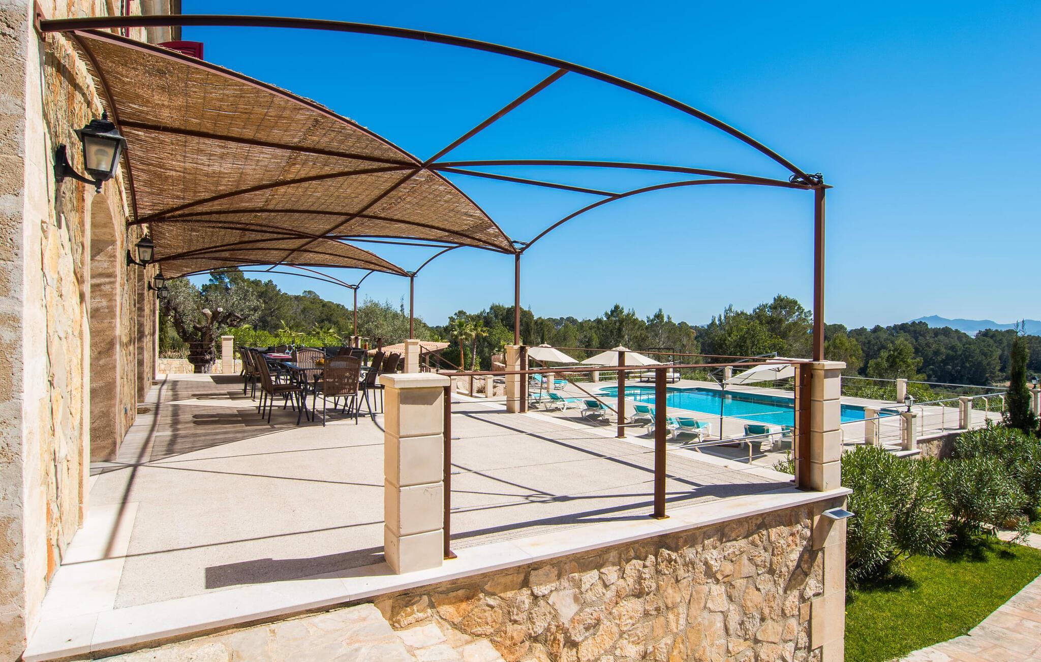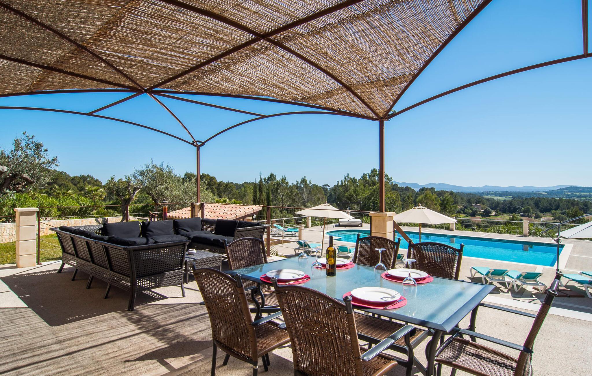 Sobald Sie angekommen sind, spendet die überdachte Terrasse mit einem außergewöhnlichen Blick auf den Pool Schatten beim täglichen Zusammensitzen und beim Grillen – und in der Außenküche steht sogar ein Pizzaofen bereit! Von der wunderschönen Villa gelangen Sie über ein paar Schritte direkt zum azurblauen Pool mit Panoramablick, der Sie bereits unter der mallorquinischen Sonne erwartet. Rund um den Pool laden bequeme Sonnenliegen und ein hochwertiges Tagesbett im Freien zum Mittagsschläfchen oder zum Lesen Ihres Lieblingsbuchs ein.