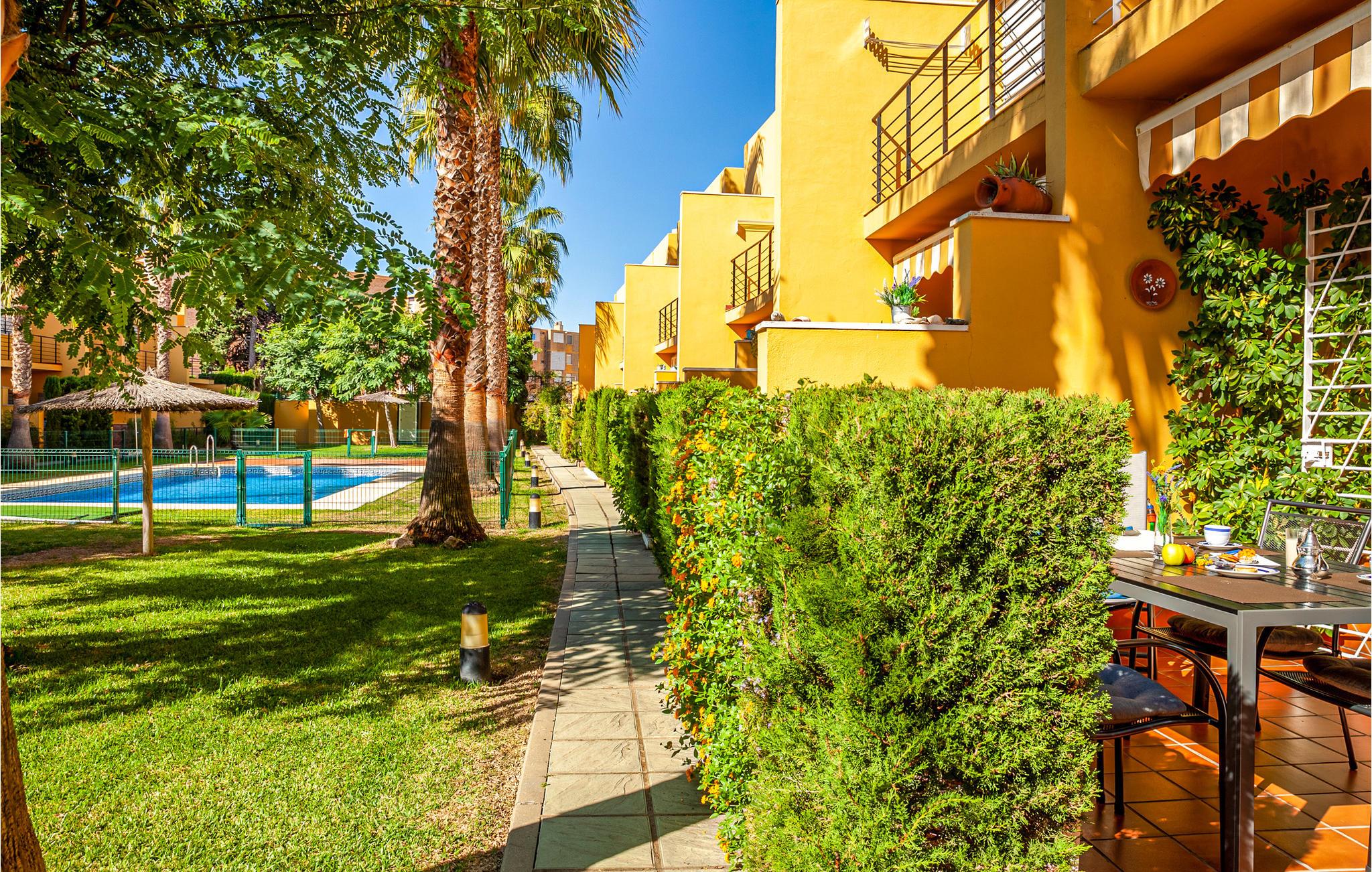 Vom Wohnraum aus treten Sie auf die schöne Terrasse. Genießen Sie morgens einen frisch gebrühten Kaffee beim Blick ins Grün und machen Sie sich es nachmittags in den Gartenmöbeln bei Ihrem Lieblingsbuch bequem. An heißen Tagen lädt der gemeinsame Außenpool zu einem erfrischenden Sprung ins Wasser ein.