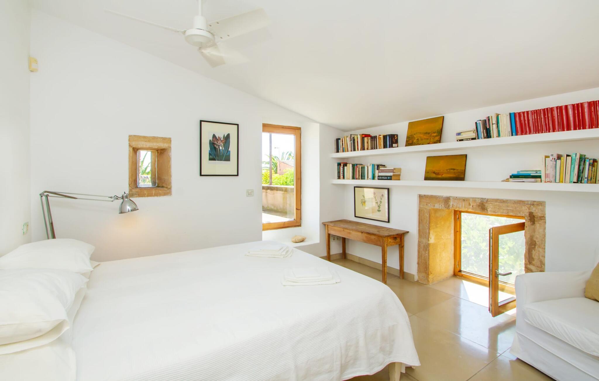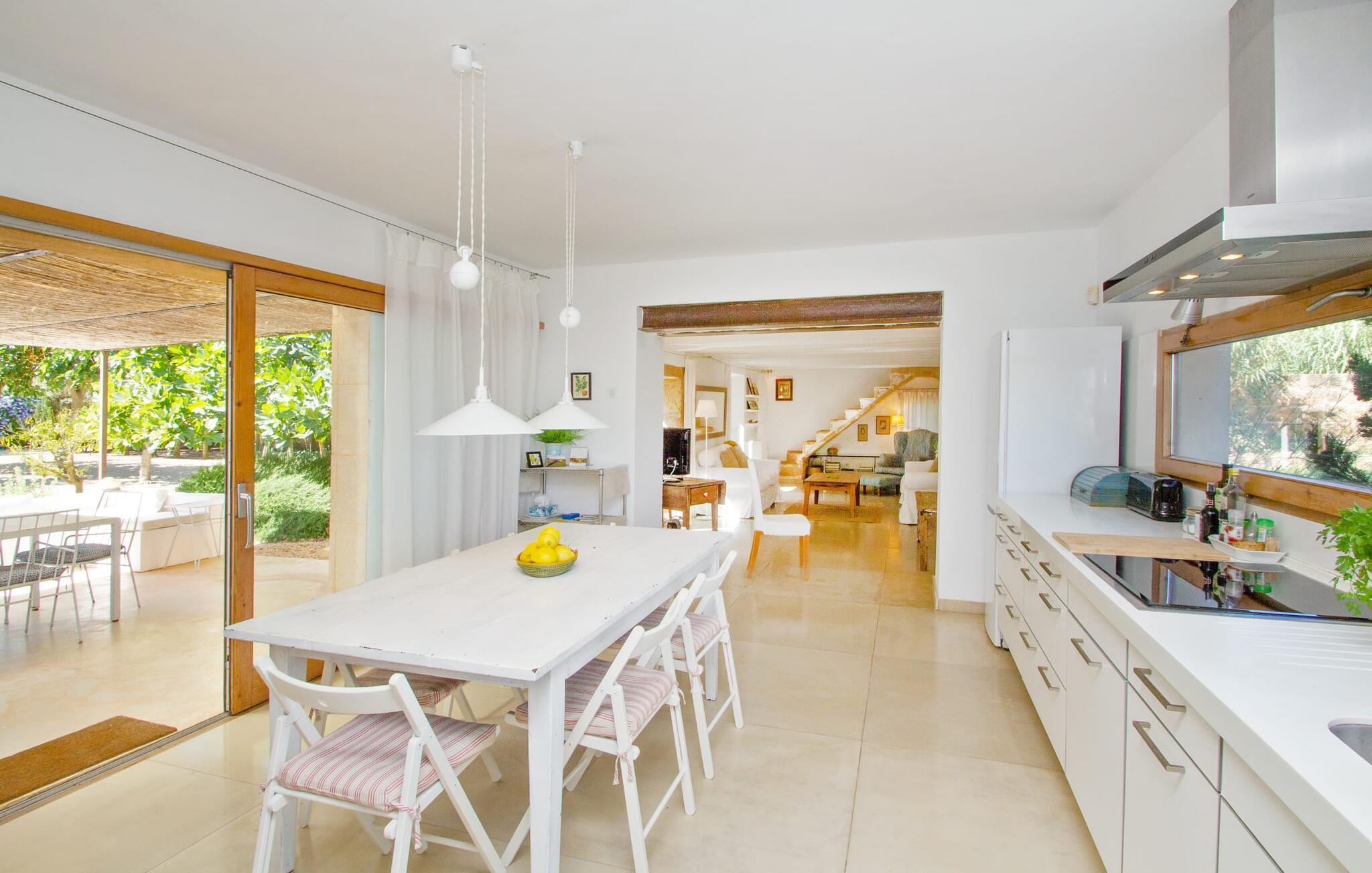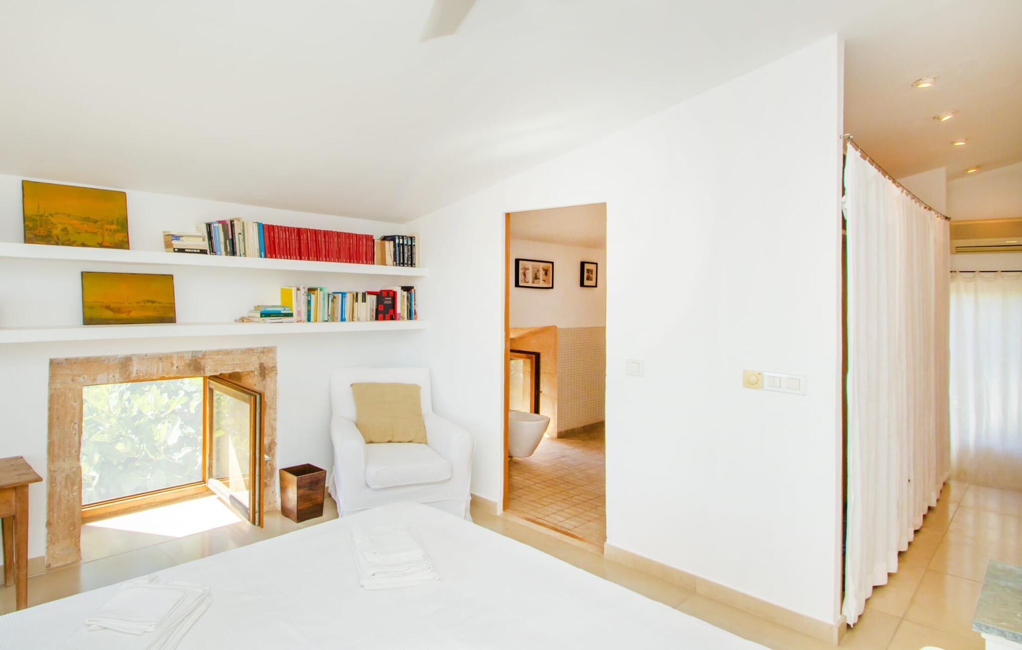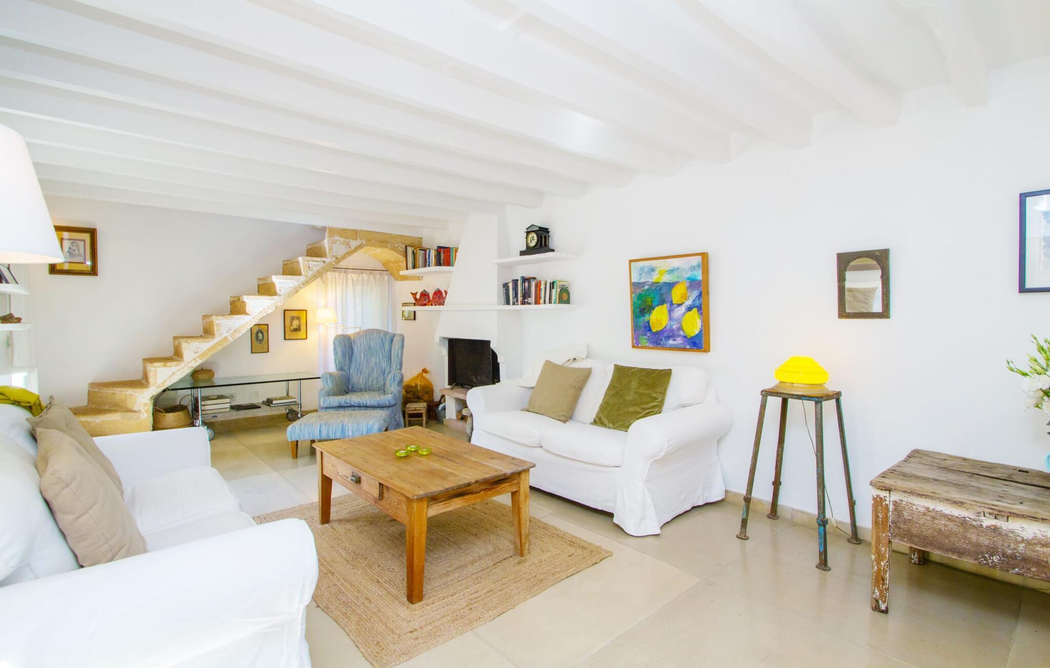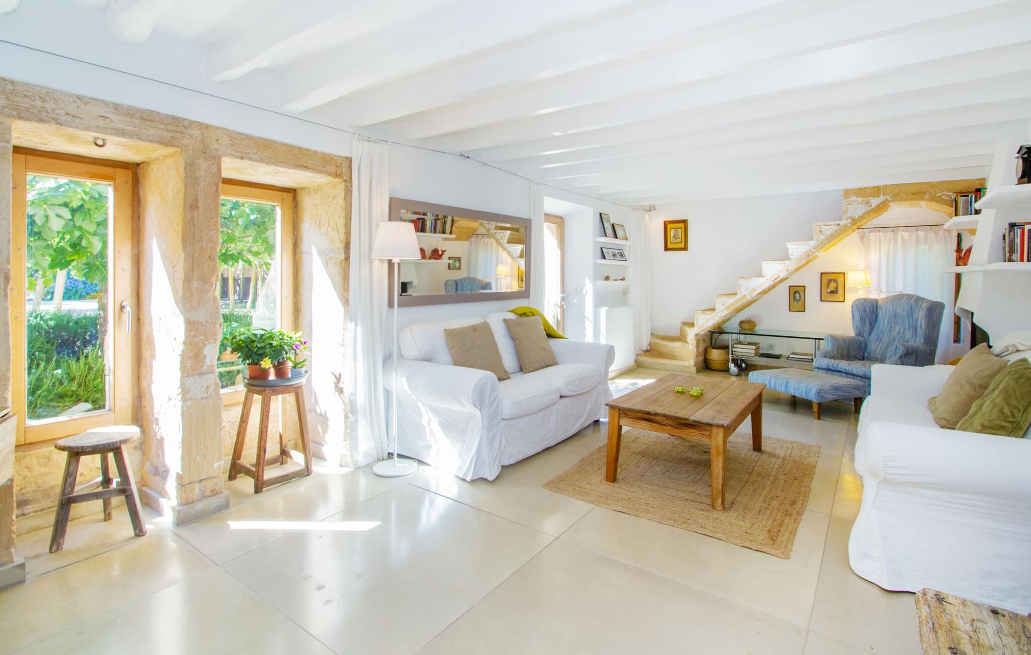 Die renovierte alte Villa „Jara“ ist eine ganz besondere Immobilie. Es besteht aus einem etwa 200 Jahre alten und komplett renovierten Hauptgebäude, einem Neubau mit weiteren Schlafzimmern, jeweils mit eigenem WC und Dusche en suite, und einem dritten Grundstücksteil mit großer Sommerküche, groß schattige Terrasse mit Blick auf den Pool und eine vordere Terrasse mit entspannten Sitzmöglichkeiten. Im liebevoll renovierten Haupthaus gibt es neben einer offenen Küche einen sehr großen, offenen und modern eingerichteten Wohn-/Essbereich. Die Einrichtung ist wunderbar hell und überwiegend in Weiß gehalten: Die alten Sichtbalkendecken haben einen weißen Anstrich erhalten, die gemütlichen Möbel im Wohnbereich sind weiß und die Wände sind in strahlendem Weiß gehalten. Die großflächigen, sandsteinfarbenen Bodenfliesen und die teilweise antiken Wandgemälde und Holzmöbel bilden einen schönen Kontrast zu diesem Raum. Der Essbereich öffnet sich und führt Sie in das große, modern gestaltete Wohnzimmer/Küche. Die cremefarbene Küche ist komplett ausgestattet mit allem, was Sie brauchen, vom Wasserkocher, Toaster, Mikrowelle, Saftpresse, Kaffeemaschine, Herd (auf angenehmer Höhe eingestellt) bis hin zur Spülmaschine. Besonders schön ist das lange, schmale Holzfenster in der Küche, eine Besonderheit mit toller Aussicht und sorgt für viel Licht im Raum. Für die kälteren Jahreszeiten gibt es im Haupthaus einen Kamin, der wohlige Wärme zaubert. Gegenüber der Küche am anderen Ende des Wohnzimmers führt eine freistehende Steintreppe hinauf in das einzige Schlafzimmer im Altbau, das auch als einziges mit einer Klimaanlage ausgestattet ist. Vom komfortablen Schlafzimmer aus haben Sie Zugang zu einer privaten Terrasse. Selbstverständlich befindet sich auf dieser Etage auch ein modernes Badezimmer.