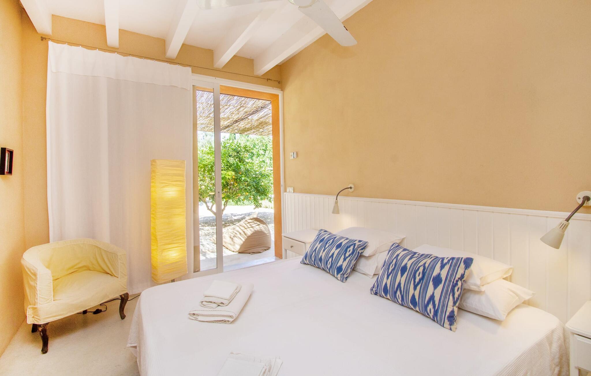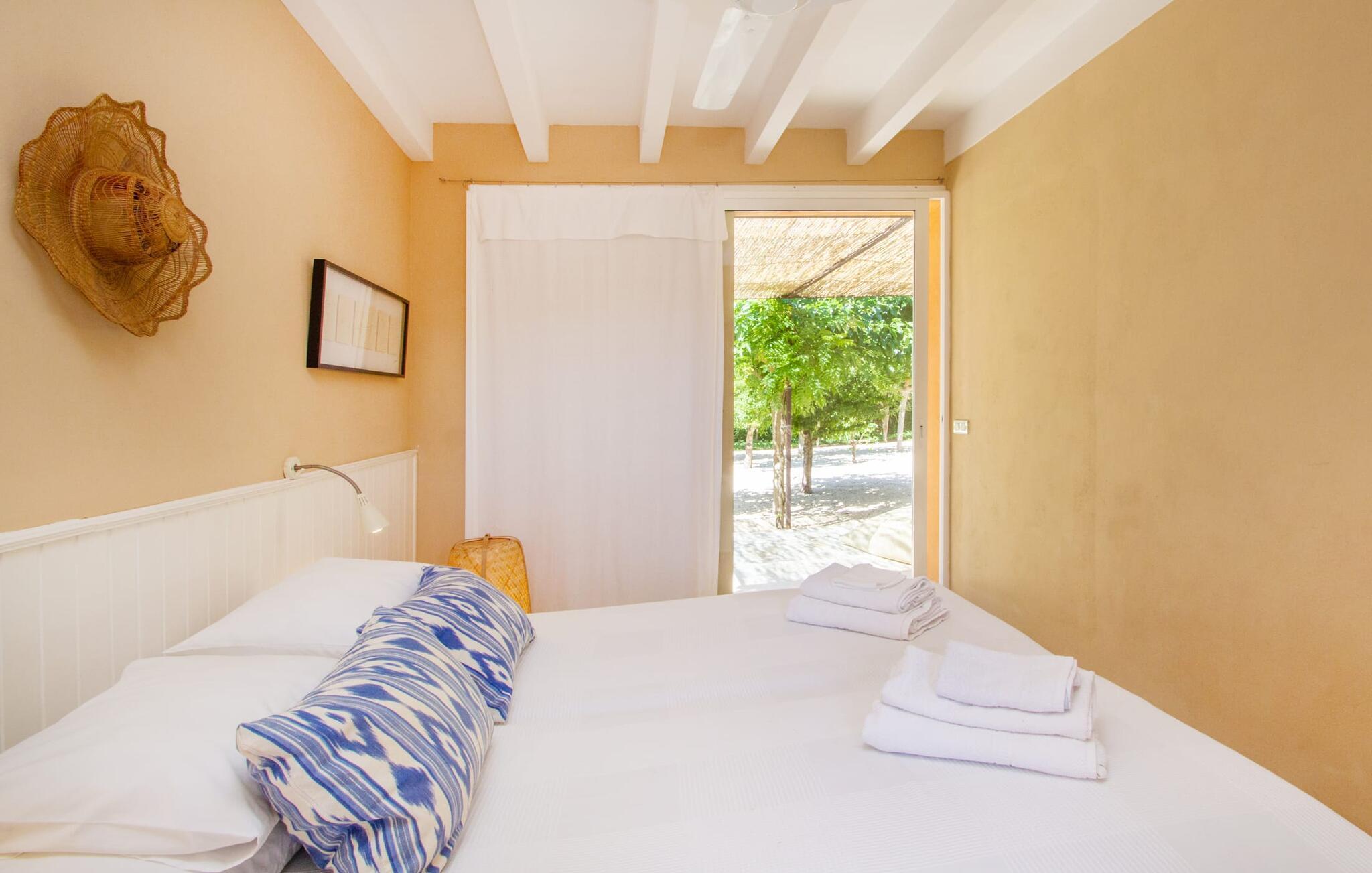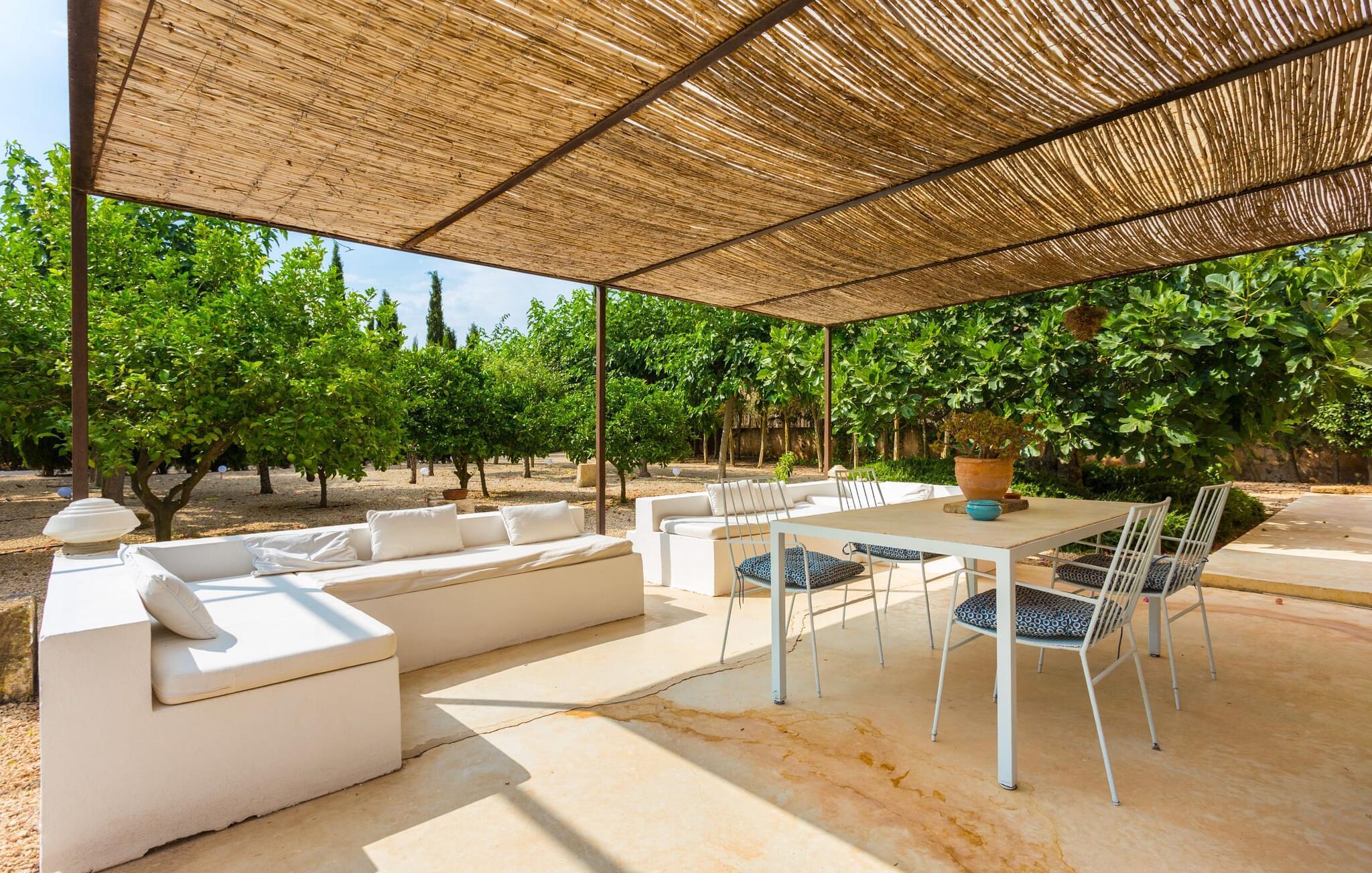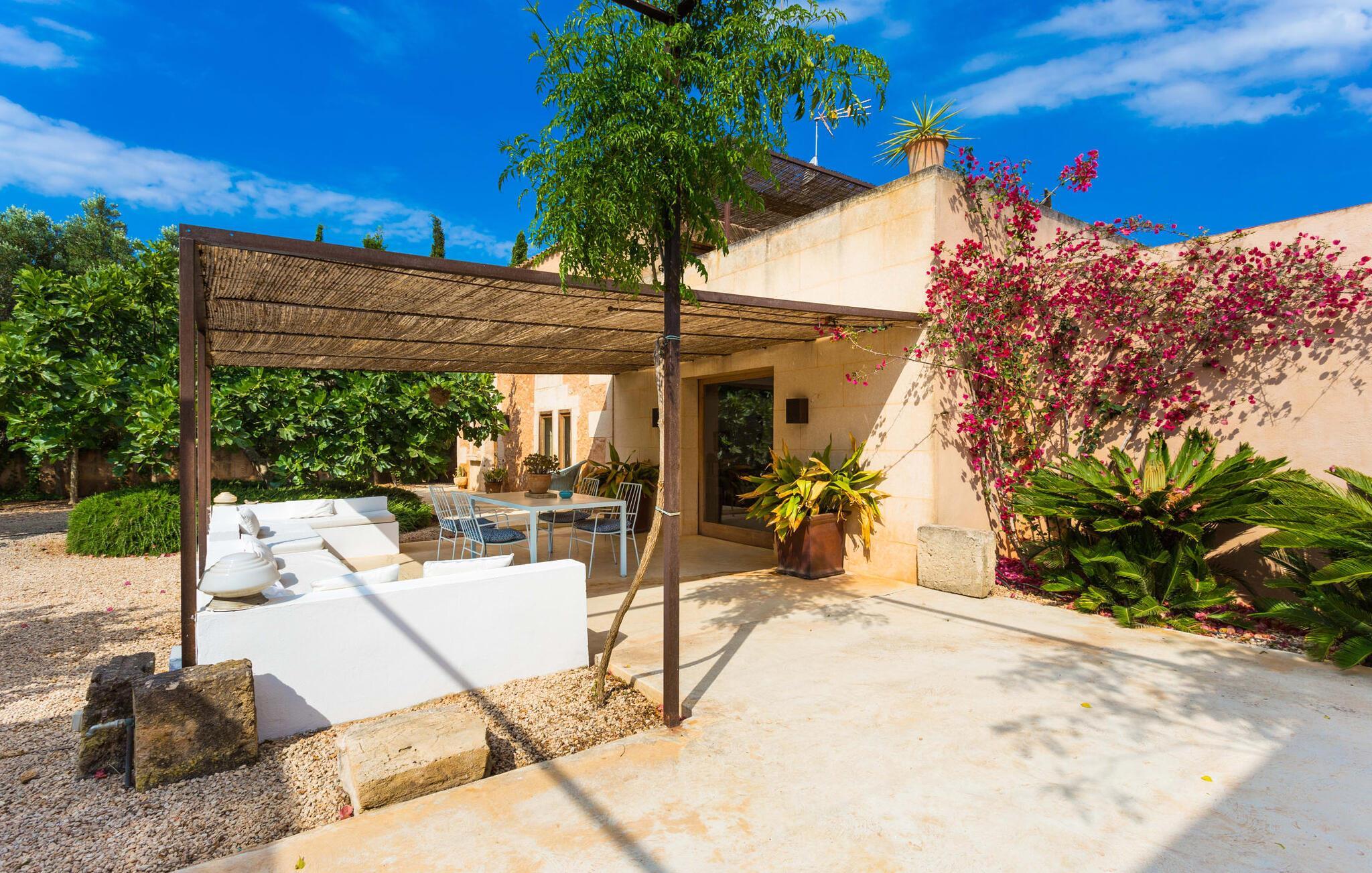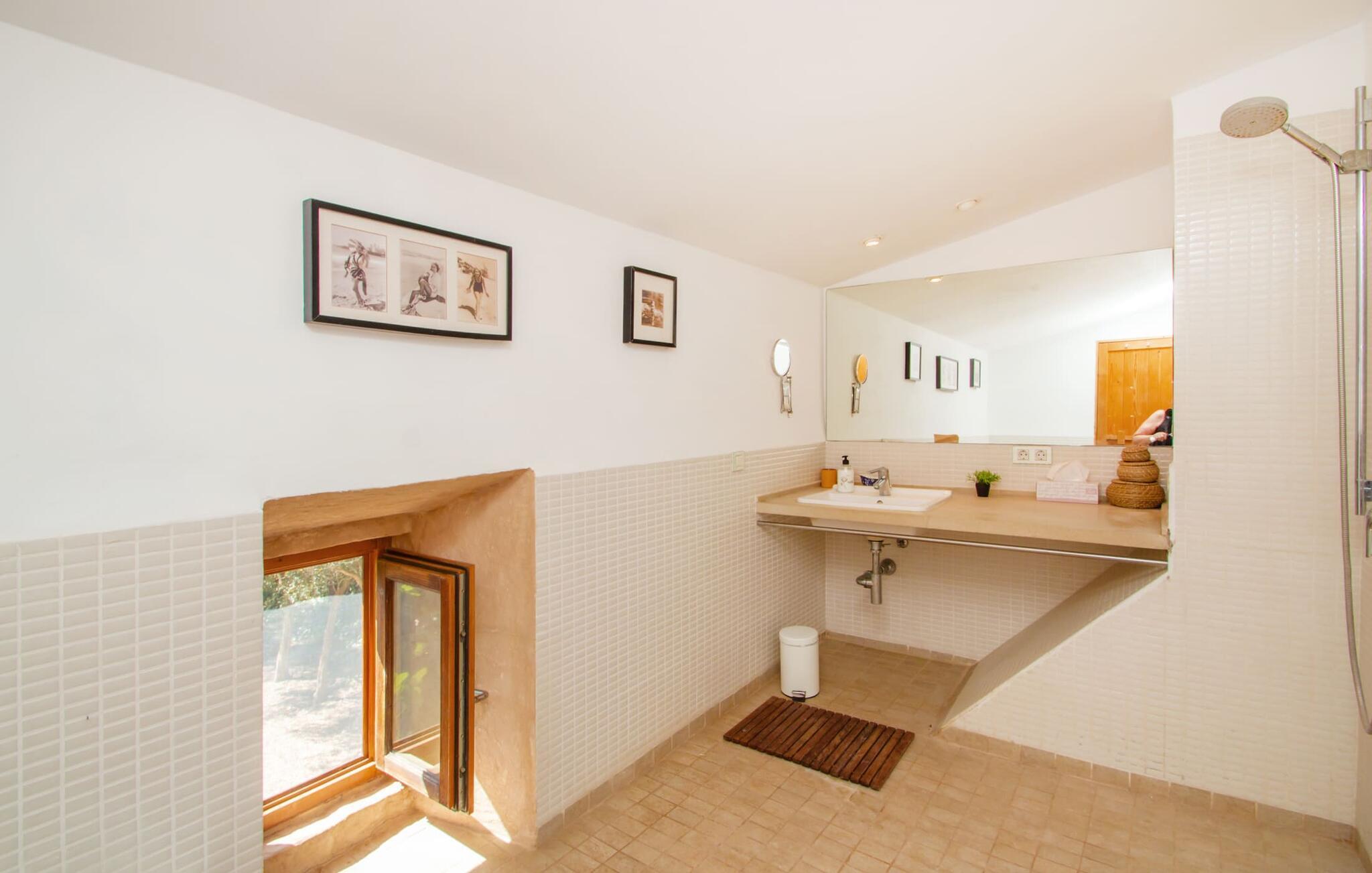 Die renovierte alte Villa „Jara“ ist eine ganz besondere Immobilie. Es besteht aus einem etwa 200 Jahre alten und komplett renovierten Hauptgebäude, einem Neubau mit weiteren Schlafzimmern, jeweils mit eigenem WC und Dusche en suite, und einem dritten Grundstücksteil mit großer Sommerküche, groß schattige Terrasse mit Blick auf den Pool und eine vordere Terrasse mit entspannten Sitzmöglichkeiten. Im liebevoll renovierten Haupthaus gibt es neben einer offenen Küche einen sehr großen, offenen und modern eingerichteten Wohn-/Essbereich. Die Einrichtung ist wunderbar hell und überwiegend in Weiß gehalten: Die alten Sichtbalkendecken haben einen weißen Anstrich erhalten, die gemütlichen Möbel im Wohnbereich sind weiß und die Wände sind in strahlendem Weiß gehalten. Die großflächigen, sandsteinfarbenen Bodenfliesen und die teilweise antiken Wandgemälde und Holzmöbel bilden einen schönen Kontrast zu diesem Raum. Der Essbereich öffnet sich und führt Sie in das große, modern gestaltete Wohnzimmer/Küche. Die cremefarbene Küche ist komplett ausgestattet mit allem, was Sie brauchen, vom Wasserkocher, Toaster, Mikrowelle, Saftpresse, Kaffeemaschine, Herd (auf angenehmer Höhe eingestellt) bis hin zur Spülmaschine. Besonders schön ist das lange, schmale Holzfenster in der Küche, eine Besonderheit mit toller Aussicht und sorgt für viel Licht im Raum. Für die kälteren Jahreszeiten gibt es im Haupthaus einen Kamin, der wohlige Wärme zaubert. Gegenüber der Küche am anderen Ende des Wohnzimmers führt eine freistehende Steintreppe hinauf in das einzige Schlafzimmer im Altbau, das auch als einziges mit einer Klimaanlage ausgestattet ist. Vom komfortablen Schlafzimmer aus haben Sie Zugang zu einer privaten Terrasse. Selbstverständlich befindet sich auf dieser Etage auch ein modernes Badezimmer.