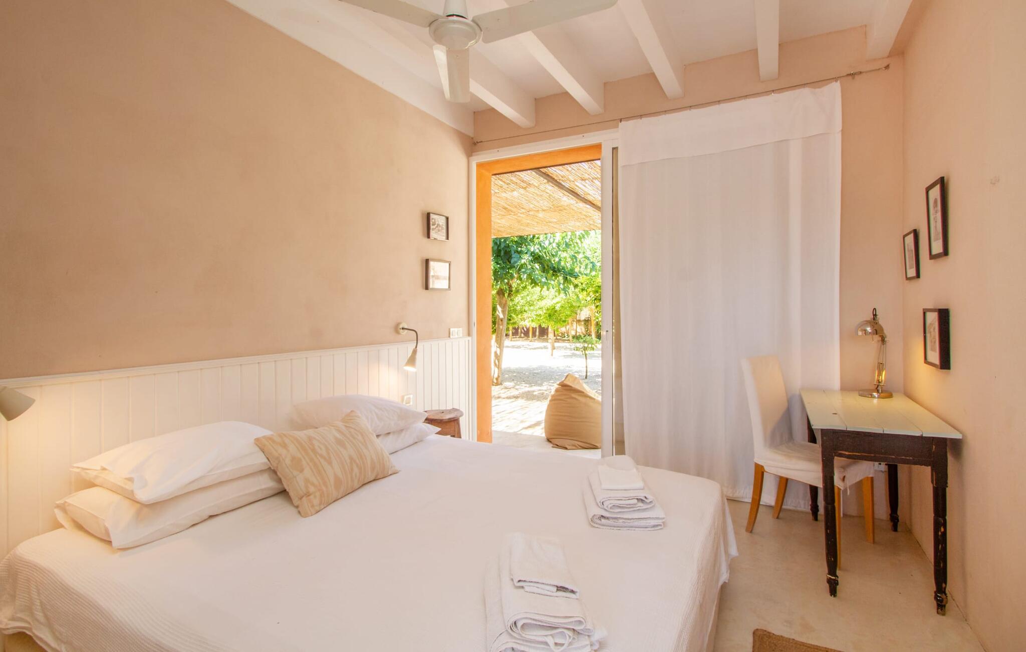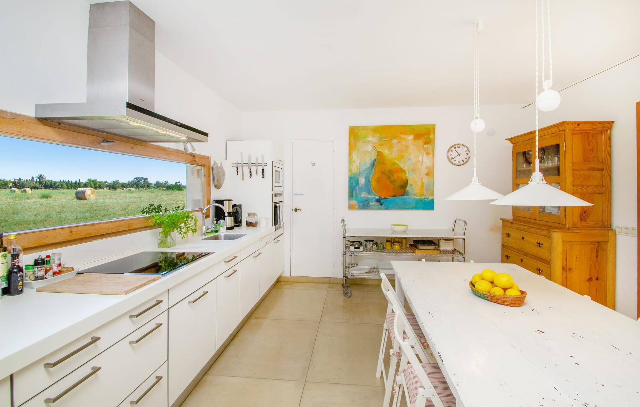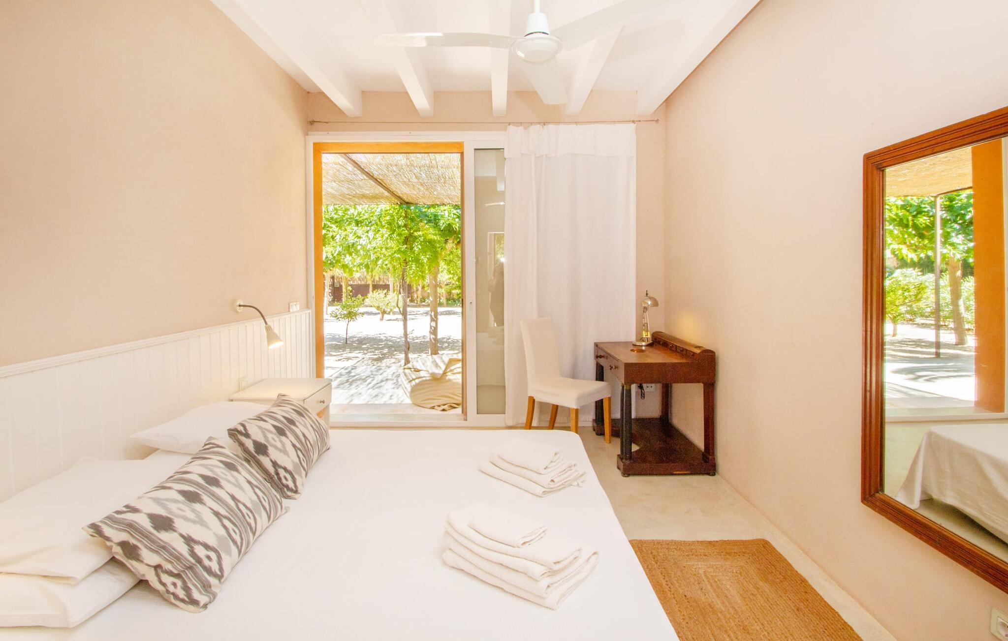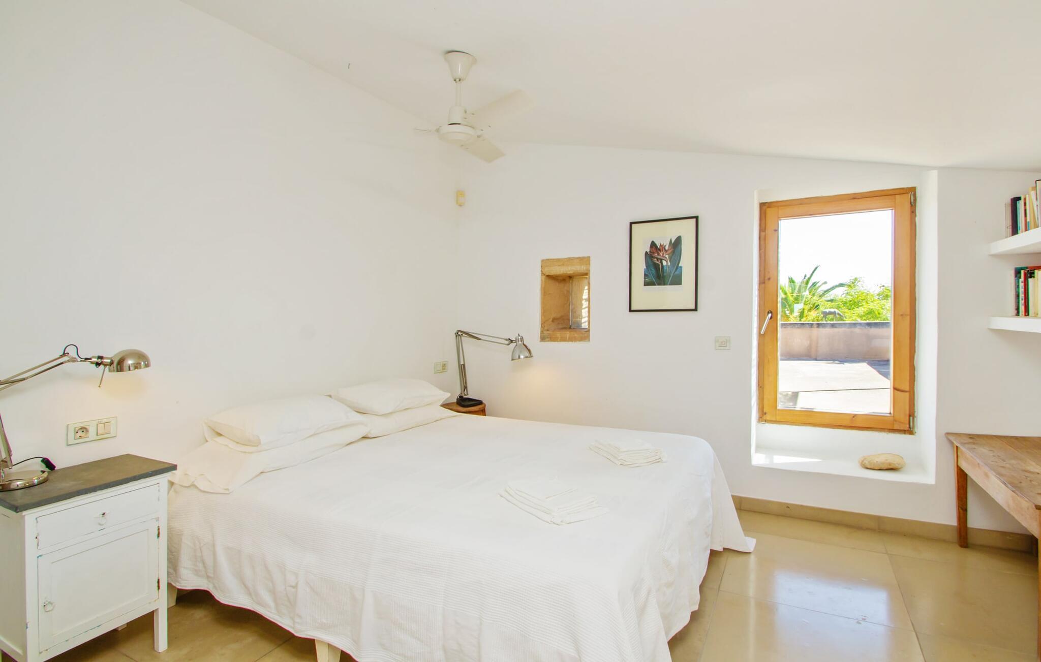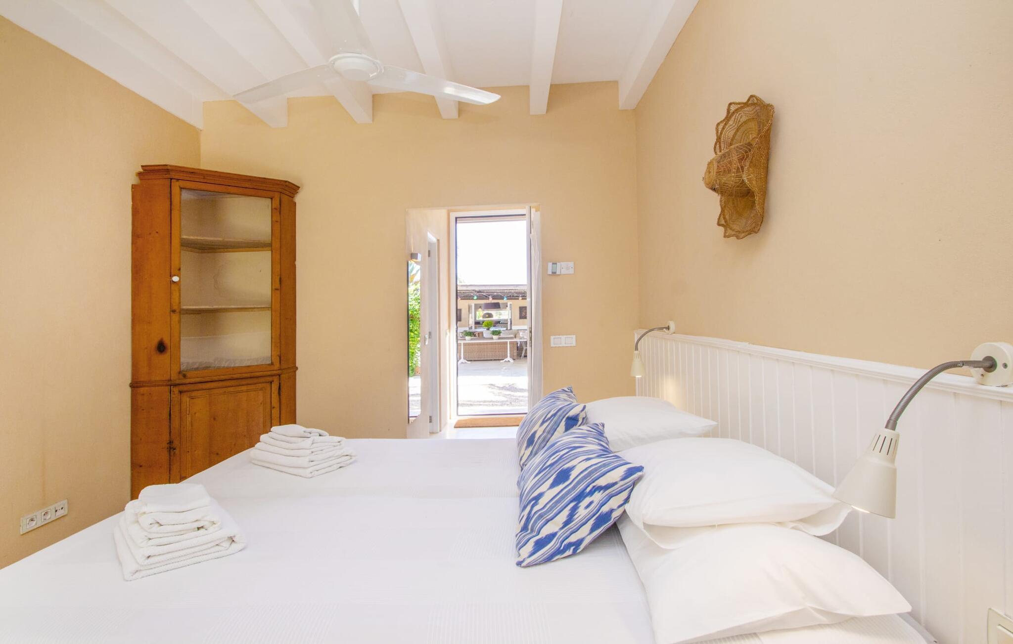 Die renovierte alte Villa „Jara“ ist eine ganz besondere Immobilie. Es besteht aus einem etwa 200 Jahre alten und komplett renovierten Hauptgebäude, einem Neubau mit weiteren Schlafzimmern, jeweils mit eigenem WC und Dusche en suite, und einem dritten Grundstücksteil mit großer Sommerküche, groß schattige Terrasse mit Blick auf den Pool und eine vordere Terrasse mit entspannten Sitzmöglichkeiten. Im liebevoll renovierten Haupthaus gibt es neben einer offenen Küche einen sehr großen, offenen und modern eingerichteten Wohn-/Essbereich. Die Einrichtung ist wunderbar hell und überwiegend in Weiß gehalten: Die alten Sichtbalkendecken haben einen weißen Anstrich erhalten, die gemütlichen Möbel im Wohnbereich sind weiß und die Wände sind in strahlendem Weiß gehalten. Die großflächigen, sandsteinfarbenen Bodenfliesen und die teilweise antiken Wandgemälde und Holzmöbel bilden einen schönen Kontrast zu diesem Raum. Der Essbereich öffnet sich und führt Sie in das große, modern gestaltete Wohnzimmer/Küche. Die cremefarbene Küche ist komplett ausgestattet mit allem, was Sie brauchen, vom Wasserkocher, Toaster, Mikrowelle, Saftpresse, Kaffeemaschine, Herd (auf angenehmer Höhe eingestellt) bis hin zur Spülmaschine. Besonders schön ist das lange, schmale Holzfenster in der Küche, eine Besonderheit mit toller Aussicht und sorgt für viel Licht im Raum. Für die kälteren Jahreszeiten gibt es im Haupthaus einen Kamin, der wohlige Wärme zaubert. Gegenüber der Küche am anderen Ende des Wohnzimmers führt eine freistehende Steintreppe hinauf in das einzige Schlafzimmer im Altbau, das auch als einziges mit einer Klimaanlage ausgestattet ist. Vom komfortablen Schlafzimmer aus haben Sie Zugang zu einer privaten Terrasse. Selbstverständlich befindet sich auf dieser Etage auch ein modernes Badezimmer.