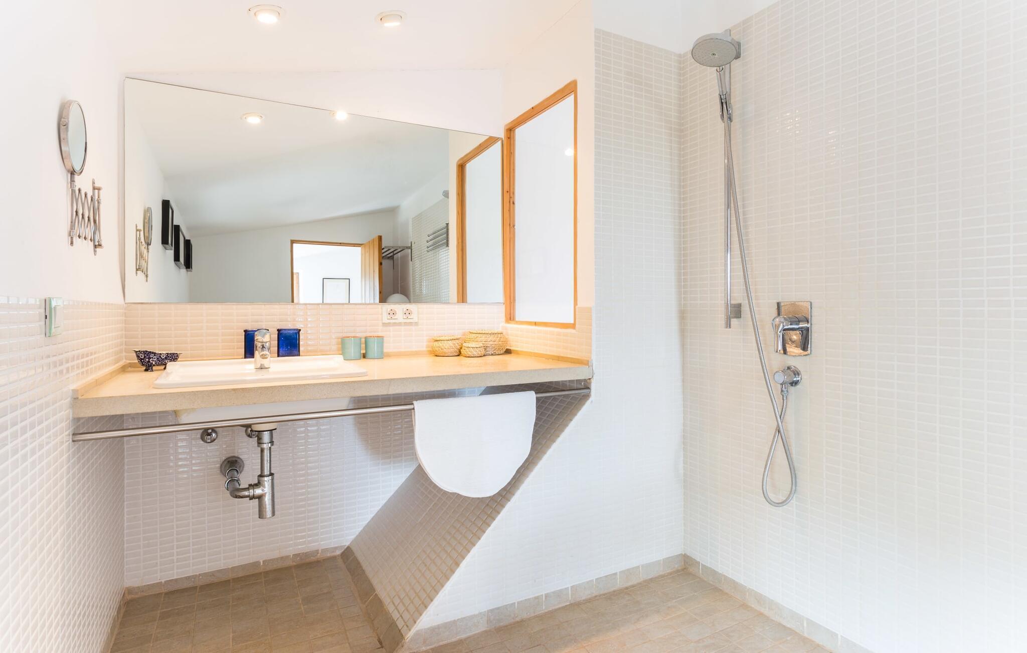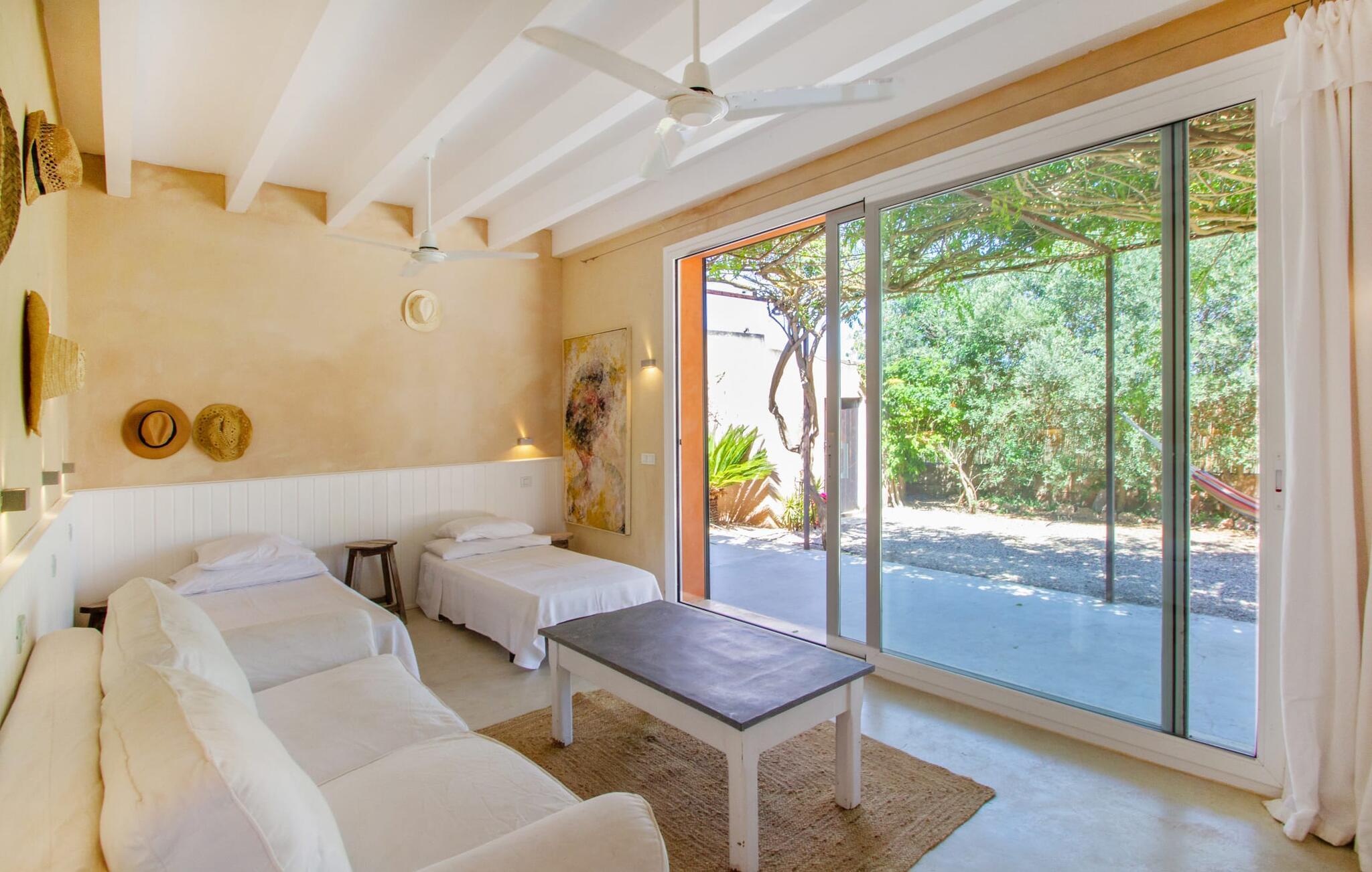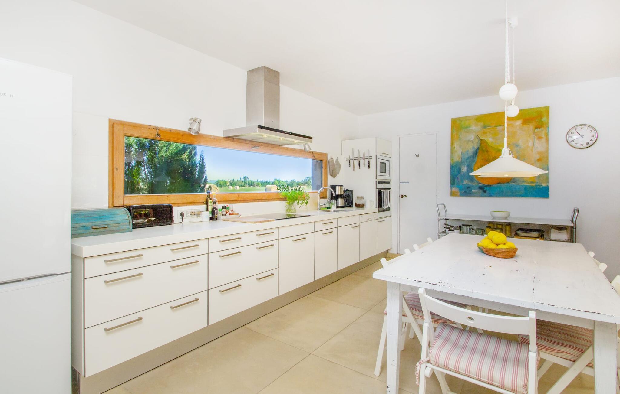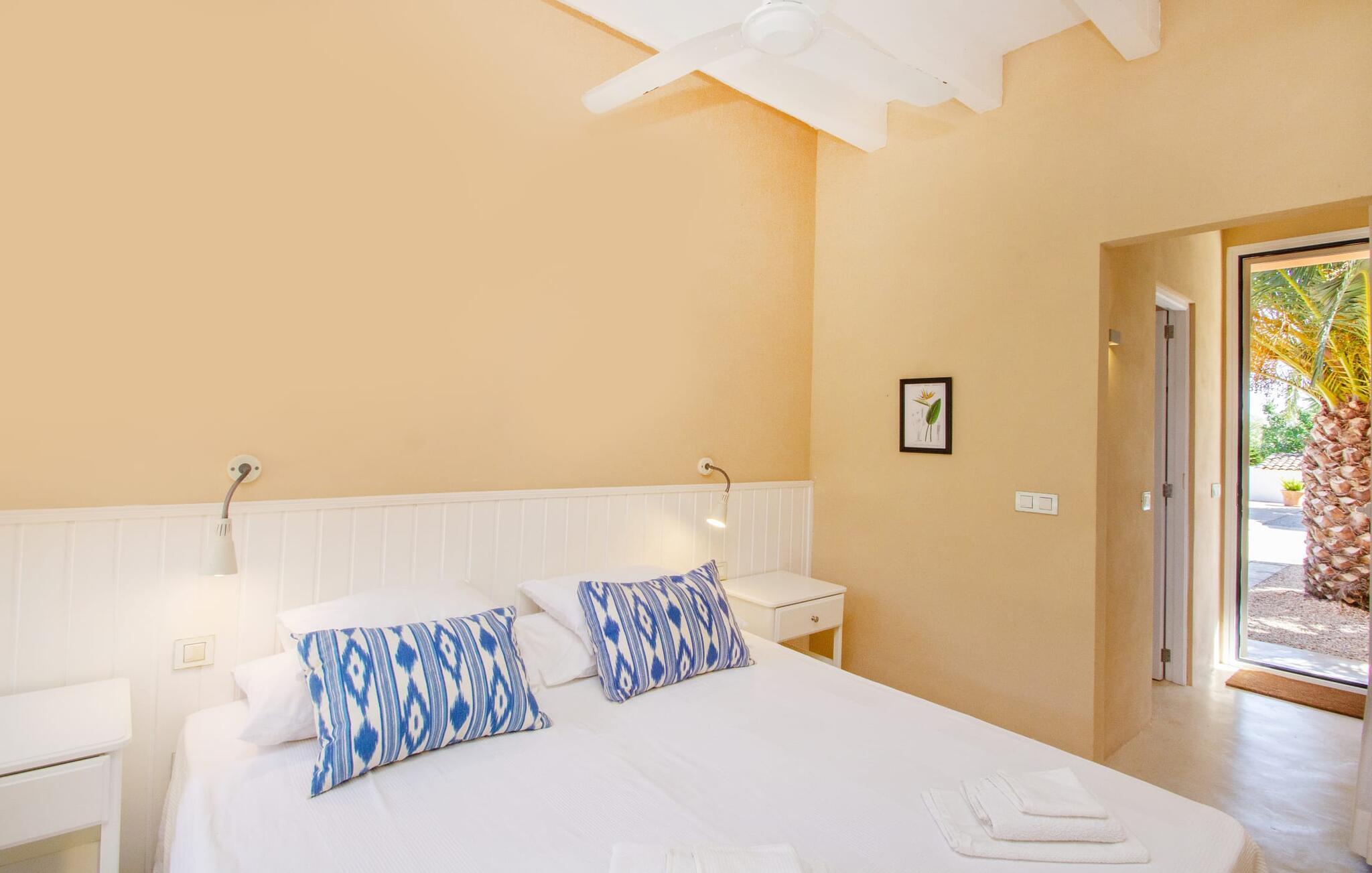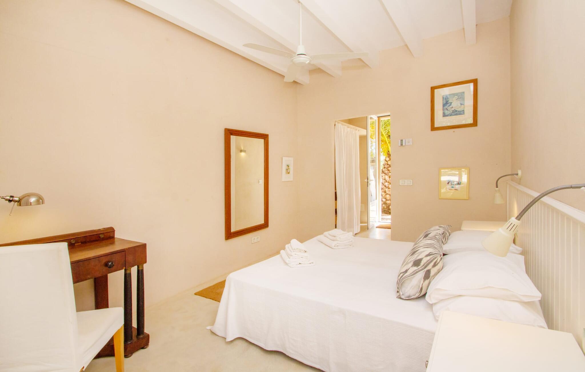 Die renovierte alte Villa „Jara“ ist eine ganz besondere Immobilie. Es besteht aus einem etwa 200 Jahre alten und komplett renovierten Hauptgebäude, einem Neubau mit weiteren Schlafzimmern, jeweils mit eigenem WC und Dusche en suite, und einem dritten Grundstücksteil mit großer Sommerküche, groß schattige Terrasse mit Blick auf den Pool und eine vordere Terrasse mit entspannten Sitzmöglichkeiten. Im liebevoll renovierten Haupthaus gibt es neben einer offenen Küche einen sehr großen, offenen und modern eingerichteten Wohn-/Essbereich. Die Einrichtung ist wunderbar hell und überwiegend in Weiß gehalten: Die alten Sichtbalkendecken haben einen weißen Anstrich erhalten, die gemütlichen Möbel im Wohnbereich sind weiß und die Wände sind in strahlendem Weiß gehalten. Die großflächigen, sandsteinfarbenen Bodenfliesen und die teilweise antiken Wandgemälde und Holzmöbel bilden einen schönen Kontrast zu diesem Raum. Der Essbereich öffnet sich und führt Sie in das große, modern gestaltete Wohnzimmer/Küche. Die cremefarbene Küche ist komplett ausgestattet mit allem, was Sie brauchen, vom Wasserkocher, Toaster, Mikrowelle, Saftpresse, Kaffeemaschine, Herd (auf angenehmer Höhe eingestellt) bis hin zur Spülmaschine. Besonders schön ist das lange, schmale Holzfenster in der Küche, eine Besonderheit mit toller Aussicht und sorgt für viel Licht im Raum. Für die kälteren Jahreszeiten gibt es im Haupthaus einen Kamin, der wohlige Wärme zaubert. Gegenüber der Küche am anderen Ende des Wohnzimmers führt eine freistehende Steintreppe hinauf in das einzige Schlafzimmer im Altbau, das auch als einziges mit einer Klimaanlage ausgestattet ist. Vom komfortablen Schlafzimmer aus haben Sie Zugang zu einer privaten Terrasse. Selbstverständlich befindet sich auf dieser Etage auch ein modernes Badezimmer.