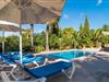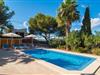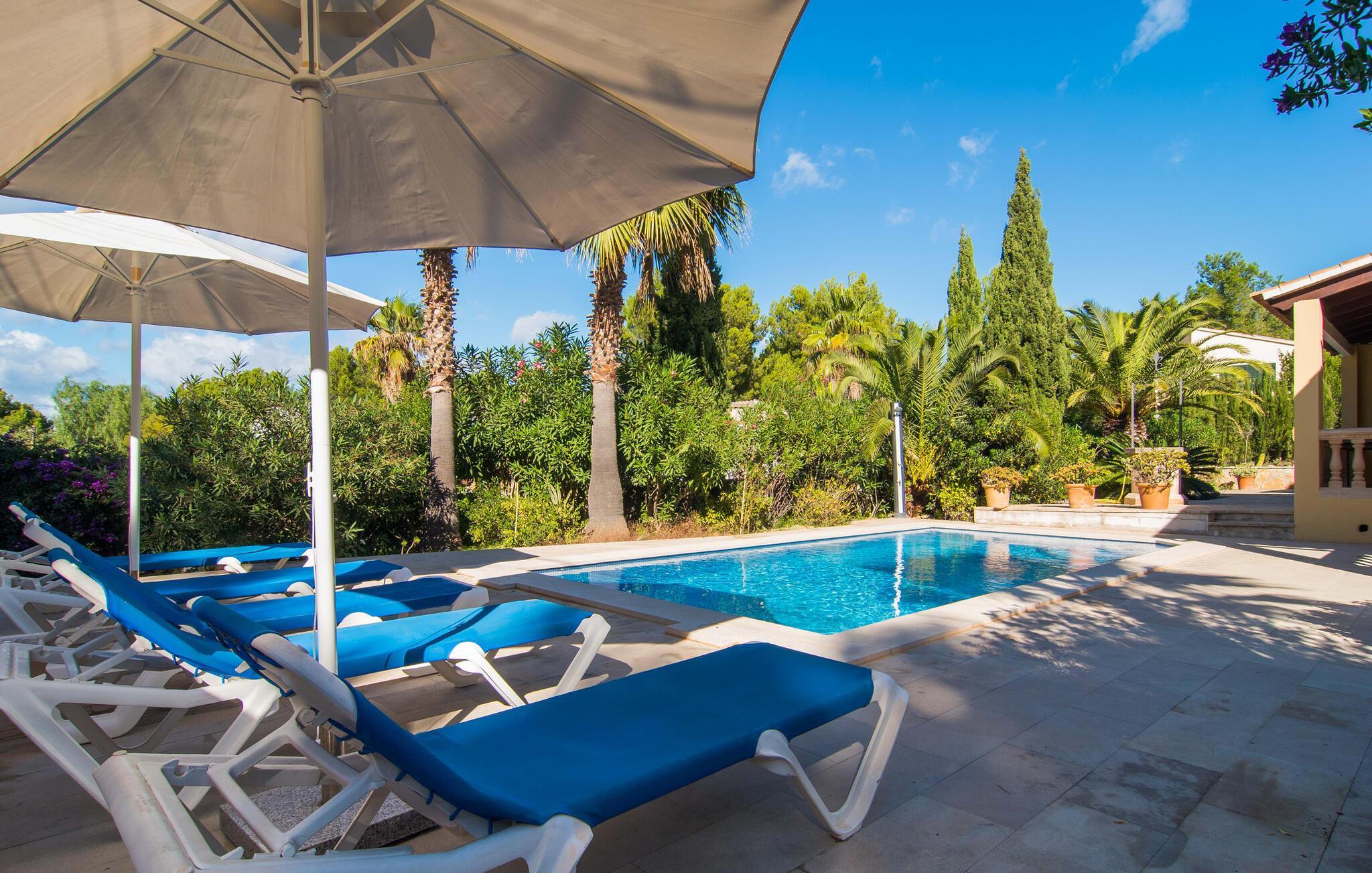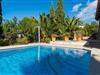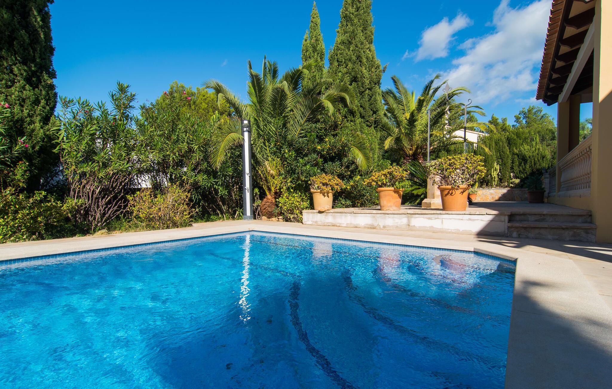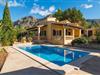 Dieses Ferienhaus auf Mallorca liegt vor einer verträumten Bergkulisse und erwartet Gäste, die sich für eine Weile im ruhigen Norden der Insel niederlassen und die Nähe zum Meer genießen möchten. Die Terrassen direkt am Haus und am davor liegenden, mit blauen Mosaiksteinen belegten und über Treppen bequem erreichbaren Pool erstrecken sich in mehrere Richtungen. Hier können Sie eintauchen, Kraft tanken und lange entspannen. Das umgebende üppige mediterrane Grün sorgt für eine gemütliche Atmosphäre und je nach Sonnenstand für luftigen Naturschatten. Überdachte Verandabereiche vor dem malerischen gelben Gebäude mit grünen Fensterläden bieten einladende Sitzgelegenheiten mit Blick auf den Garten, und für Aktive gibt es eine Tischtennisplatte. Interessant wird es beim Grillen: Hier haben Sie die Wahl zwischen zwei Weber-Grills, Gas und Holzkohle, auf denen Sie mediterrane Köstlichkeiten zubereiten können.