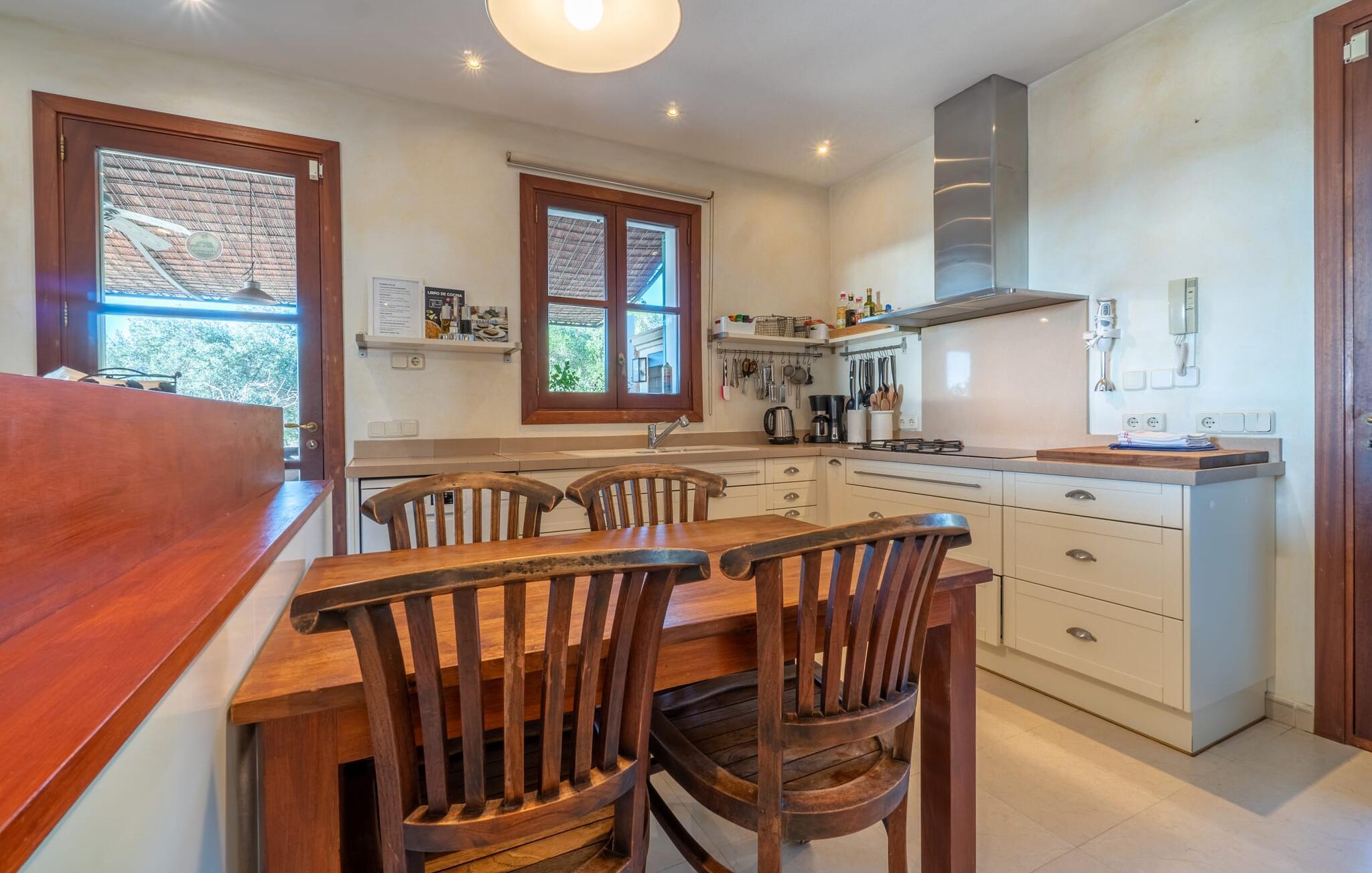 Beim Betreten des Hauses wird man von einer außergewöhnlich heimeligen Atmosphäre empfangen und von einem ästhetisch ansprechenden Wohnambiente umhüllt. Elegante Einzelstücke und hochwertige Materialien überraschen in einer sehr harmonischen Kombination. Ein großes Wohn-/Esszimmer bietet einen Esstisch für acht Personen, sowie eine äußerst gemütliche Sofaecke. Auch der Flachbildfernseher ist bequem im Wohnraum platziert. An kühleren Abenden kann man sogar beim Kaminlicht entspannen und an der Wärme eines Feuers sitzen. Die helle und freundlich gestaltete Küche ist komplett ausgestattet mit Kühlschrank, Backofen, Herd, Geschirrspüler, Toaster sowie Wasserkocher und Kaffeemaschine. Hier besteht zusätzlich die Möglichkeit, zu viert eine Mahlzeit einzunehmen. Zusätzliche Ess- und Wohnräume ergänzen die bisherige Beschreibung in vielerlei Hinsicht, so dass auch eine große Reisegruppe problemlos ihren ganz privaten Rückzugsort einnehmen kann. Die Schlafzimmer (alle fünf Doppelzimmer verfügen über ein eigenes Badezimmer, drei davon verfügen über eine Hydromassage-Badewanne) sind großzügig geschnitten, mit hochwertigen Möbeln ausgestattet und zeigen ein elegantes Design. Der Verzicht auf viele störende Accessoires verleiht diesen Räumen ein helles und raffiniertes Erscheinungsbild, das zweifellos dazu anregt, eine angenehme Ruhe zu suchen. Auch in den Schlafzimmern kommt das geschmackvolle Design voll zur Geltung. Diese präsentieren sich in einem hochmodernen Stil, sind sehr funktional und großzügig geschnitten.