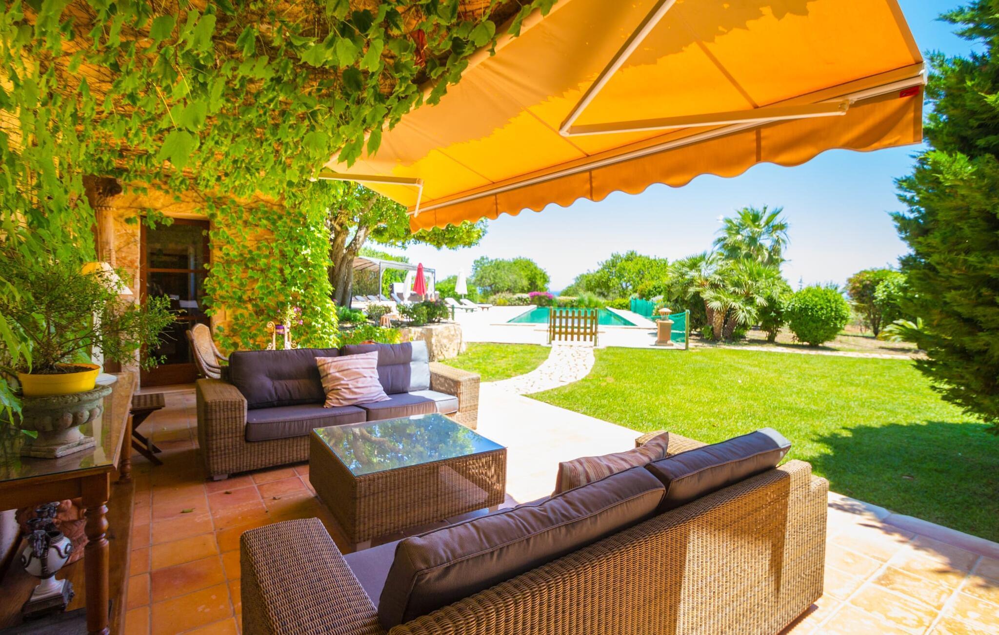 Die gelb gestrichene Fassade, das grüne Efeu und die Markise zaubern ein wunderbares Licht und eine sehr angenehme Atmosphäre. Von einer Hausecke aus gelangt man auf eine weitere Terrasse mit einer großen Fertigrasenfläche, die sicherlich zum Spielplatz für die eventuell mitreisenden Kinder wird. Mehrere himmelwärts gerichtete Stufen führen zum großen Balkon, der eine vielfältige Möbelauswahl für die unterschiedlichsten Ansprüche beherbergt. Hier finden Sie einen großen Esstisch neben einer weiteren Chill-Out-Zone mit verschiedenen modernen Sitzgruppen, die alle eines gemeinsam haben: einen fantastischen Weitblick bis zum Meer. Aber es gibt noch mehr. Auf der umzäunten Seite des Hauses gibt es einen angrenzenden Bereich mit einem eingebauten Grill an der Vorderseite und einem riesigen Massivholztisch davor. Warum nicht mit Freunden zusammenkommen und einen schönen Grillabend verbringen?