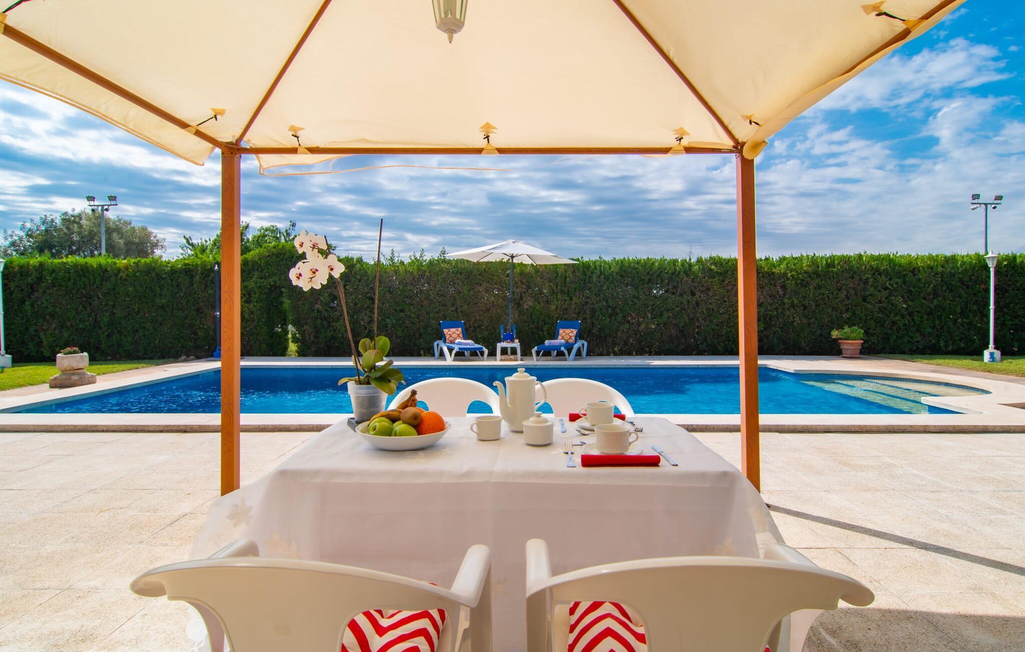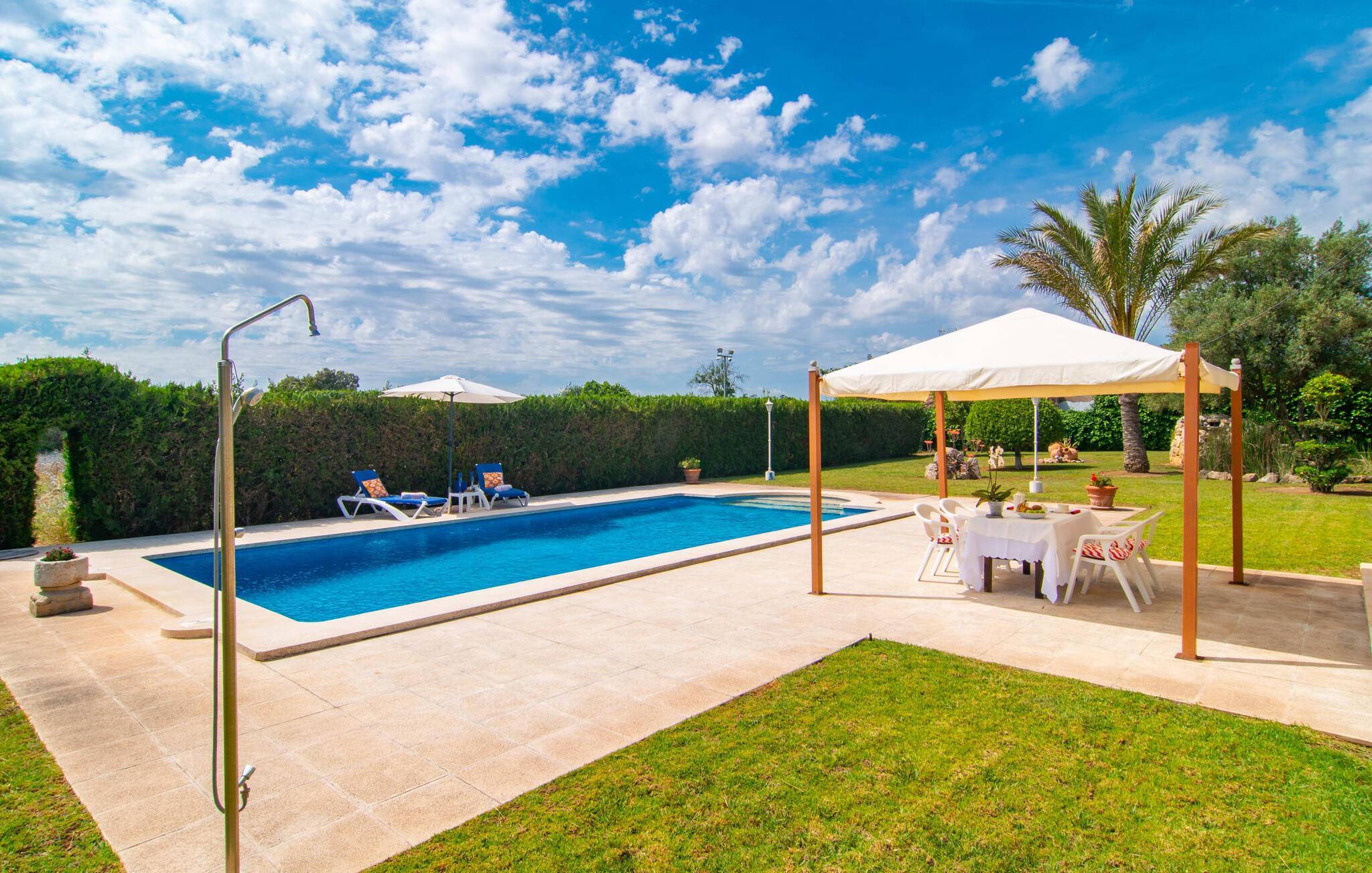 Der weitläufige, gepflegte Garten mit Palmen und üppigem Grün beherbergt einen atemberaubenden türkisfarbenen Pool – perfekt für ein erfrischendes Bad oder zum Faulenzen unter der mallorquinischen Sonne mit einem Cocktail in der Hand. Der rechteckige Pool ist ideal für ein paar Runden und bietet sowohl Entspannung als auch Bewegung.