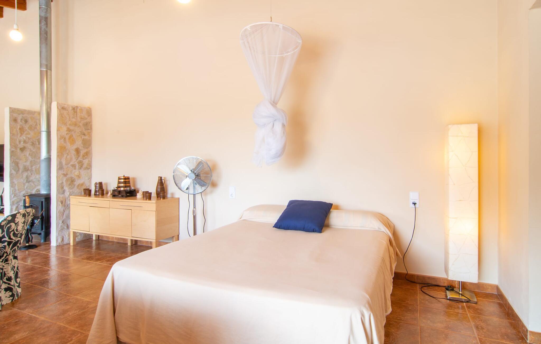 Im Inneren durchfluten große Fenster den Raum mit natürlichem Licht, während hohe Decken und Holzbalken ein loftartiges Gefühl schaffen. Das Interieur mit sanften Beigetönen und filigraner Beleuchtung lädt zum Entspannen ein. Genießen Sie Ihre Mahlzeiten an der langen Tafel mit bunten Stühlen oder entspannen Sie sich auf dem gestreiften Sofa. Das Bett ist nur wenige Schritte vom modernen Badezimmer entfernt, das über eine große Dusche mit Mosaiksteinwänden für ein wohltuendes Wellness-Erlebnis verfügt.