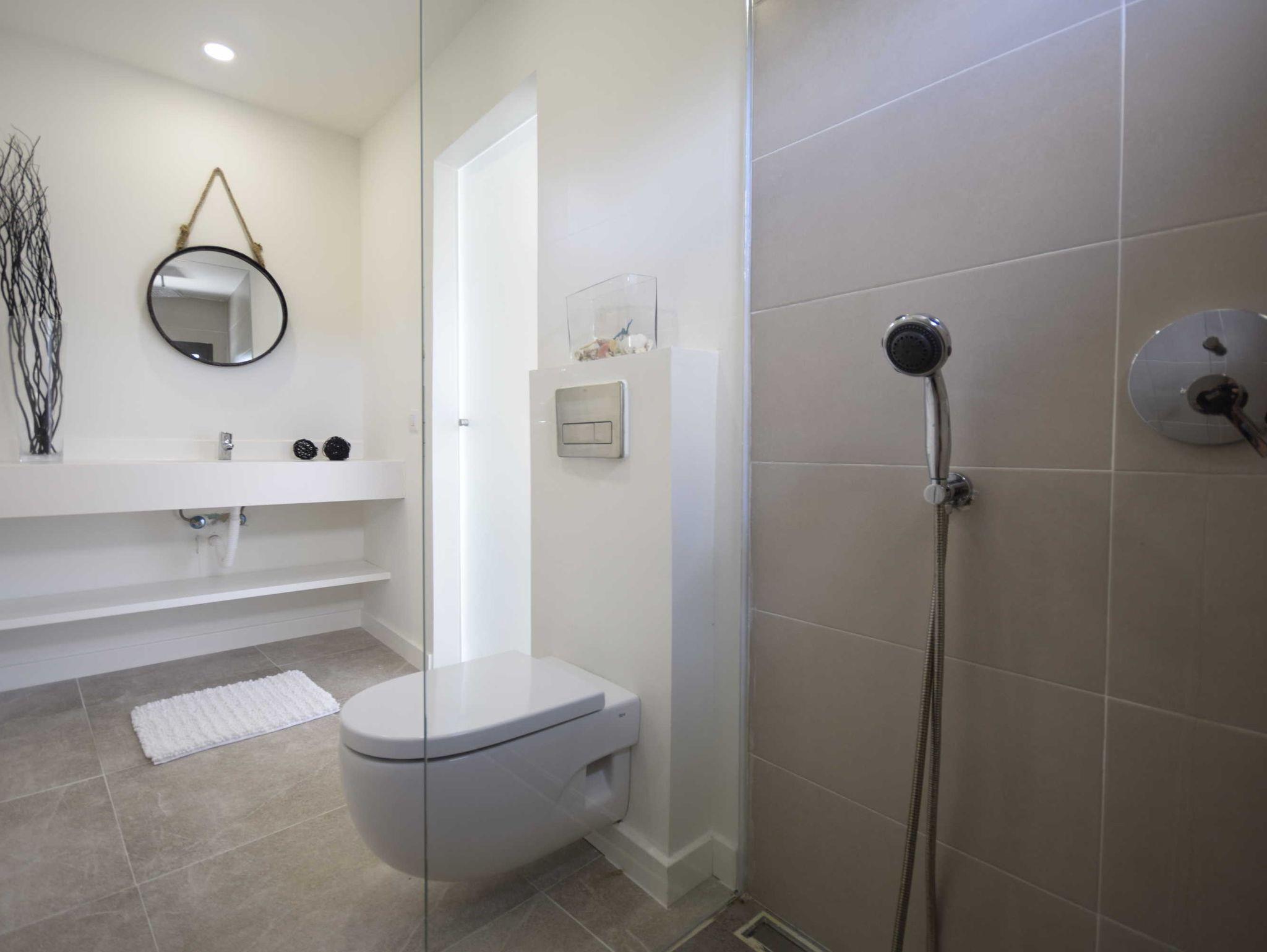 Im Inneren besticht die Villa durch ihre moderne, maritime Einrichtung. Auf der Hauptebene befinden sich ein Schlafzimmer im Zwischengeschoss und ein gemütliches Wohnzimmer mit einem großen Glastisch und beigen Sofas, das sich perfekt zum Entspannen nach einem Tag voller Entdeckungen eignet. Die Küche ist voll ausgestattet mit allen notwendigen Geräten für Ihren Aufenthalt.