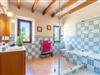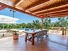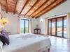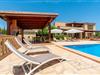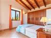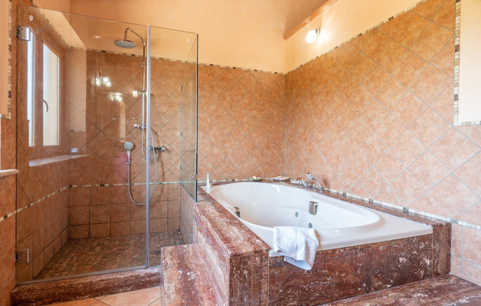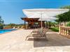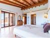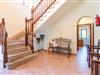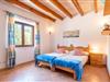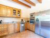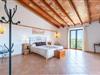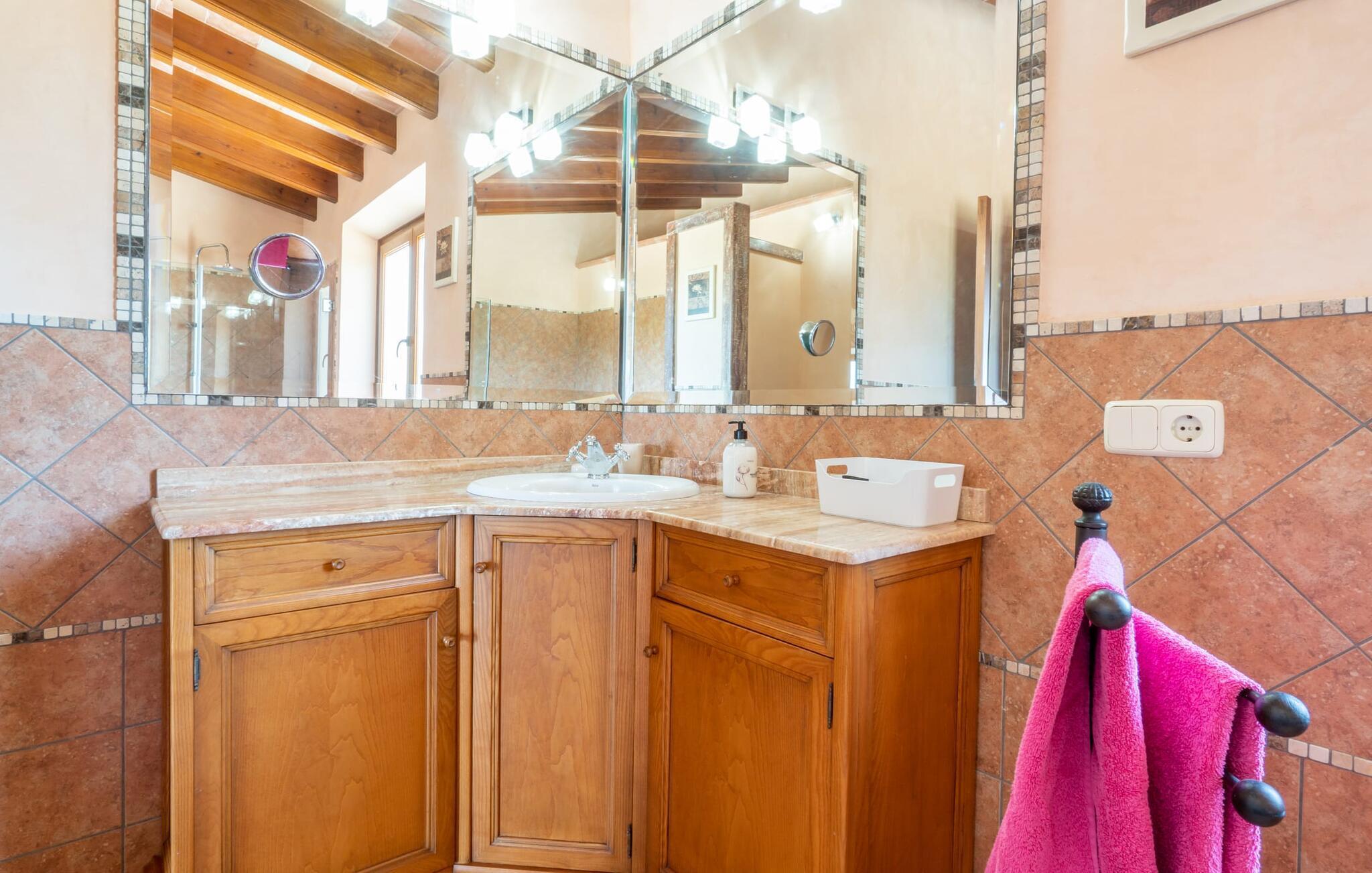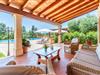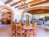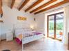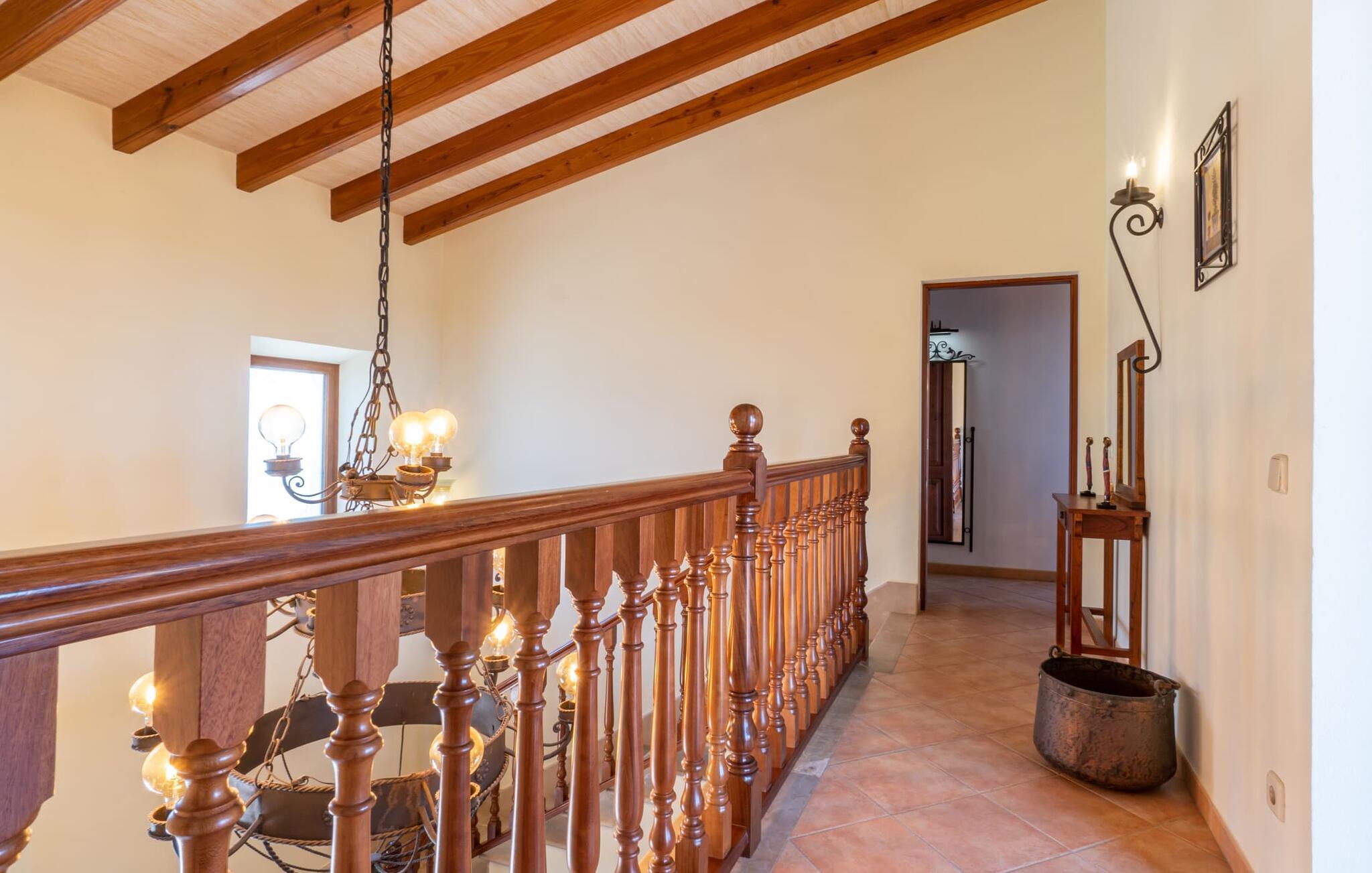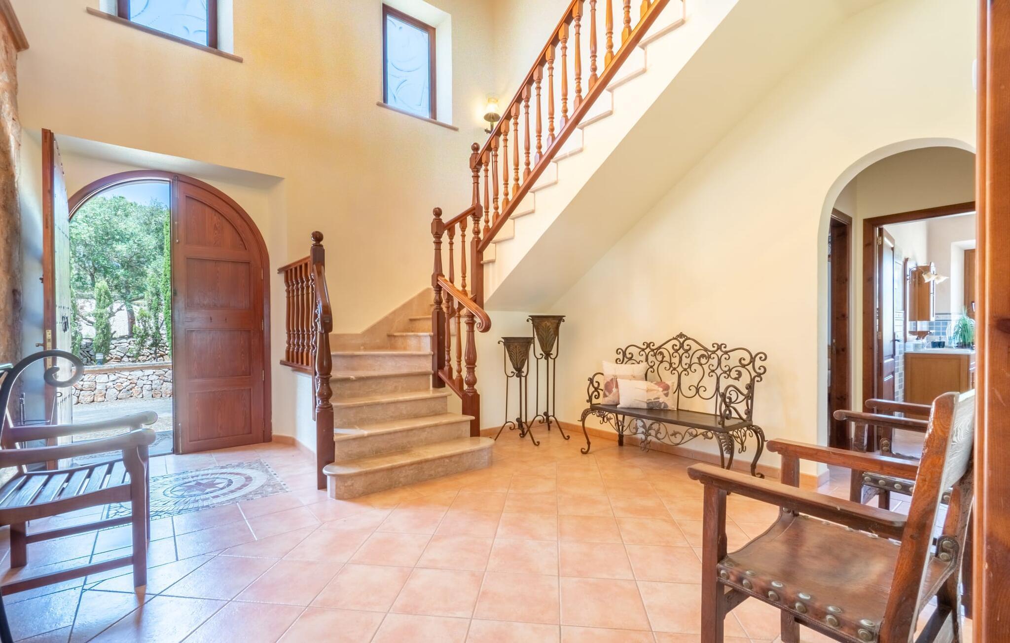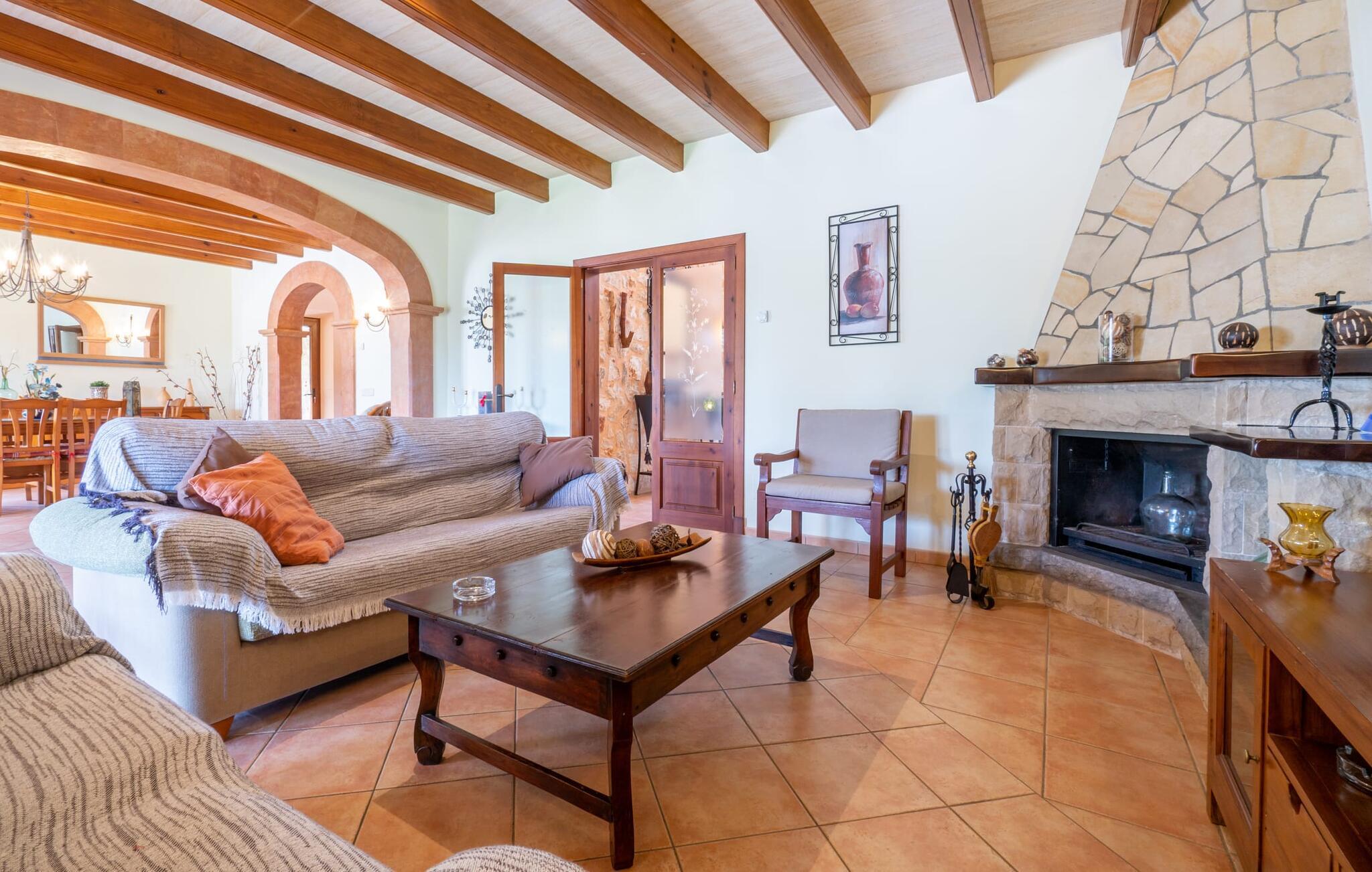 Diese harmonische Einheit setzt sich auch im Inneren fort: Das weitläufige Erdgeschoss mit mallorquinischem Eingangsbereich, modern ausgestatteter Holzküche und großzügigem Wohnbereich ist türenlos verbunden und daher lichtdurchflutet, hohe Bögen schaffen Übergänge von Raum zu Raum. Auch hier spürt man das südliche Lebensgefühl! Rechts vom Eingang befindet sich ein separates Schlafzimmer mit Bad. Der Kamin mit Fernseh-Sitzecke lädt an kühlen Abenden zum Kuscheln und Beisammensein ein. Vom Wohnzimmer gelangt man direkt auf die Terrassen (überdacht und frei) und zum Pool. Sie können den Tag entspannt verbringen und die Zeit zwischen Kühlschrank und Sonnenbad genießen. Wenn später die Kerzen mit den Sternen leuchten, hat ein nächtliches Schwimmen seinen Reiz. Und das Glas Wein glitzert am Beckenrand. Und wer müde wird: Über eine elegante geschwungene Treppe gelangt man in die obere Etage mit zwei gemütlichen, auf das Wesentliche reduzierten Schlafzimmern sowie zwei oder drei Innenbädern. Hier finden Gäste schnell Ruhe; Sie können die vielen Eindrücke des Tages genießen.