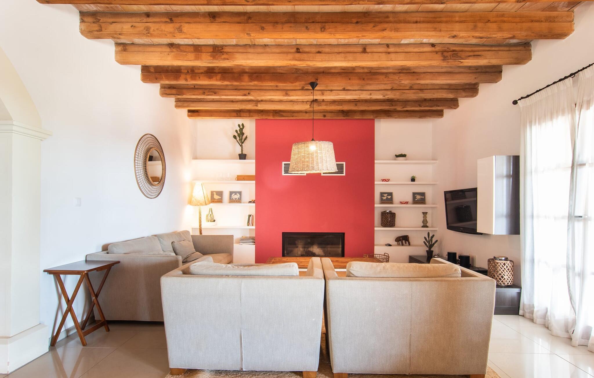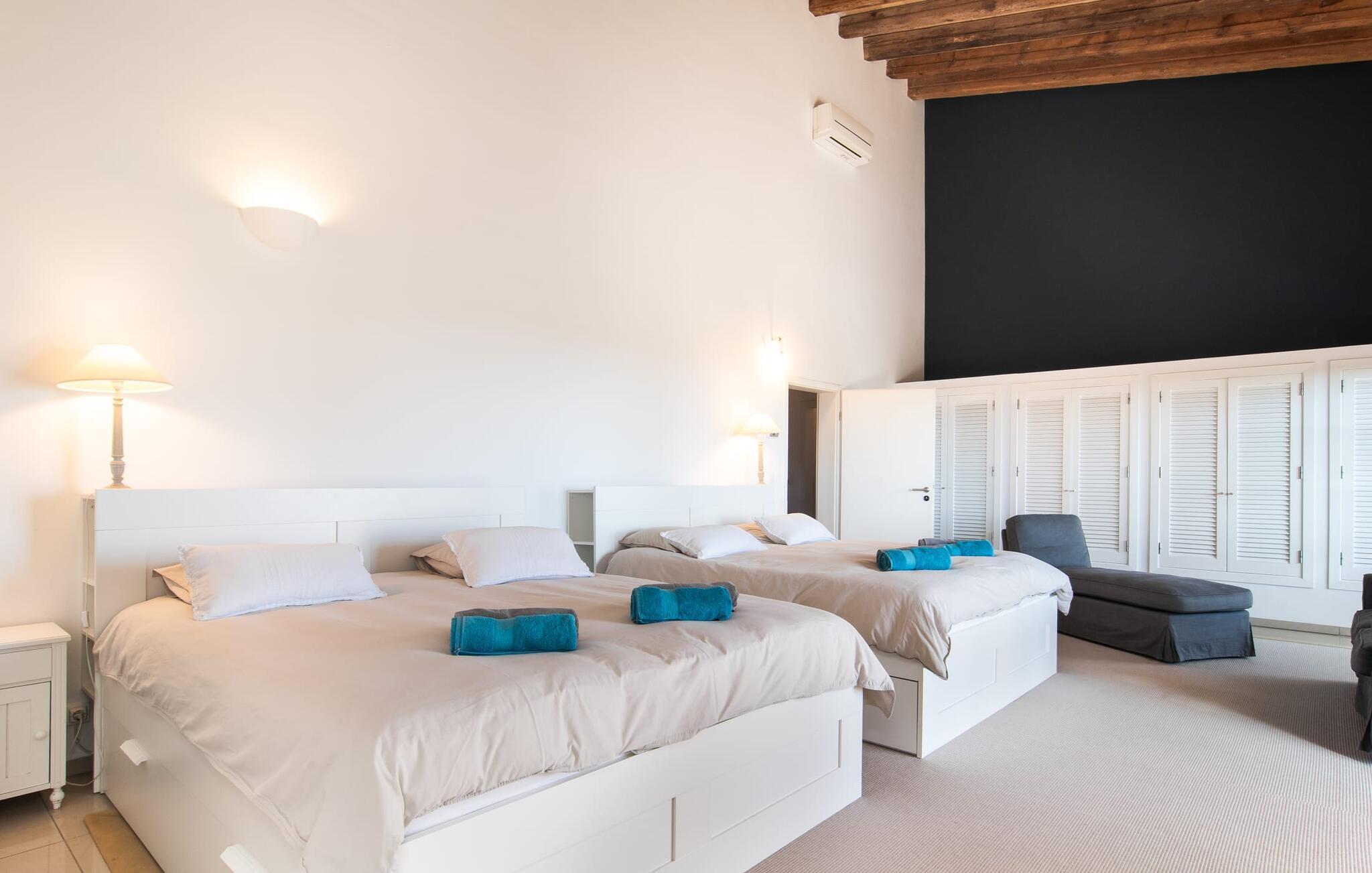 Der elegant eingerichtete Wohnbereich erstreckt sich über zwei Etagen und ist offen gestaltet. Im Erdgeschoss befinden sich eine einladende Eingangshalle, ein gemütliches Wohnzimmer mit Kamin, ein großzügiger Essbereich, eine gut ausgestattete Küche, ein Einzelschlafzimmer und ein Gäste-WC. Über eine Treppe gelangt man auf eine Galerie mit Schreibtisch und Sofa, von der aus man in die Schlafbereiche mit jeweils eigenem Bad gelangt, darunter ein großes Schlafzimmer für vier Personen und zwei Doppelzimmer.