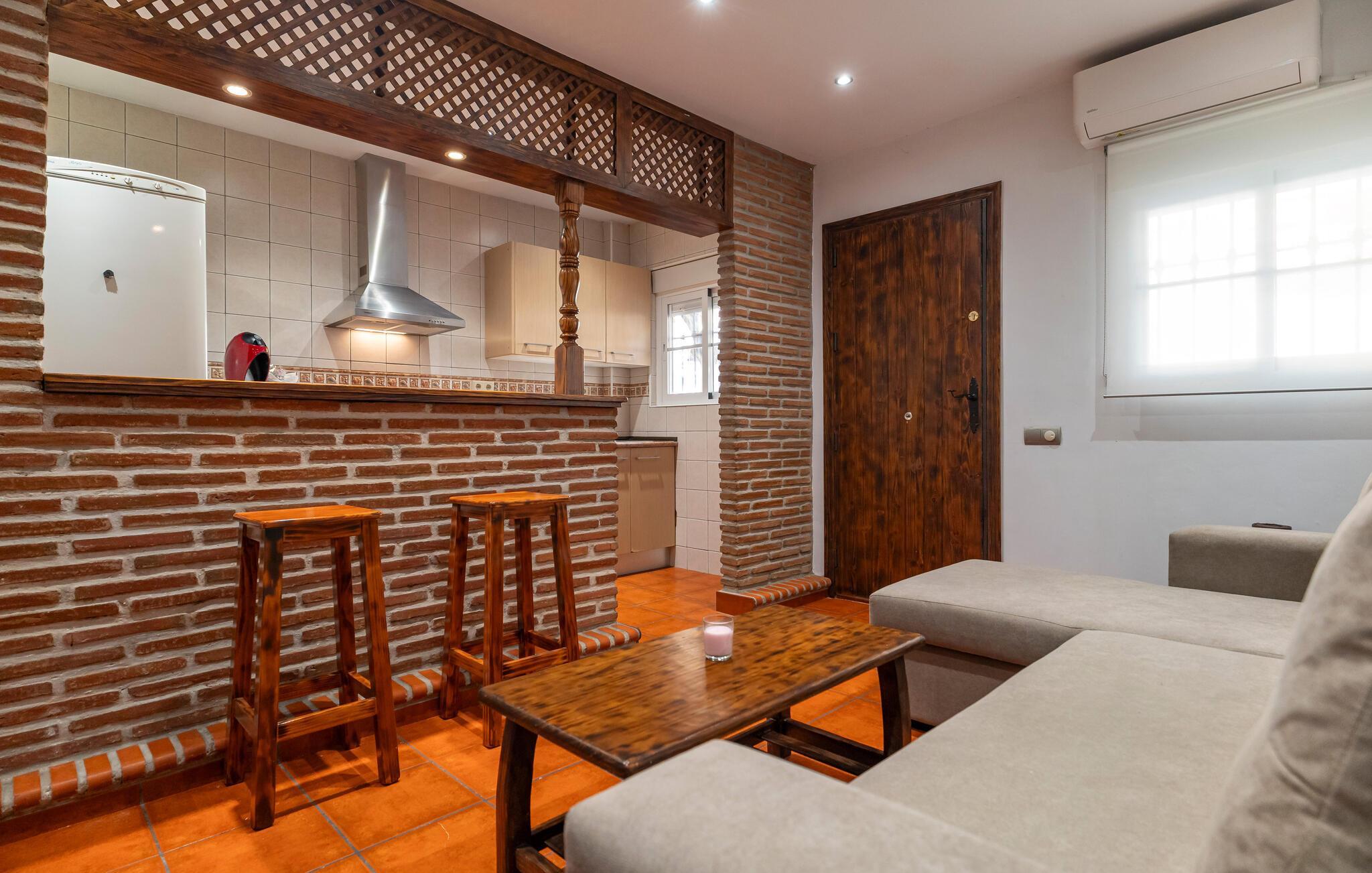 Ihre Unterkunft bietet den idealen Ausgangspunkt für entspannte Urlaubstage an der spanischen Südküste. Genießen Sie die zentrale Lage und das warme Ambiente dieser Wohnung mit rustikalem Stil. Lehnen Sie sich auf dem großen Sofa zurück, schauen Sie Ihre Lieblingsserie oder planen Sie den nächsten Tagesausflug. Die offene Küche mit gemauerter Theke ist nicht nur ein optisches Highlight, sondern auch praktisch ausgestattet. Nehmen Sie Ihre Mahlzeiten direkt an der Theke ein oder lassen Sie den Abend hier bei einem Glas Wein ausklingen.