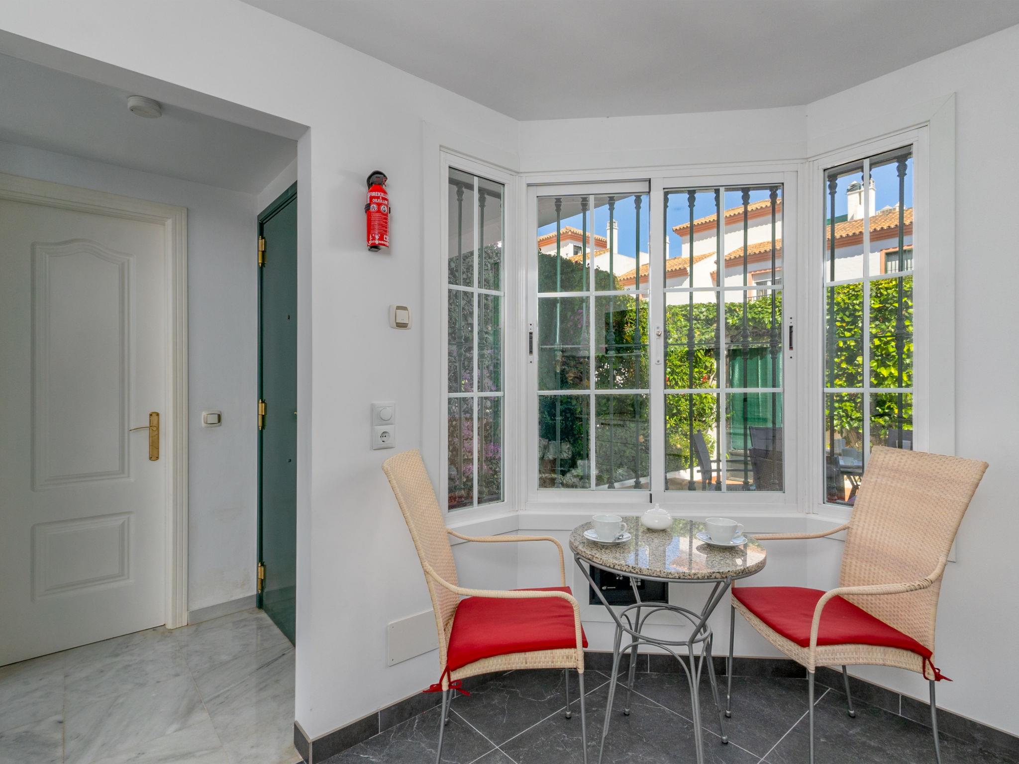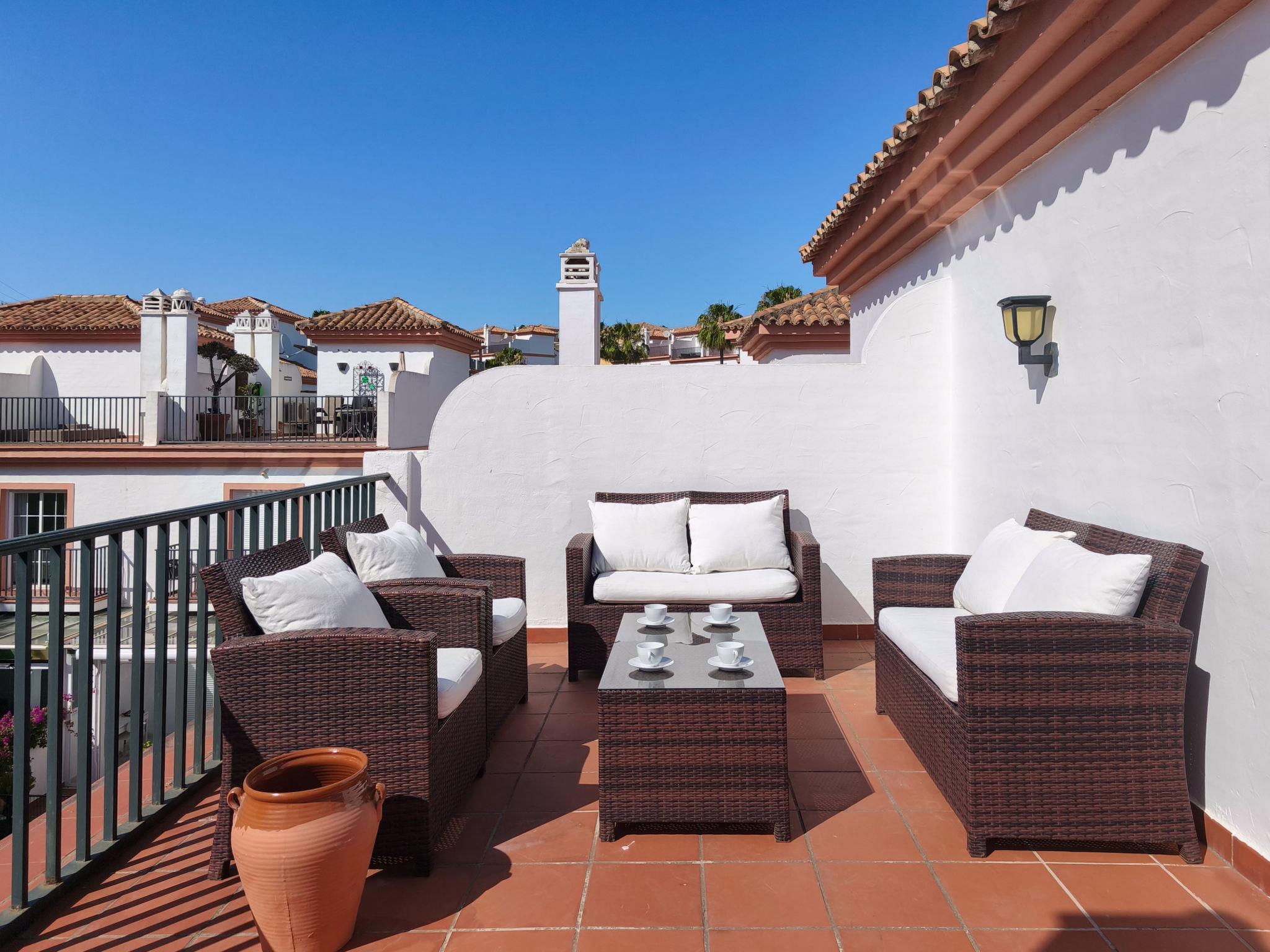 Cabopino: Schönes Reihenhaus "Las lomas de Cabopino", Baujahr 2002. 14 km vom Zentrum von Marbella, 17 km vom Zentrum von Fuengirola, ruhige Lage, 1 km vom Meer, 1 km vom Strand. Zur Mitbenutzung: Garten mit Rasen, Schwimmbad (saisonale Verfügbarkeit: 01.Jan. - 31.Dez. Öffnungszeiten Schwimmbad: 08:00-22:00). Kinderbecken, Einzelgarage. Einkaufsgeschäft 3 km, Supermarkt 3 km, Restaurant 300 m, Bushaltestelle "Camping Cabopino" 250 m, Sandstrand 1 km. Sporthafen 1 km, Golfplatz (19 Loch) 1.9 km. Bitte beachten: geeignet für Familien. Der Besitzer akzeptiert keine Jugendgruppen. Die Nachbarschaft ist sehr lärmempfindlich. Ruhe und gutes Benehmen wird erwartet.
