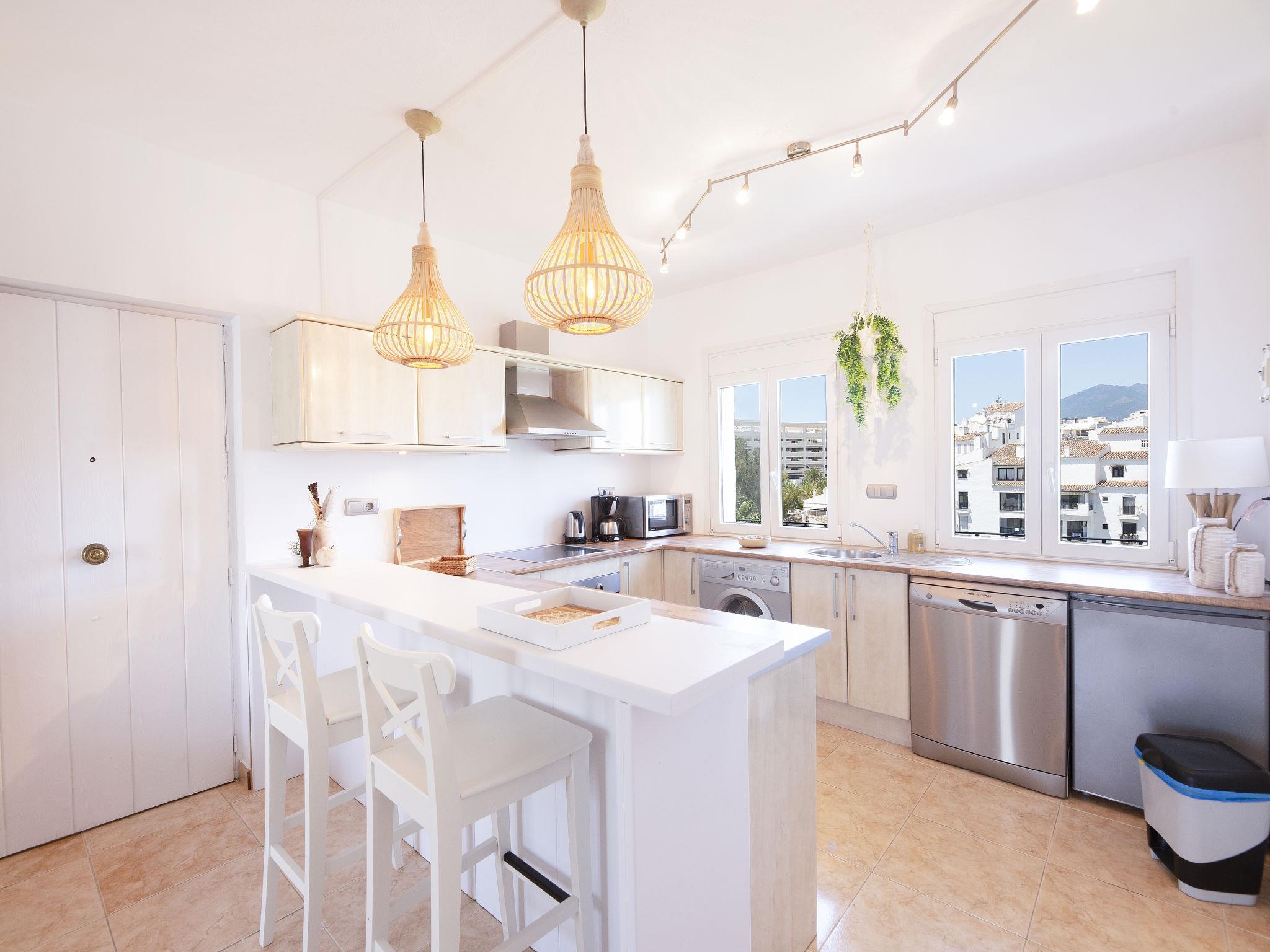 "Puerto Banus OPQ", 3-Zimmer-Wohnung 115 m2 im 5. Stock. Schön und stilvoll eingerichtet: Wohn-/Esszimmer mit Digital-TV. Ausgang zur Loggia. 1 Zimmer mit 1 franz. Bett (160 cm, Länge 200 cm). 1 Zimmer mit 1 franz. Bett (180 cm, Länge 200 cm). Offene Küche (Backofen, Geschirrspüler, 4 Glaskeramikplatten, Toaster, Wasserkocher, Mikrowelle, Tiefkühler, elektrische Kaffeemaschine). Bad/WC, Dusche/WC. Klimaanlage, Warmluftheizung. Terrasse überdacht. Terrassenmöbel. Sicht auf das Meer und den Hafen. Zur Verfügung: Waschmaschine, Bügeleisen, Kinderhochstuhl, Haartrockner. Internet (WLAN, gratis). VUT/MA32059 // Reg. Nr.: ESFCTU00002904100041964000000000000000000VUT/MA320593
