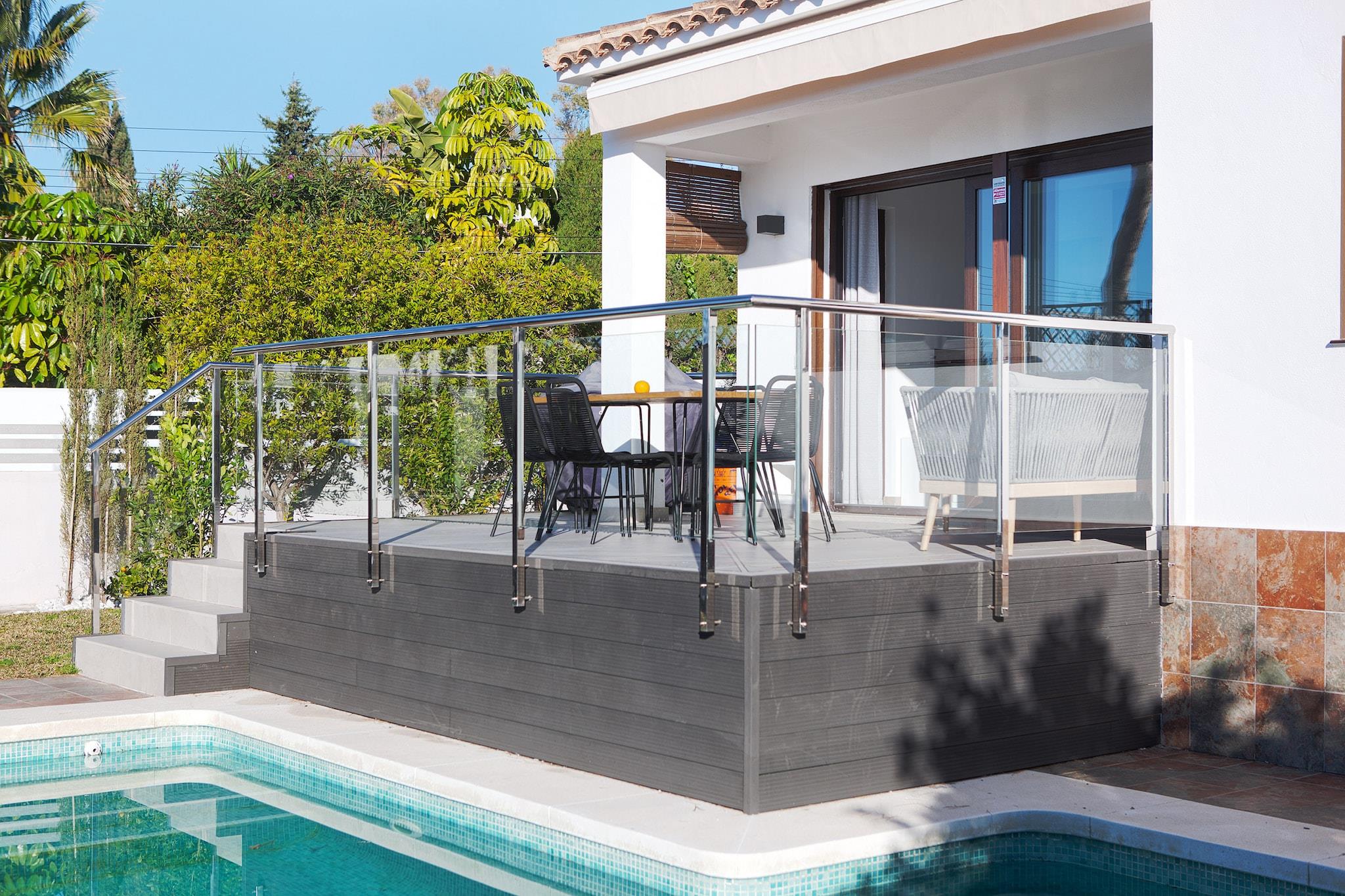 Dieses moderne und stilvolle Ferienhaus verfügt über drei Schlafzimmer und bietet Platz für bis zu sechs Gäste. Es bietet wichtige Annehmlichkeiten wie Klimaanlage, Zentralheizung und einen privaten Swimmingpool. Gäste können im Wohnbereich entspannen, die Außenterrasse genießen und die Aussicht vom Balkon aus genießen. Das Anwesen ist haustierfreundlich und verfügt über eine Waschmaschine, einen Grill, einen Kamin und WLAN. Zu den Unterhaltungsmöglichkeiten gehört Satellitenfernsehen in mehreren Sprachen. Das Anwesen ist ideal gelegen, nur 150 Meter von der nächsten Bushaltestelle und nur 300 Meter vom Strand entfernt. Ein Golfplatz ist 800 Meter entfernt und Restaurants erreichen Sie nach 150 Metern. Supermärkte sind 500 Meter entfernt und das Stadtzentrum ist eine kurze 3-km-Fahrt entfernt. Der nächste Flughafen ist 45 km entfernt und bietet Reisenden eine einfache Anbindung. Das Anwesen ist mit einer voll funktionsfähigen Küche ausgestattet, die moderne Geräte wie einen Induktionsherd, einen Kühlschrank, eine Mikrowelle, einen Backofen, einen Gefrierschrank und einen Geschirrspüler umfasst, was es ideal für die Zubereitung von Mahlzeiten zu Hause macht. Die Küche ist außerdem komplett mit Geschirr, Besteck, Utensilien und kleinen Geräten wie einer Kaffeemaschine, einem Toaster, einem Wasserkocher und einer Saftpresse ausgestattet, sodass das Kochen ganz bequem von zu Hause aus erledigt werden kann.