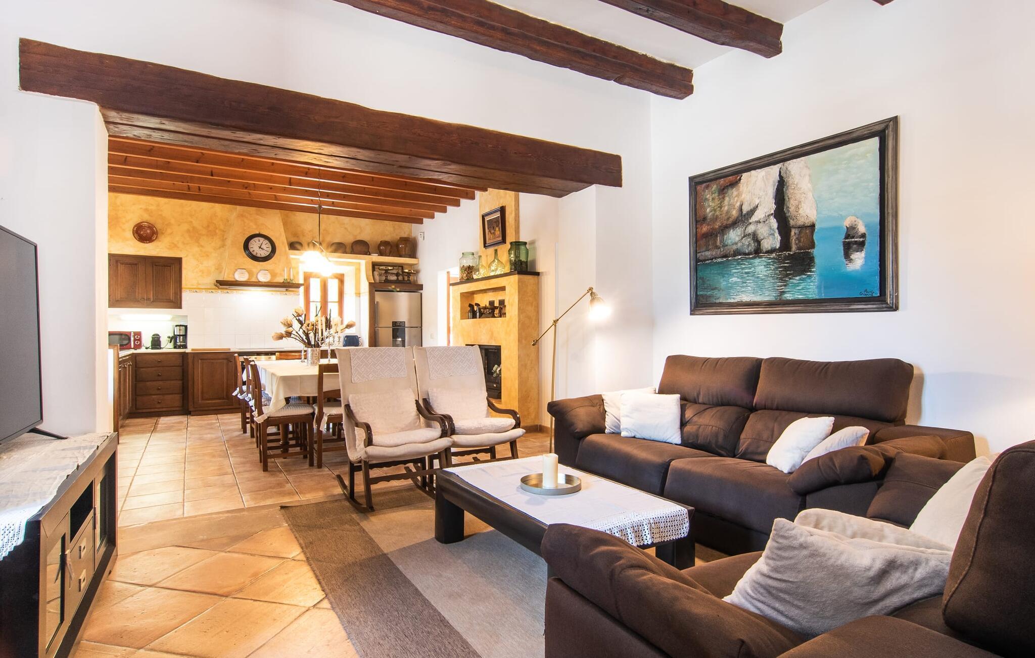 Die gepflegte Neubauvilla mit dem Charme eines mallorquinischen Landanwesens bietet eine fabelhafte Aufteilung, perfekt, wenn Sie mit zwei oder mehr Familien reisen. Das Haus bietet auf beiden Etagen eine komplette Einrichtung mit jeweils einem Wohnzimmer und einer Küche, so dass Sie trotz einiger Trennung den Urlaub gemeinsam verbringen können. Im Erdgeschoss liegt die Landhausküche mit Kamin neben dem Essbereich und grenzt an den offenen Wohnbereich. Die Möbel sind von hoher Qualität und werden traditionell mit antiken Möbeln ergänzt. Die Inneneinrichtung wirkt sehr modern, mit einem Hauch Nostalgie. Ein Klavier ergänzt das ansprechende „Ensemble des Parterres“, das außerdem über zwei exquisit eingerichtete Schlafzimmer mit viel Stauraum sowie ein modernes Badezimmer mit Badewanne und Dusche verfügt. Im Obergeschoss finden Sie eine ähnliche Einrichtung mit einem Wohnzimmer, einer sehr modernen, voll ausgestatteten Küche, die um eine gesellige Kochinsel herum angeordnet ist, sowie einem Kamin. Drei klimatisierte Schlafzimmer mit bequemen Doppelbetten sowie ein modernes Duschbad vervollständigen diese autarke Wohneinheit, die sich somit perfekt für eine zweite Familie eignet. Im Obergeschoss gibt es außerdem einen überdachten Balkon mit Poolblick, auf dem Sie angenehme Stunden mit schöner Aussicht verbringen können. Diese Aufteilung verschafft einer größeren Reisegruppe eine sehr angenehme Autonomie – ein Urlaubsrhythmus stört den anderen nicht und die gemeinsame Zeit beim Grillen und Spielen dient lediglich der Entspannung. Kleiner Hinweis: Aufgrund einer aktuellen technischen Einstellung am digitalen Stromzähler müssen die drei Klimageräte nacheinander eingeschaltet werden und können nicht gleichzeitig genutzt werden.