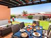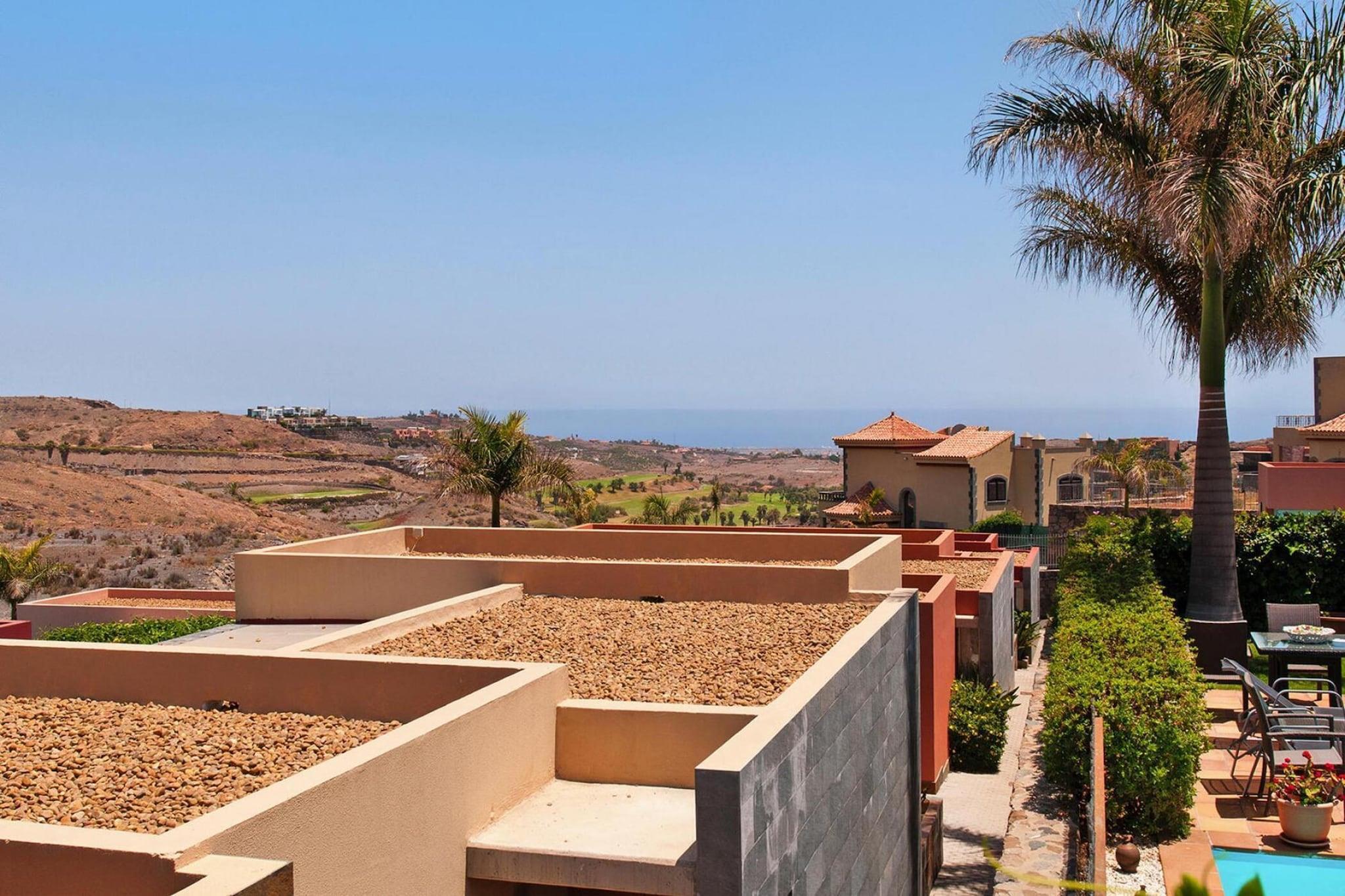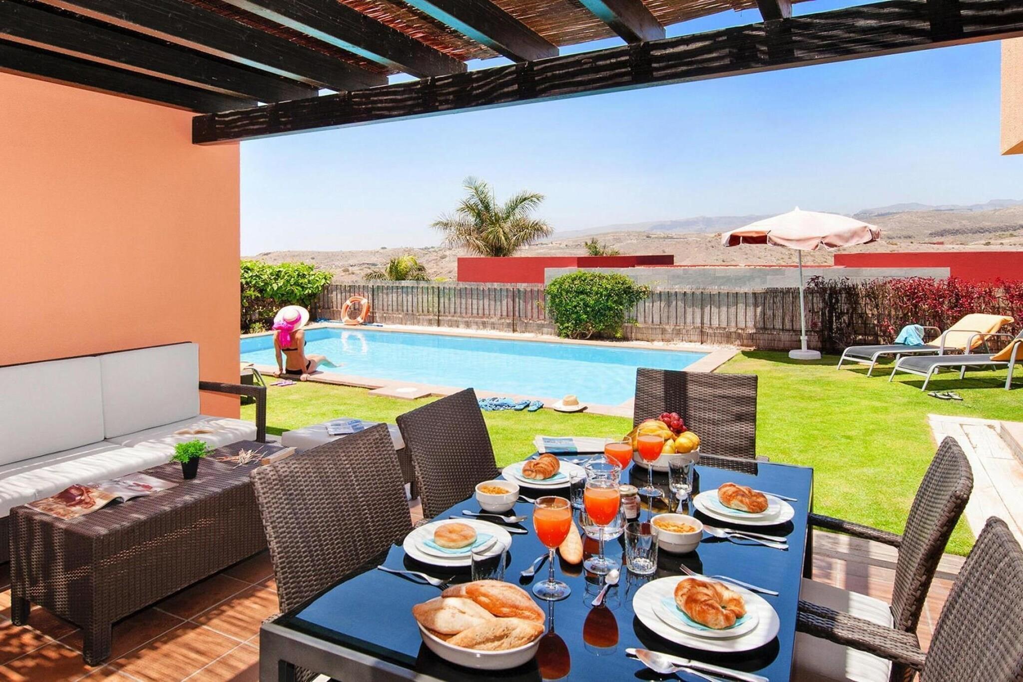 Ferienvilla mit exquisiter Ausstattung und privatem Swimmingpool - ideal, um im Urlaub den gewissen Hauch von Luxus zu genießen. Auf der überdachten Terrasse mit bequemen Loungemöbeln können Sie mit einem gemütlichen Frühstück in den Urlaubstag starten - ein Brötchenservice ist für Sie inklusive. Auf neunzig Quadratmetern finden vier Personen ausreichende Möglichkeiten, um sich auch einmal zurückzuziehen. Die Villa ist mit WLAN (gegen Gebühr), Klimaanlage und deutschsprachigem SAT-TV ausgestattet, sodass einem unbeschwerten Aufenthalt nichts im Wege steht. Der charmante Wohnkomplex mit mehreren Villen ist wunderbar in die Berglandschaft von Maspalomas eingebettet. Für den täglichen Bedarf können Sie sich im nahen kleinen Supermarkt versorgen, aber natürlich gibt es auch ein Restaurant. Derzeit können Gäste den Golfplatz Nord und Süd nutzen. Der Golfplatz Süd (18-Loch) hat auf einer Lauflänge von 6.112 Metern, ein Par von 71 Schlägen. Der Golfplatz Nord (18-Loch) verfügt über eine Lauflänge von 5.524 Metern und hat ein Par von 72 Schlägen. Gäste der Villen erhalten eine Greenfee-Ermäßigung. Mobilität: nicht geeignet für Personen mit eingeschränkter Mobilität