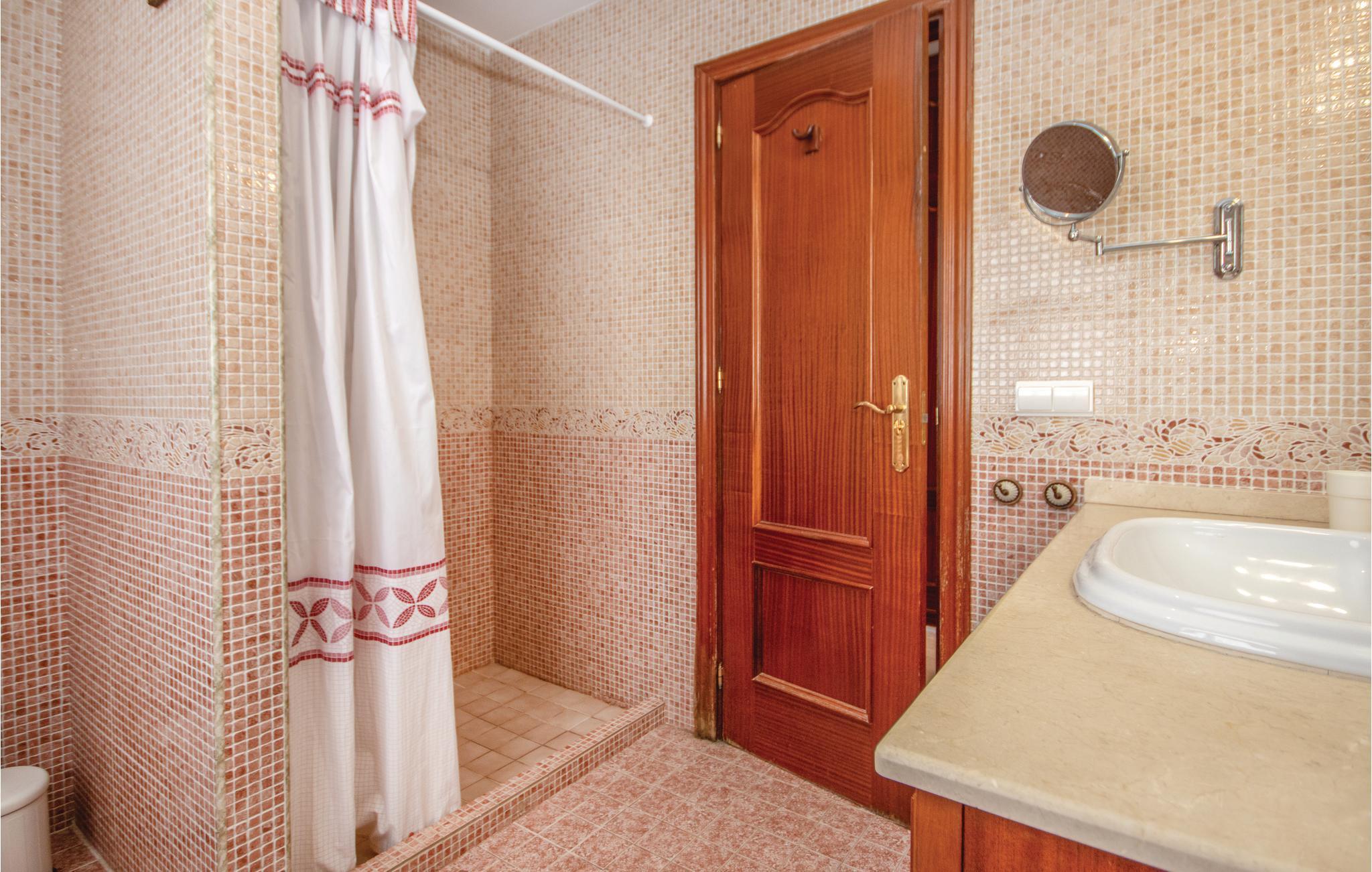 Das Anwesen ist über den Flur zugänglich, bis Sie das Wohnzimmer mit Fernseher und Kamin, eine offene Küche / Esszimmer, eine Gästetoilette und eines der 5 Doppelzimmer erreichen. Dieses Schlafzimmer ist mit einem Doppelbett, Zugang zur Terrasse und einem eigenen Bad ausgestattet. Im Erdgeschoss befindet sich ein Schlafzimmer mit zwei Einzelbetten und eigenes Bad mit Dusche, sowie direkter Zugang zur Hauptterrasse und zum Poolbereich. Ein geräumiges Wohnzimmer / Spielbereich mit Tischtennisplatte, Billardtisch, TV und Spielekonsole. Das Erdgeschoss hat auch einen Küchenbereich und ein Badezimmer mit 3 Duschen. Von hier aus haben Sie direkten Zugang zur überdachten Terrasse, den offenen Terrassen und dem Poolbereich.
