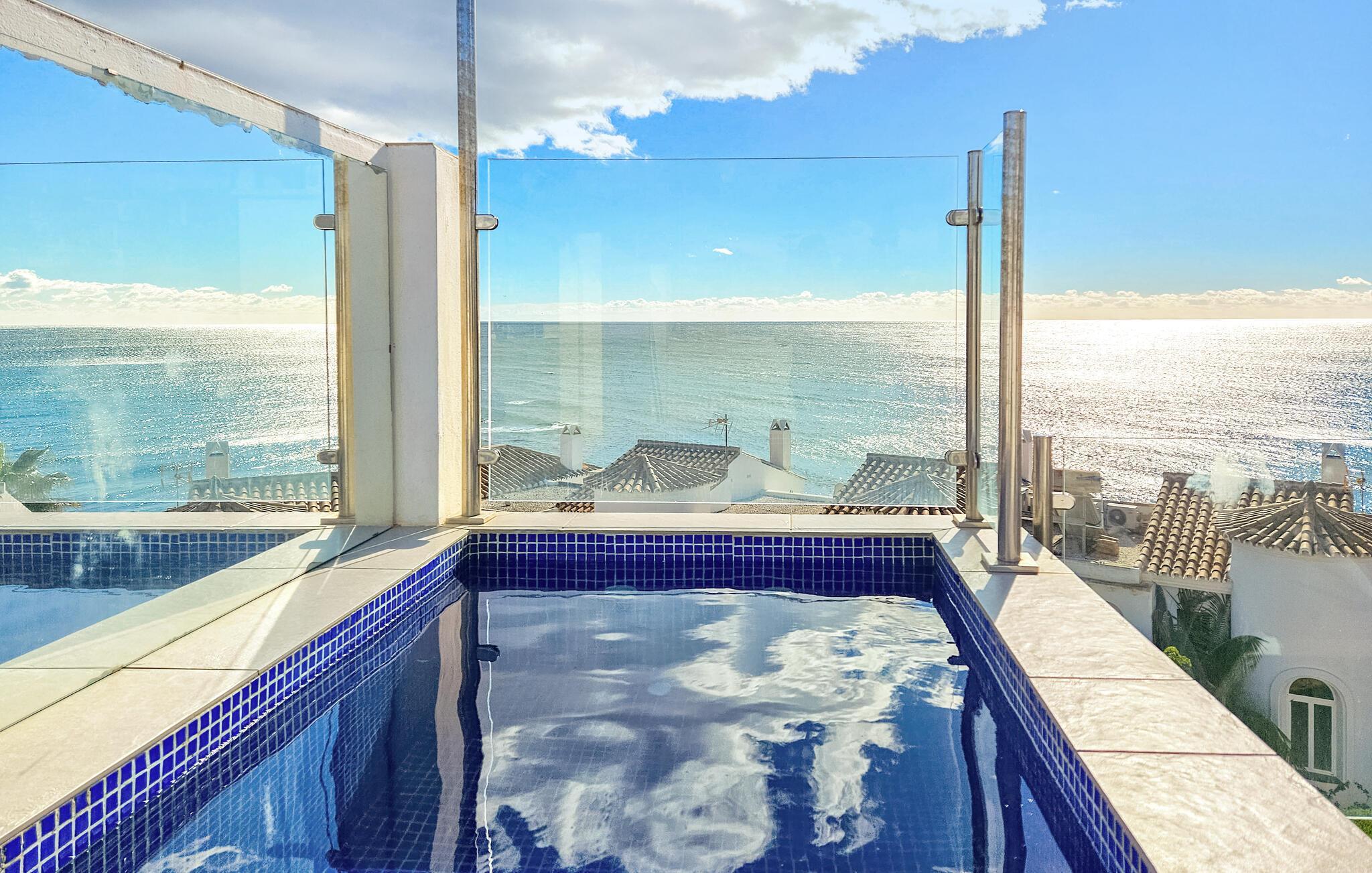 Treten Sie aus dem Loungebereich auf die Terrasse mit fantastischem Meerblick und genießen Sie in vollen Zügen die Sonne. Vom Wohnzimmer aus führt eine Wendeltreppe zur Dachterrasse. Entspannen Sie in bequemen Sonnenliegen, erfrischen Sie sich im Tauchbecken und beobachten Sie bei kalten Getränken den spektakulären Sonnenuntergang über dem Meer.