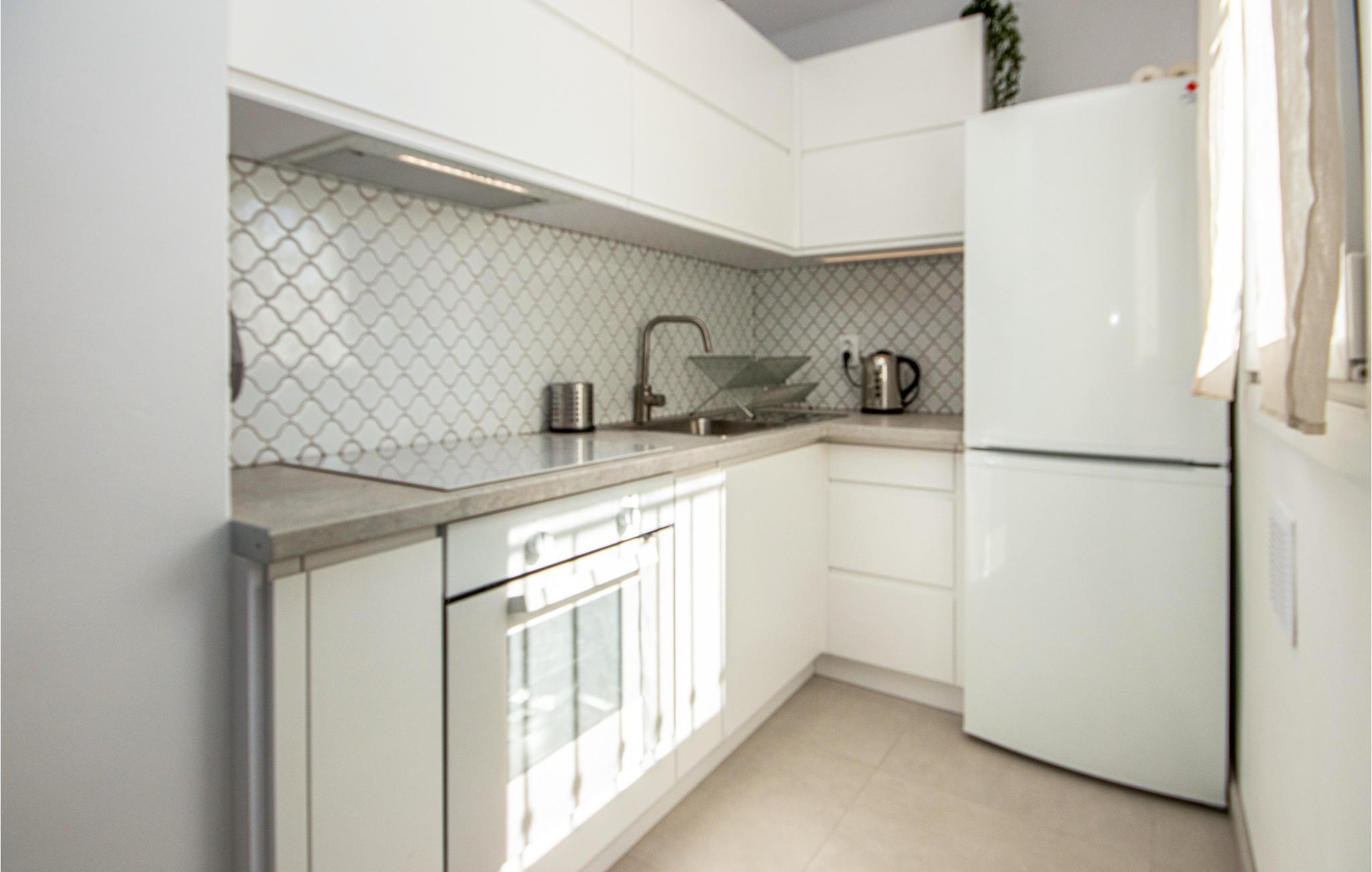 Die Wohnung erstreckt sich über eine Etage und bietet ein Wohn- und Esszimmer, eine verglaste Innenterrasse und eine separate Küche, die gut ausgestattet ist und über ein Fenster mit Blick in die Gärten bietet. Die verglaste Innenterrasse ist wie ein Wohnzimmer mit zwei gemütlichen Sesseln und einem Tisch eingerichtet. Das Wohnzimmer ist mit einem Esstisch mit Stühlen und einer Klimaanlage (warm/kalt), großen Zoll-Fernseher und kostenfreies WLAN ausgestattet.