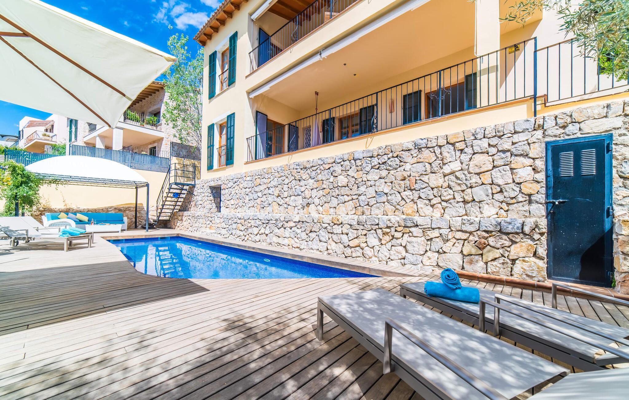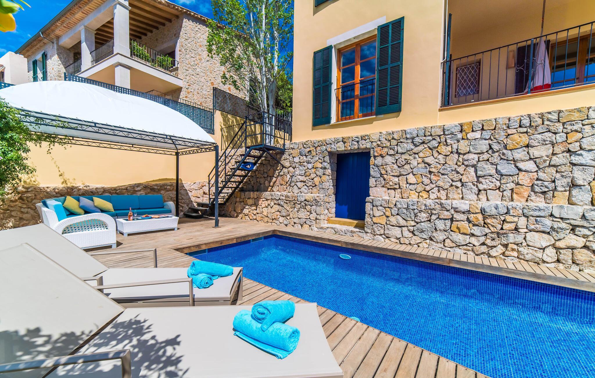 „Mama, Papa, können wir hier bleiben?“ Die Wahrscheinlichkeit, dass Ihre Kleinen das sagen, ist groß, denn die Finca „Mofares“ bietet alles, was das Kinderherz begehrt: ein Klettergerüst, eine Schaukel und ein großes Trampolin. Sie müssen sich in diesem Urlaub nicht auf die Suche nach einem Spielplatz begeben, sondern nur in den Garten. Das sind von Anfang an die perfekten Voraussetzungen, um auch Sie alle Vorteile dieser Unterkunft genießen zu können. Beginnen wir mit der großen Terrasse im Obergeschoss, von der aus Sie einen herrlichen Blick auf das Zentrum des malerischen Städtchens Calvià haben. Mit einem Glas mallorquinischem Wein in der Hand können Sie von hier aus die Gegend erkunden: Werfen Sie Ihren Blick über die traditionellen ockerfarbenen Häuser bis zu den beiden kleinen Türmen der Kirche Sant Joan, hinter denen Sie die sanfte Silhouette erkennen können aus der Tramuntata-Reihe. Willkommen in Ihrem Urlaub! Hier oben könnte man wahrscheinlich ewig bleiben, wäre da nicht die bezaubernde Pergola mit Chill-out-Sofabereich direkt neben dem Pool, die so verlockend aussieht. Wenn Sie etwas Zeit für sich alleine haben möchten, können Sie in der Hängematte entspannen, die am Ende des Gartens zwischen zwei knorrigen Bäumen aufgehängt ist.