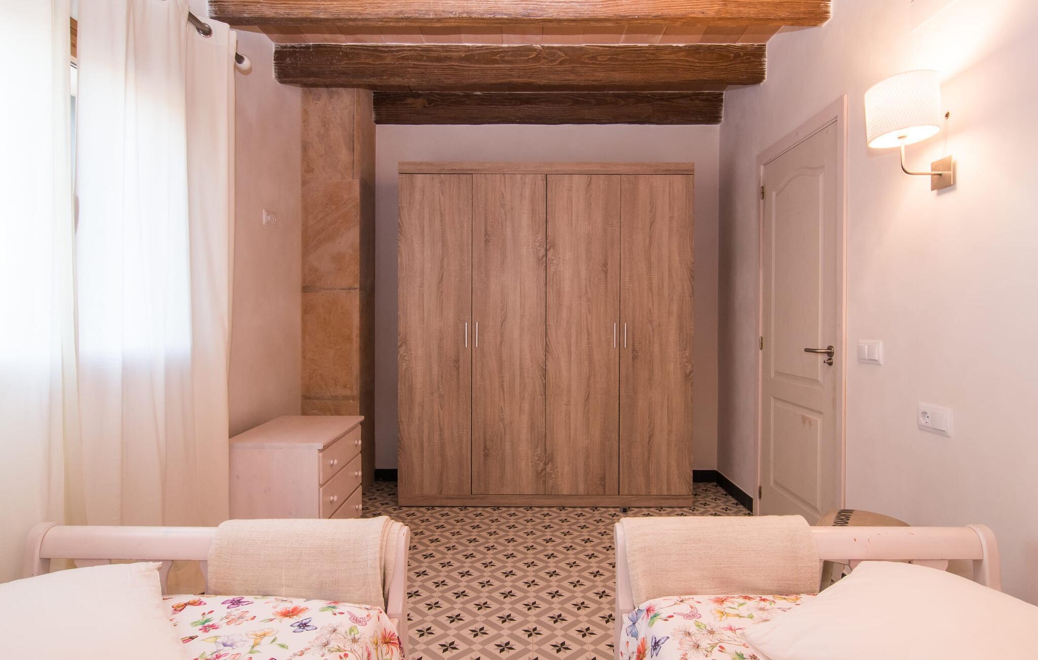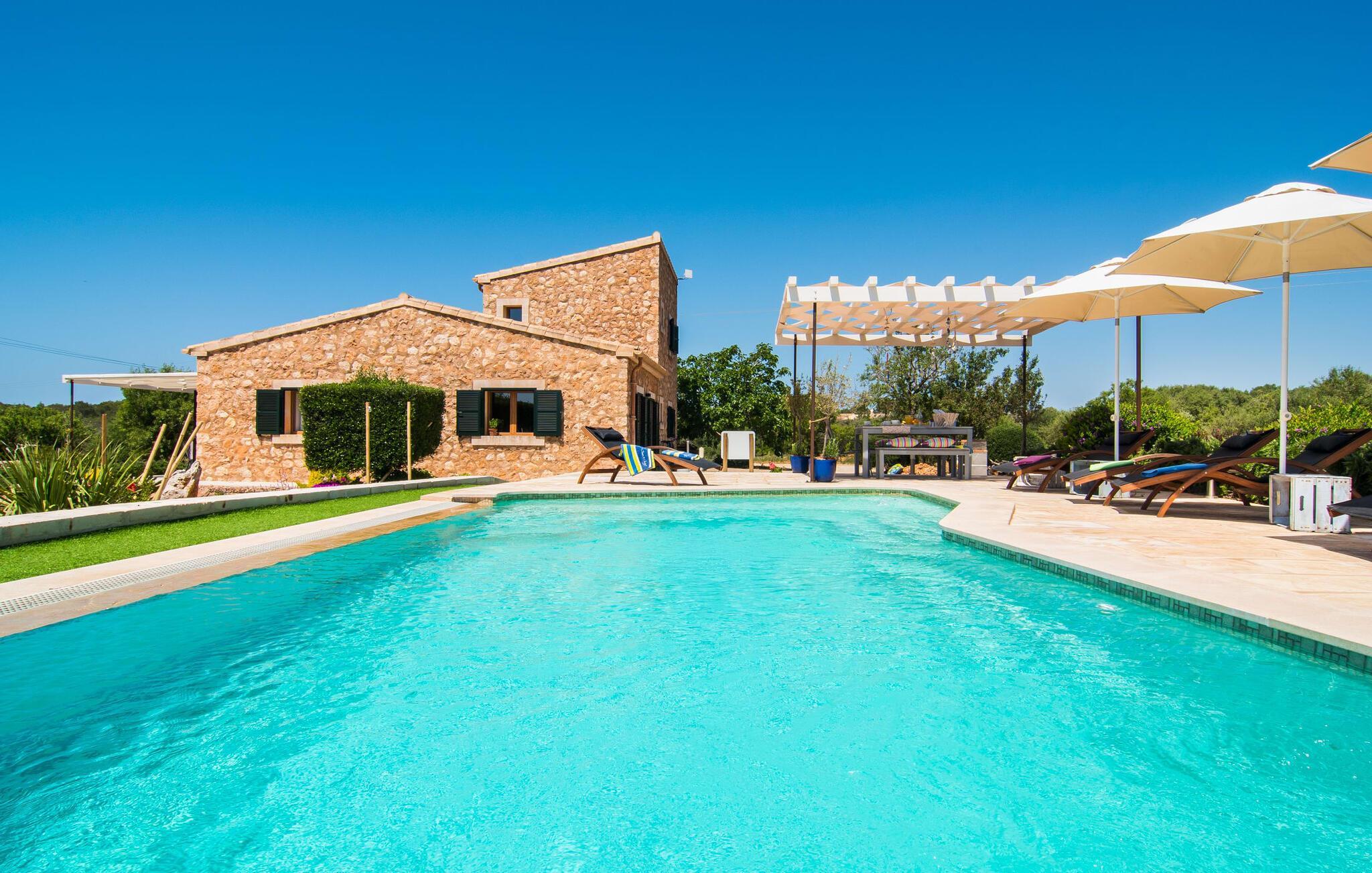 Als wir die Villa „Morell“ besichtigen, erwartet uns eine angenehm weitläufige, teilweise naturbelassene Landschaft, in deren Mitte ein malerisches, von Terrassen umgebenes Haus liegt. Schnell wird uns klar, dass die Eigentümer viel Liebe und Sorgfalt in die Gestaltung und Einrichtung dieser Villa gesteckt haben. Die Terrasse am Haus ist mit einer Markise ausgestattet und wir entdecken schnell, dass es sich hier wunderbar zum Sitzen im Freien eignet. Dies ist ein Ort, an dem Sie eine Weile verweilen und in die Ferne blicken können. Es ist auch ein großartiger Ort, um gemeinsam mit allen zu essen. Praktischerweise ist es auch der beste Ort, um das leicht erhöhte Becken im Auge zu behalten – und auch die Kinder, die unterwegs im Wasser planschen. Große, breite Stufen führen hinunter in den türkis schimmernden Pool – ein herrlicher Ort, um warme Sommertage zu verbringen. Egal, ob Sie im Wasser herumtollen oder ein paar Runden drehen, hier finden Sie immer eine Möglichkeit, sich abzukühlen und zu erfrischen. Unter den Sonnenschirmen bieten Liegestühle den perfekten Platz für ruhige Entspannungssitzungen, bei denen Sie einfach mal die Seele baumeln lassen können. Überlegen Sie sich vor Ihrem Urlaub ein gutes Buch und nehmen Sie es zusammen mit einem kühlen Getränk mit nach draußen, damit Sie Ihren Urlaub im Freien so angenehm wie möglich genießen können. Auf der gegenüberliegenden Seite des Hauses gibt es eine weitere Terrasse, die mit eleganten Stühlen und einem interessanten Tisch aus Versandpaletten ausgestattet ist. Diese recht originelle Art, die Terrasse in zwei Zonen zu unterteilen, ermöglicht die gleichzeitige Nutzung verschiedener Bereiche, sodass Sie auch innerhalb Ihrer Gruppe ganz einfach etwas Privatsphäre haben.