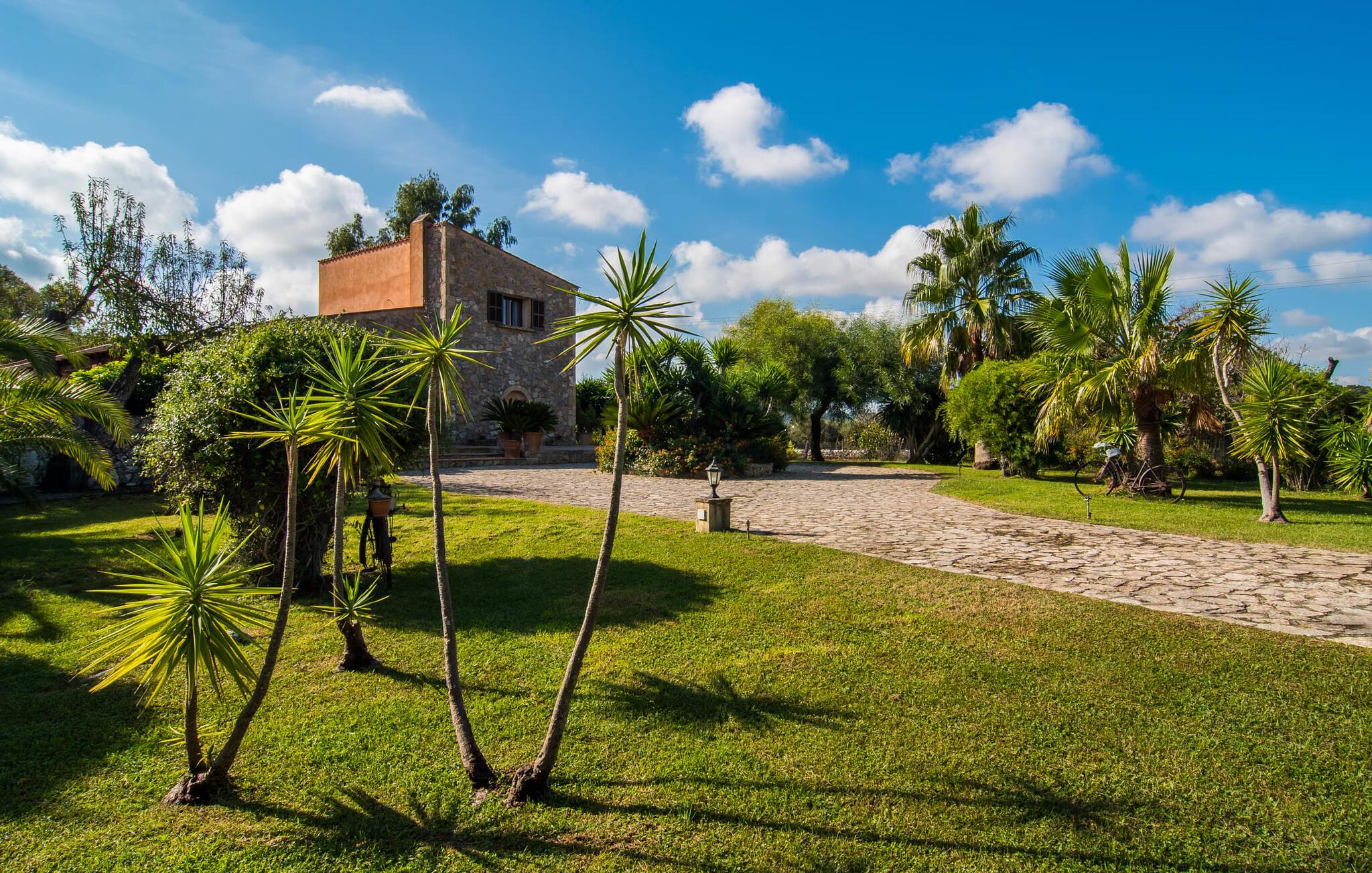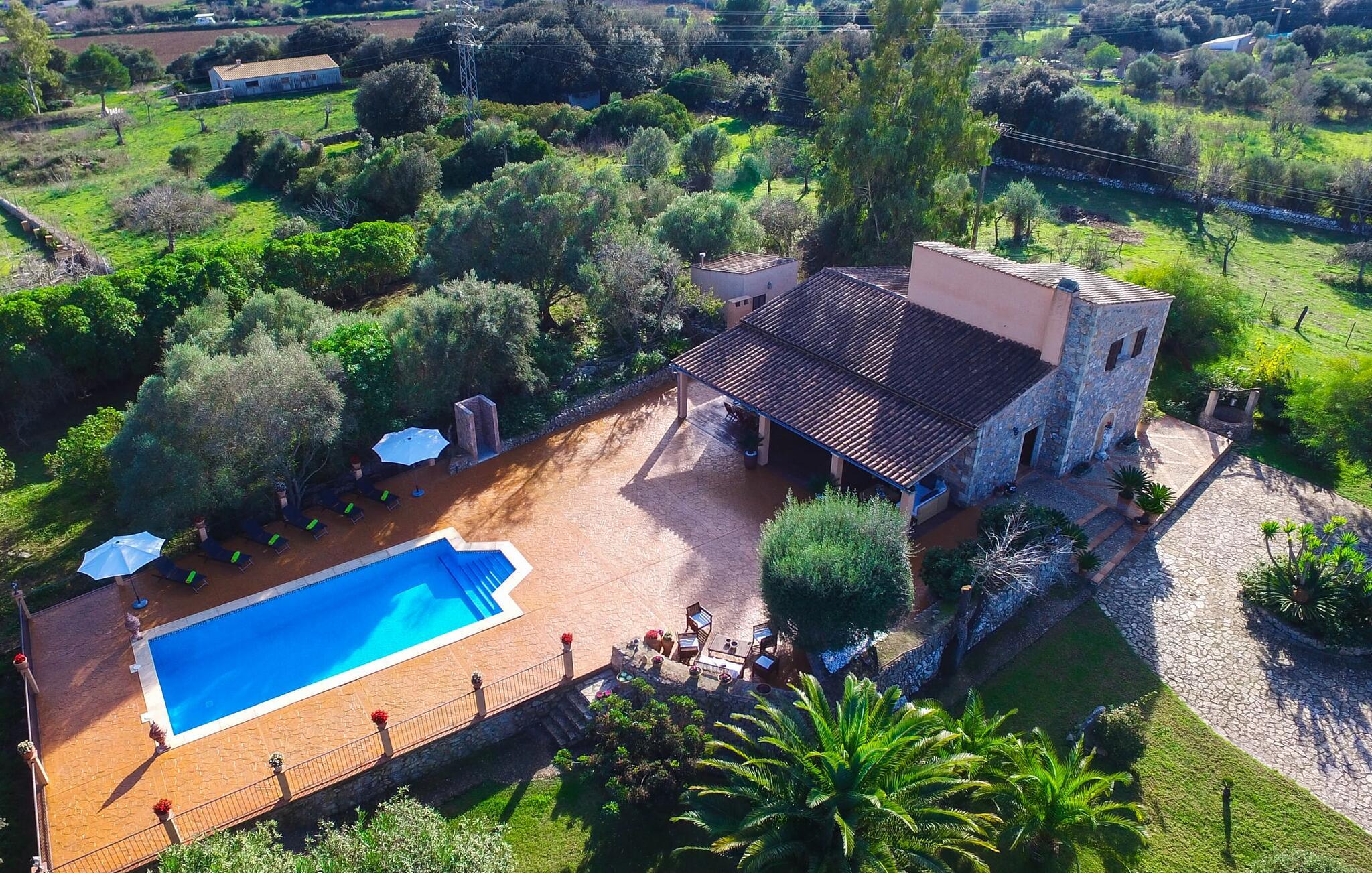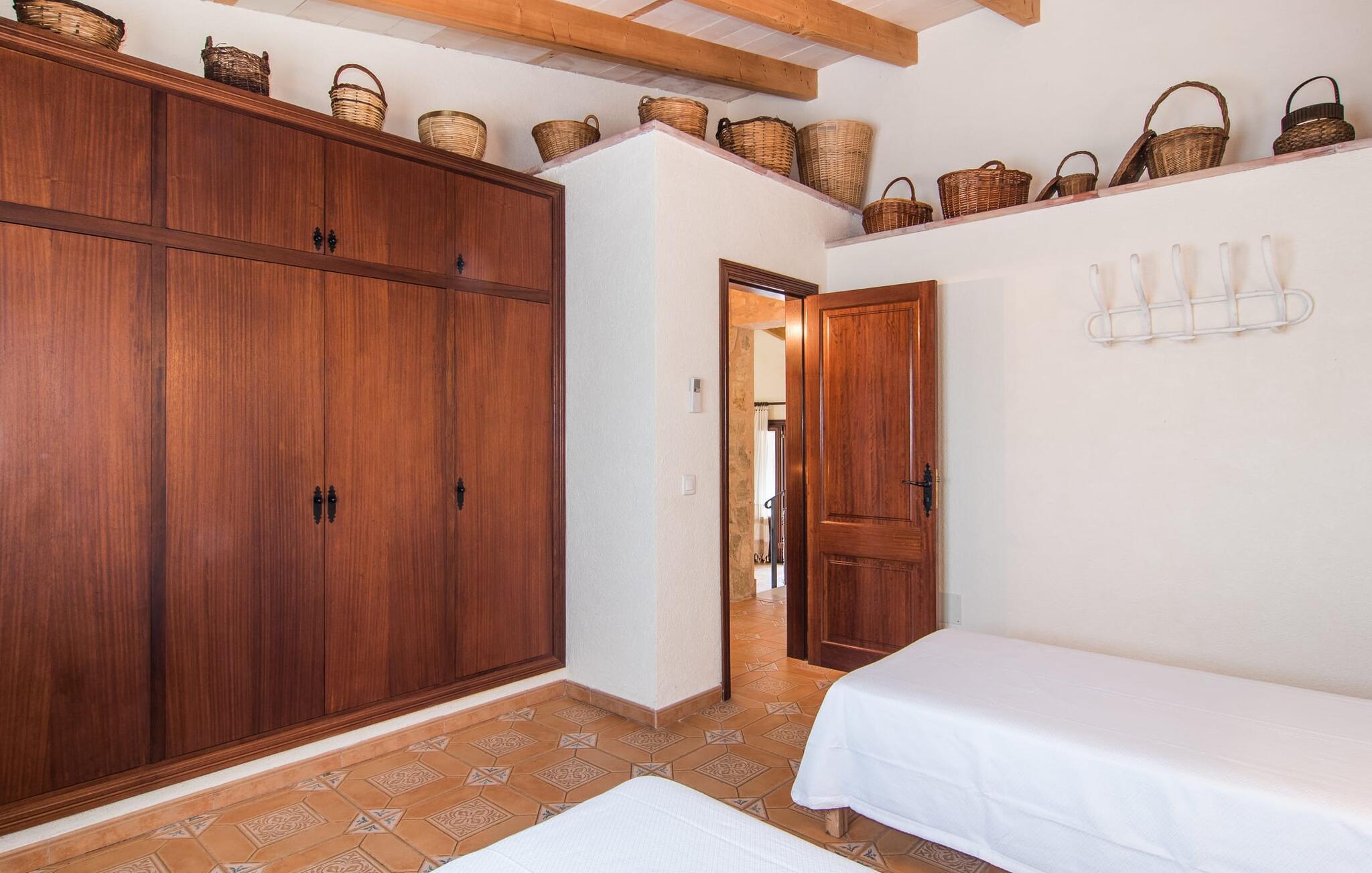 Im Inneren wechseln sich Natursteinmauern mit hell und freundlich weiß getünchten Wänden ab. Das unter massiven Holzbalkendecken eingebettete Wohnzimmer ist der ideale Ort, um ein paar entspannte Stunden auf dem Ecksofa zu verbringen und sich dabei vor dem modernen Fernseher für eine Weile nach Hause zu holen. Die grün geflieste Küche nebenan ist eine weitere Gelegenheit, sich beim Zubereiten Ihrer Köstlichkeiten wie zu Hause zu fühlen. Andererseits verbringen Sie Ihren Urlaub auf einer wunderschönen Insel und in einem wunderschönen Haus, das mit seiner Inneneinrichtung viel von der ursprünglichen Atmosphäre des ländlichen Insellebens vermittelt. Schnappen Sie sich also Töpfe und Pfannen und lassen Sie Ihren Gaumen die mallorquinische Lebensart entdecken. Die Küche ist mit einem Backofen, einem Kühlschrank, einer Mikrowelle, einer Waschmaschine und einem Geschirrspüler ausgestattet – alle modernen Annehmlichkeiten stehen Ihnen zur Verfügung. Luxuriöse Fußbodenheizung sowie Klimaanlage sorgen dafür, dass Sie Ihren Urlaub bei idealer Temperatur genießen können. Auch die Möblierung der drei gemütlichen Doppelzimmer passt perfekt zum antiken Charakter des Hauses. Eines der Schlafzimmer ist mit zwei Einzelbetten ausgestattet und bietet somit vielfältige Übernachtungsmöglichkeiten. Das Badezimmer ist außerdem mit einem Bidet und einer Badewanne ausgestattet.