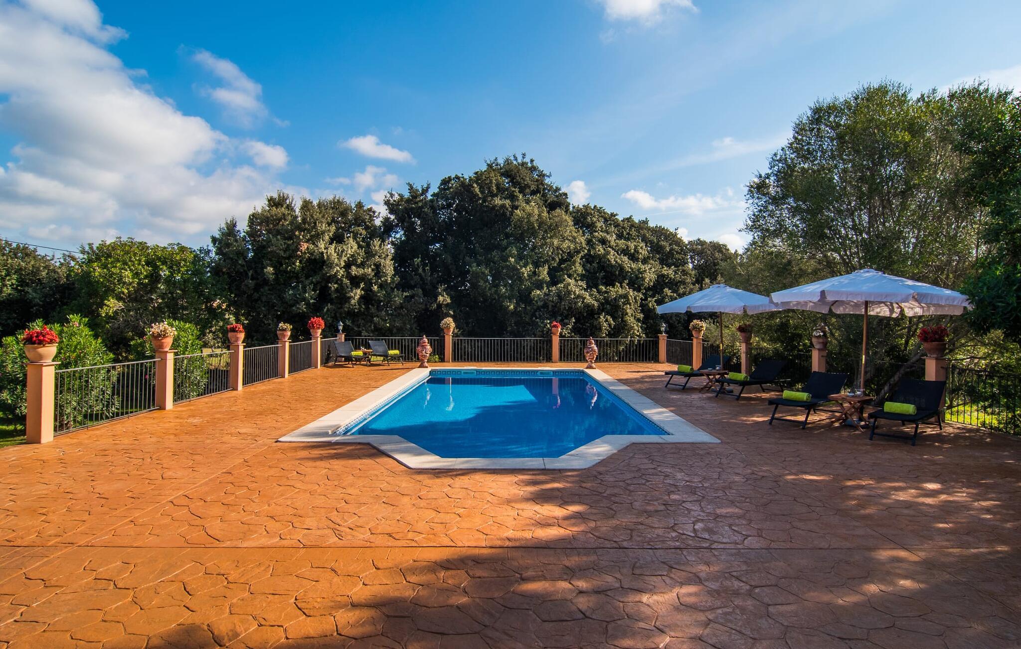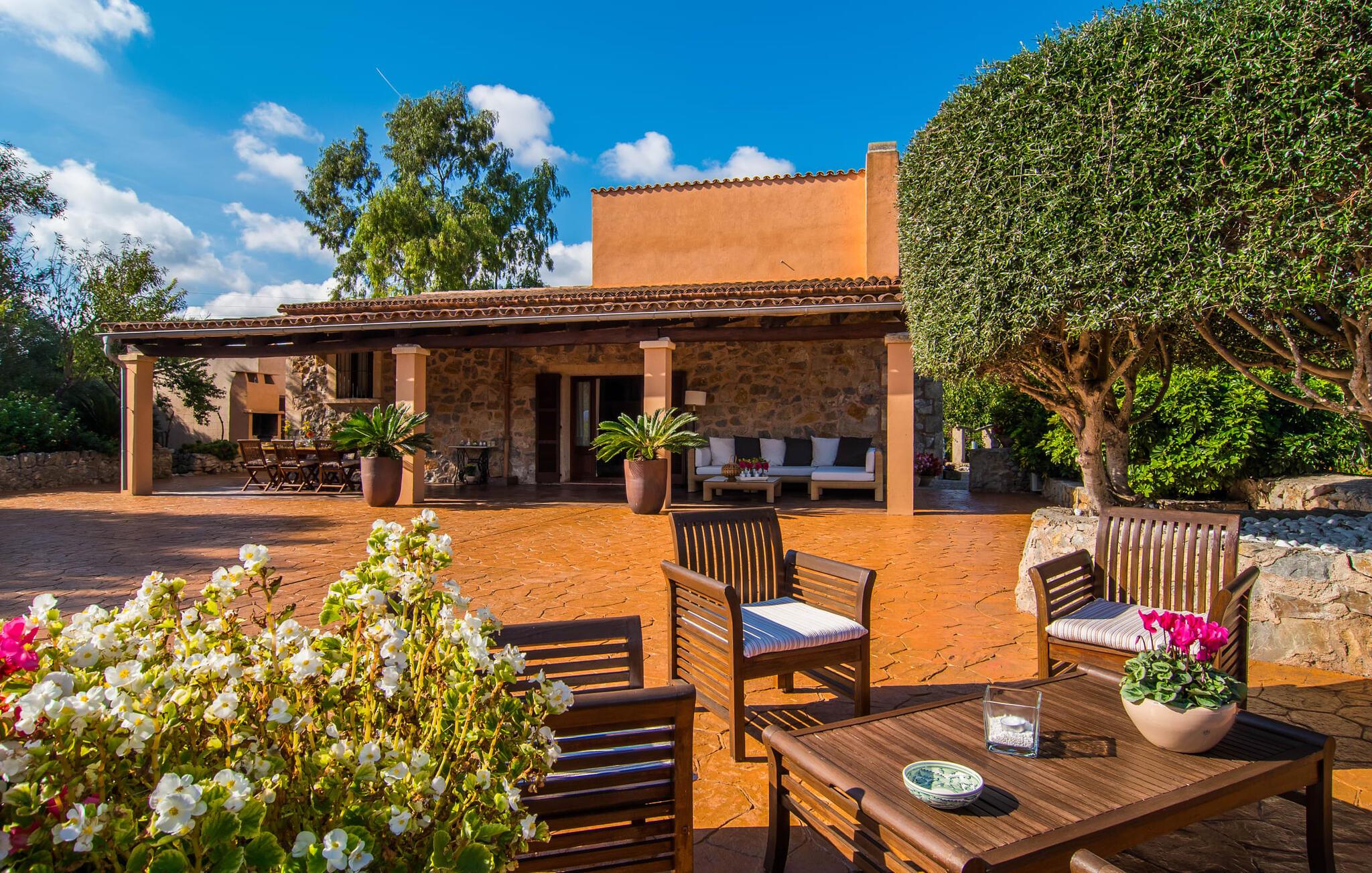 Sie mögen warme Terrakotta-Töne? Dann werden Sie diese Villa lieben! Hat man den großen Garten betreten und folgt dem Steinweg hinunter zum Eingang, sind es nur noch wenige Schritte, bis man den attraktiven Ruhebereich mit großzügigem Pool, Sonnenterrasse für sonnenhungrige Sonnenanbeter und einem fest installierten Grill mit ausreichend Platz erreicht für Ihre Mahlzeiten. Hier können bis zu sechs Personen plus Baby einen echten Traumurlaub genießen – die an eine Oase erinnernde Begrünung des Grundstücks mit einer Vielzahl unterschiedlicher Pflanzen vermittelt sofort ein Gefühl der Entspannung. Auch die große überdachte Terrasse ist mit ihrem gemütlichen Sofa und dem großen Esstisch äußerst gemütlich und ein idealer Ort, um eine Gartenparty zu veranstalten oder einfach bis spät in die Nacht zu sitzen und die milde Inselluft zu genießen. Das Anwesen eignet sich auch perfekt für einen kleinen Spaziergang zum Brunnen oder um einige der aufwendigen Details wie den „Fahrradskulpturenpark“ oder eine der Steinstatuen zu bestaunen.