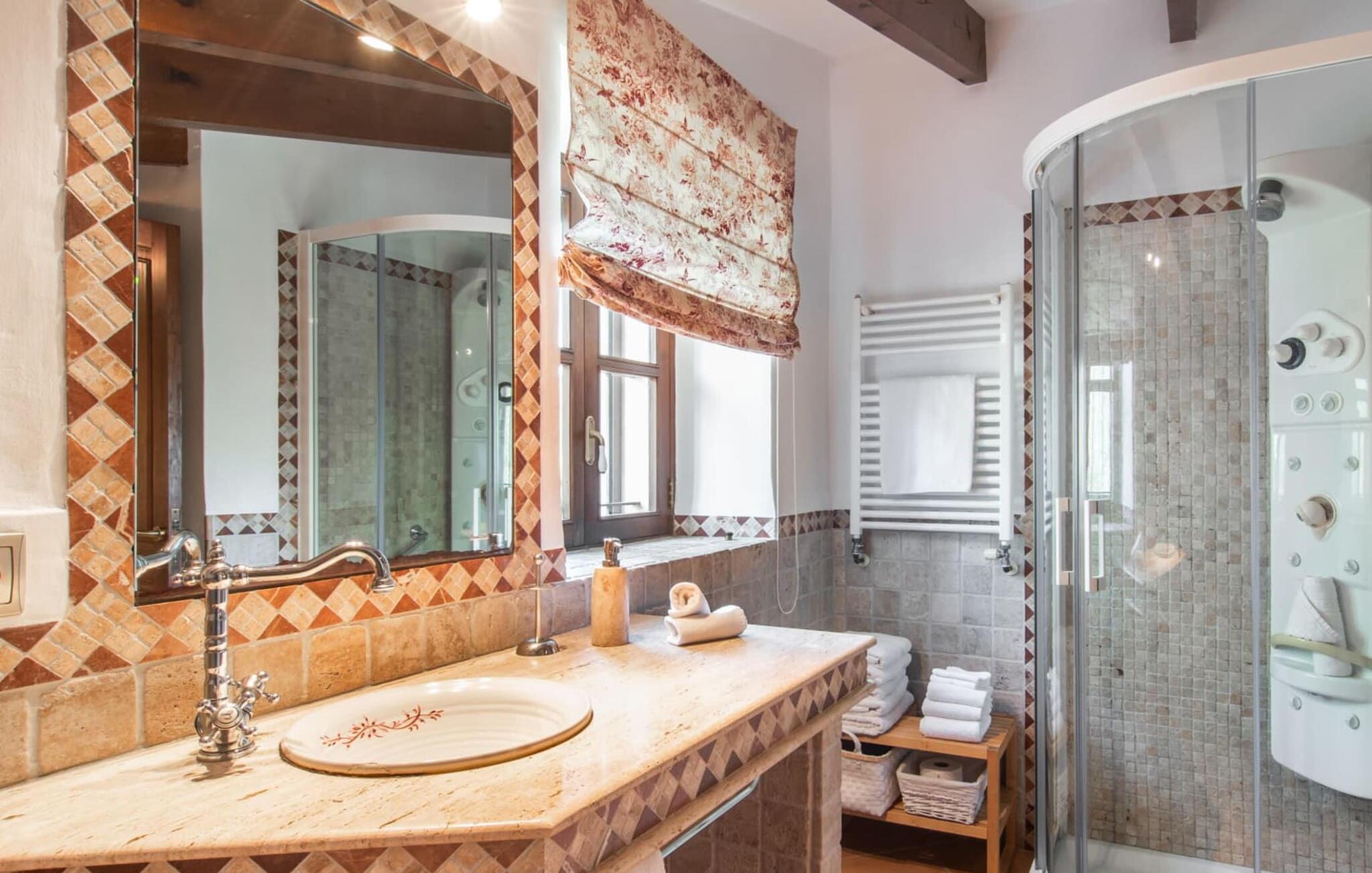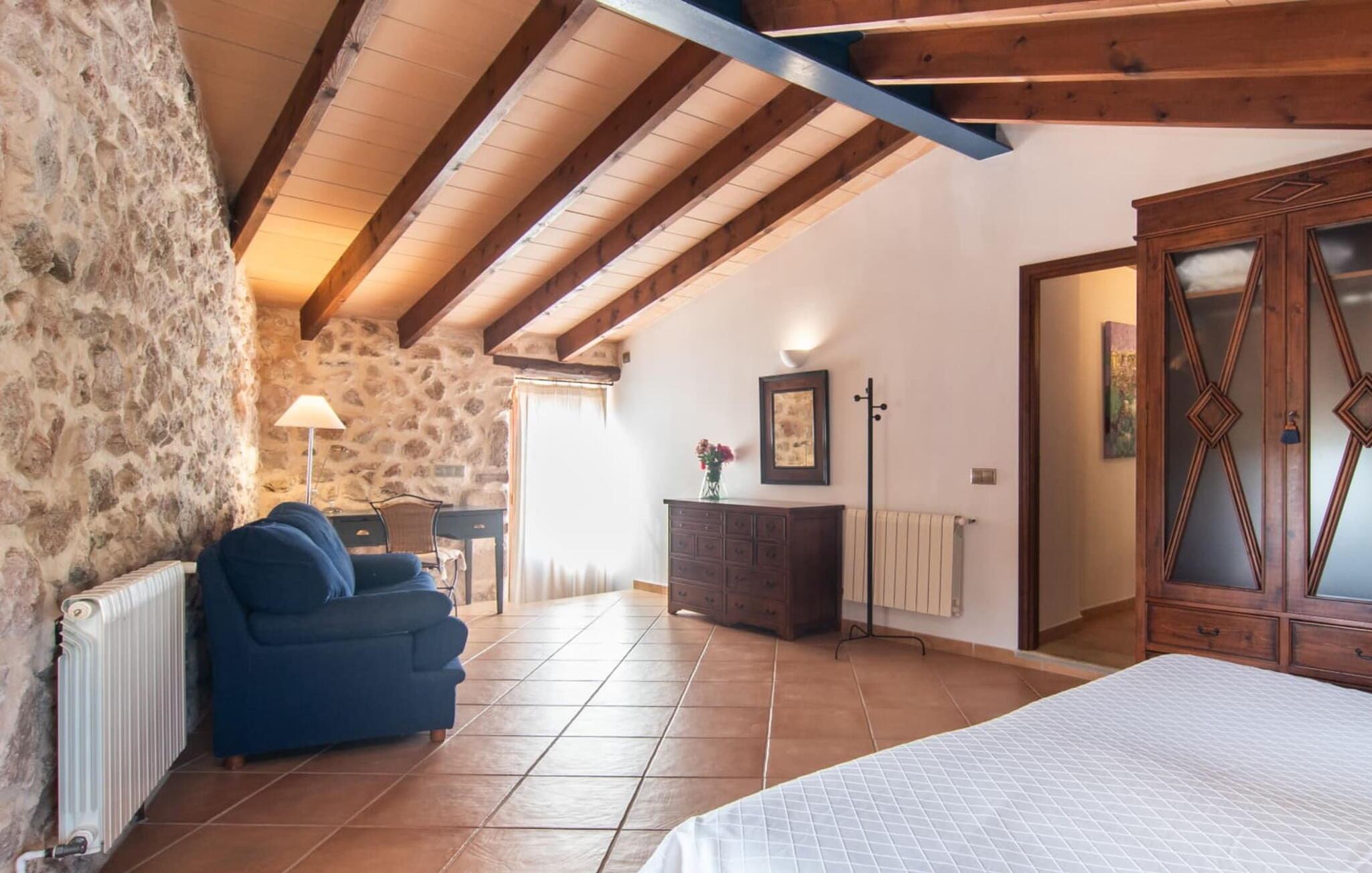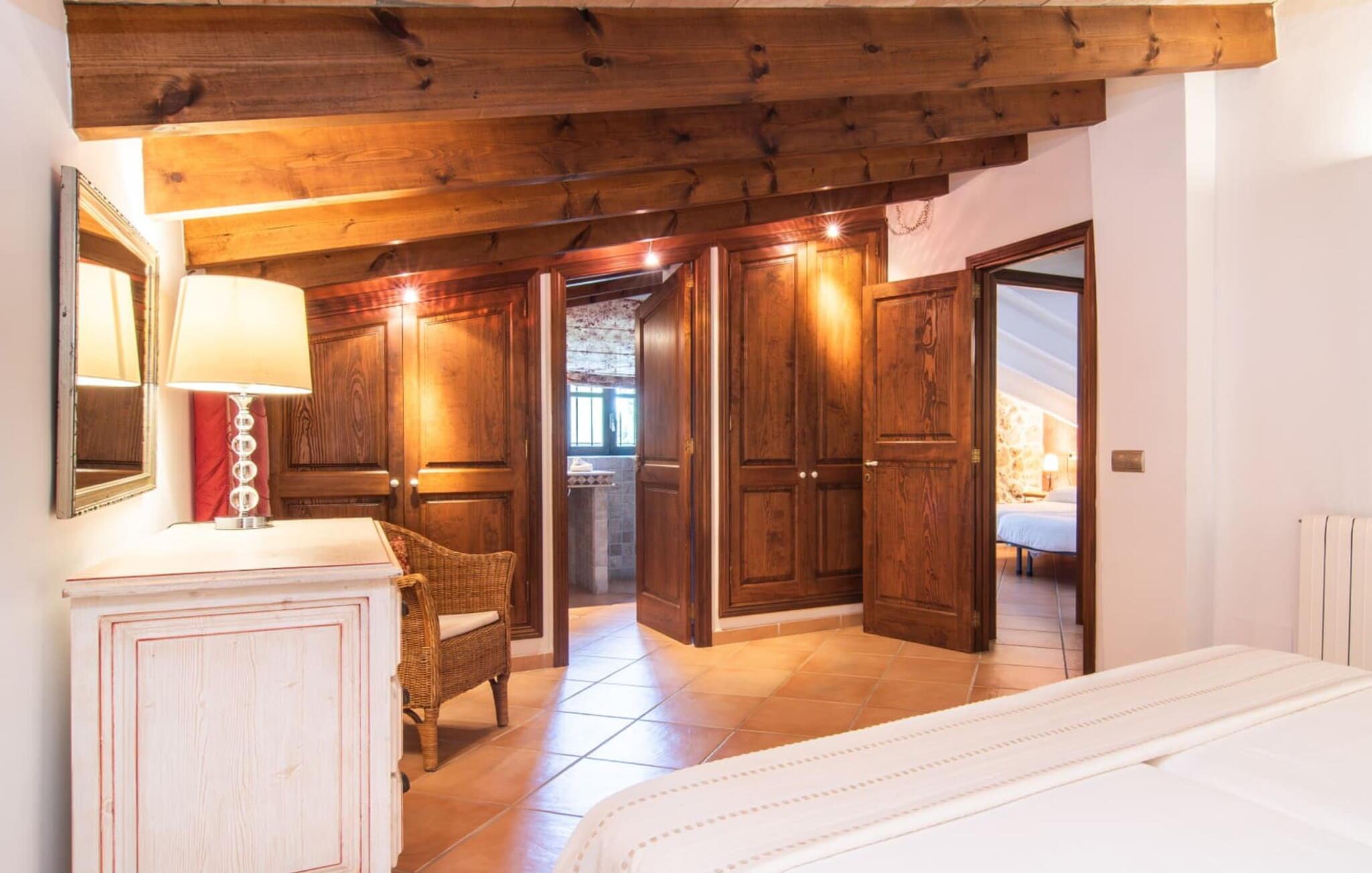 Die Inneneinrichtung besticht durch authentisches Landhaus-Ambiente. Bei der Sanierung blieben Originalelemente erhalten. Natursteinwände, Holzbalkendecken und Sandsteinbögen wurden gelungen mit einer hellen, gemütlichen Dekoration kombiniert. Von der Eingangshalle führt ein Steinbogen direkt in das gemütliche Wohnzimmer mit Kamin. Rechts von der Eingangshalle befindet sich das Esszimmer und eine offene, gut ausgestattete Küche. Ein architektonisches Highlight ist der angrenzende Gewölberaum. Fühlen Sie sich frei, Ihre Mahlzeiten hier einzunehmen. Im Obergeschoss befinden sich vier gemütliche Doppelzimmer. Eines der Schlafzimmer hat Zugang zu einer eigenen kleinen Terrasse mit wunderschönem Blick ins Grüne.