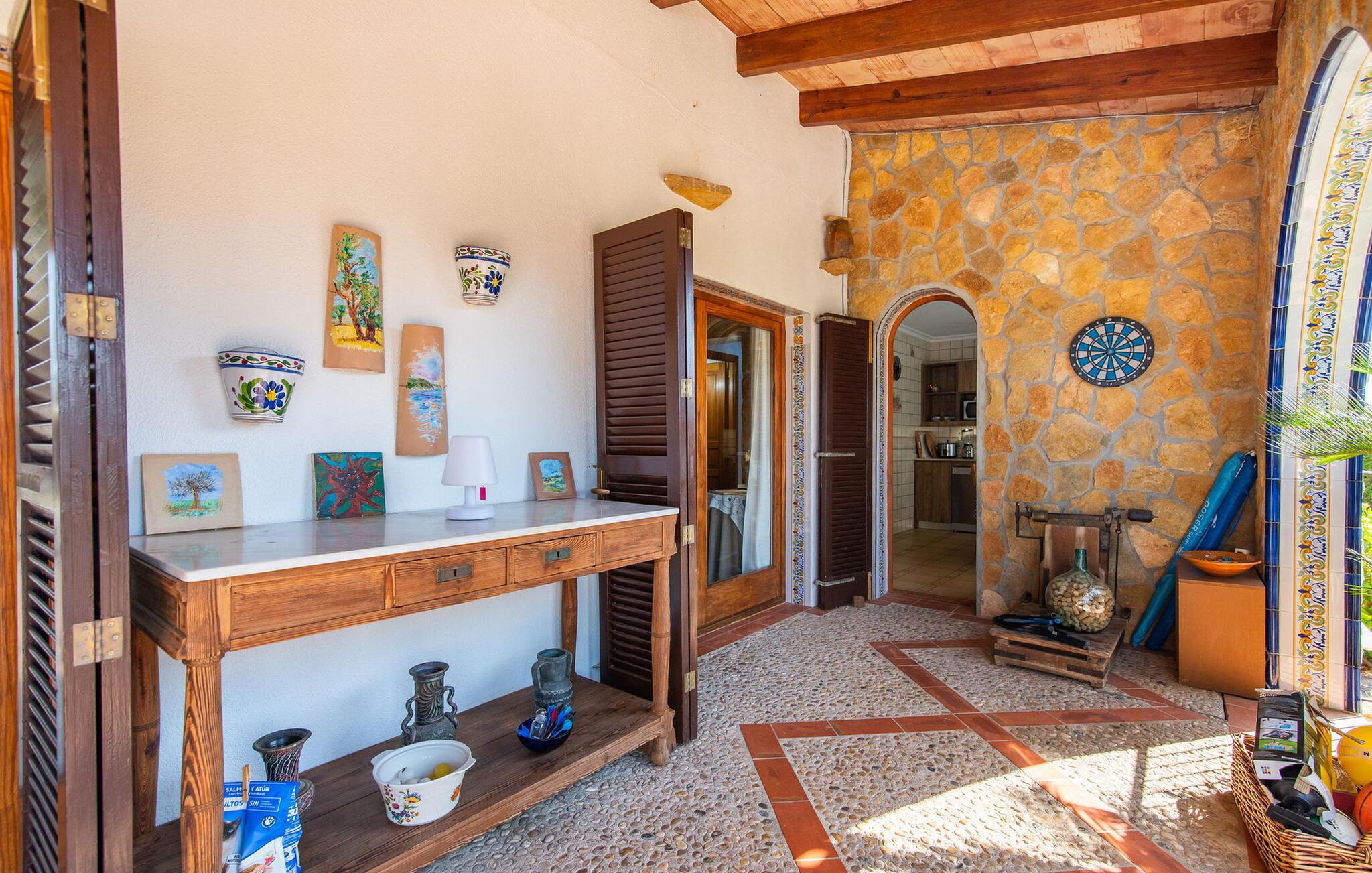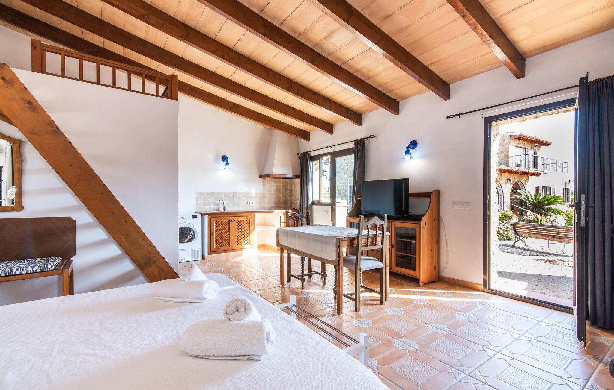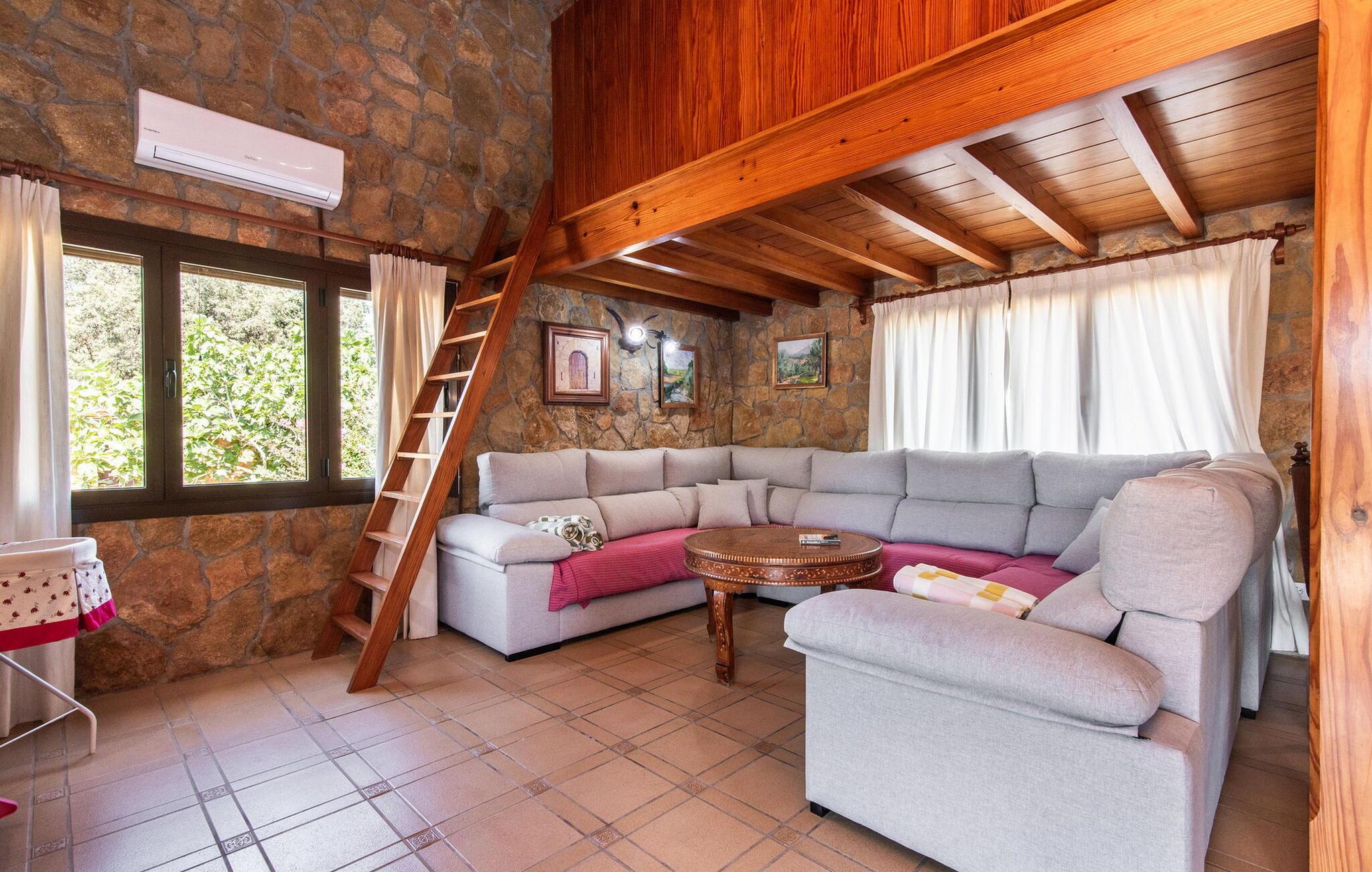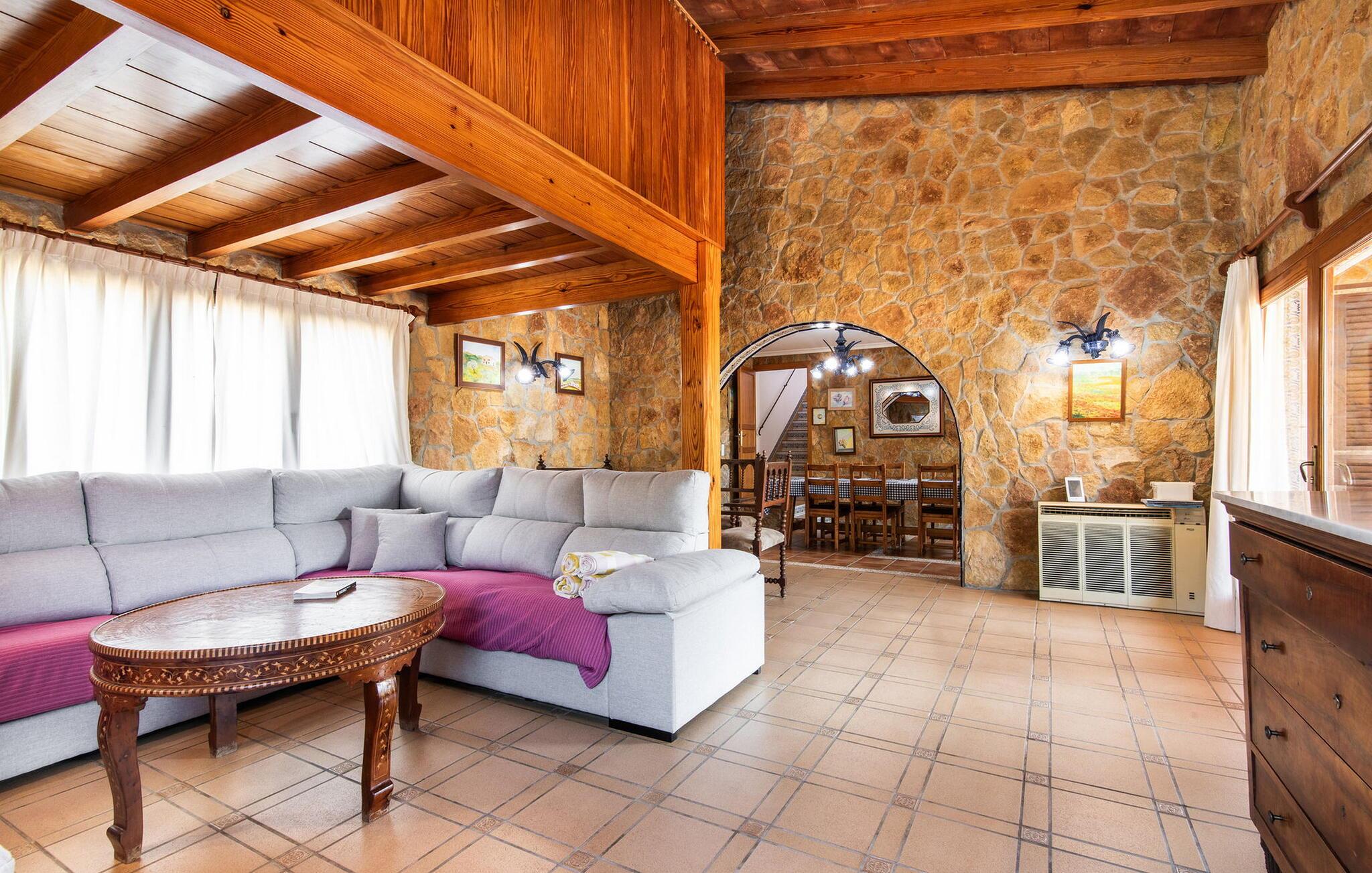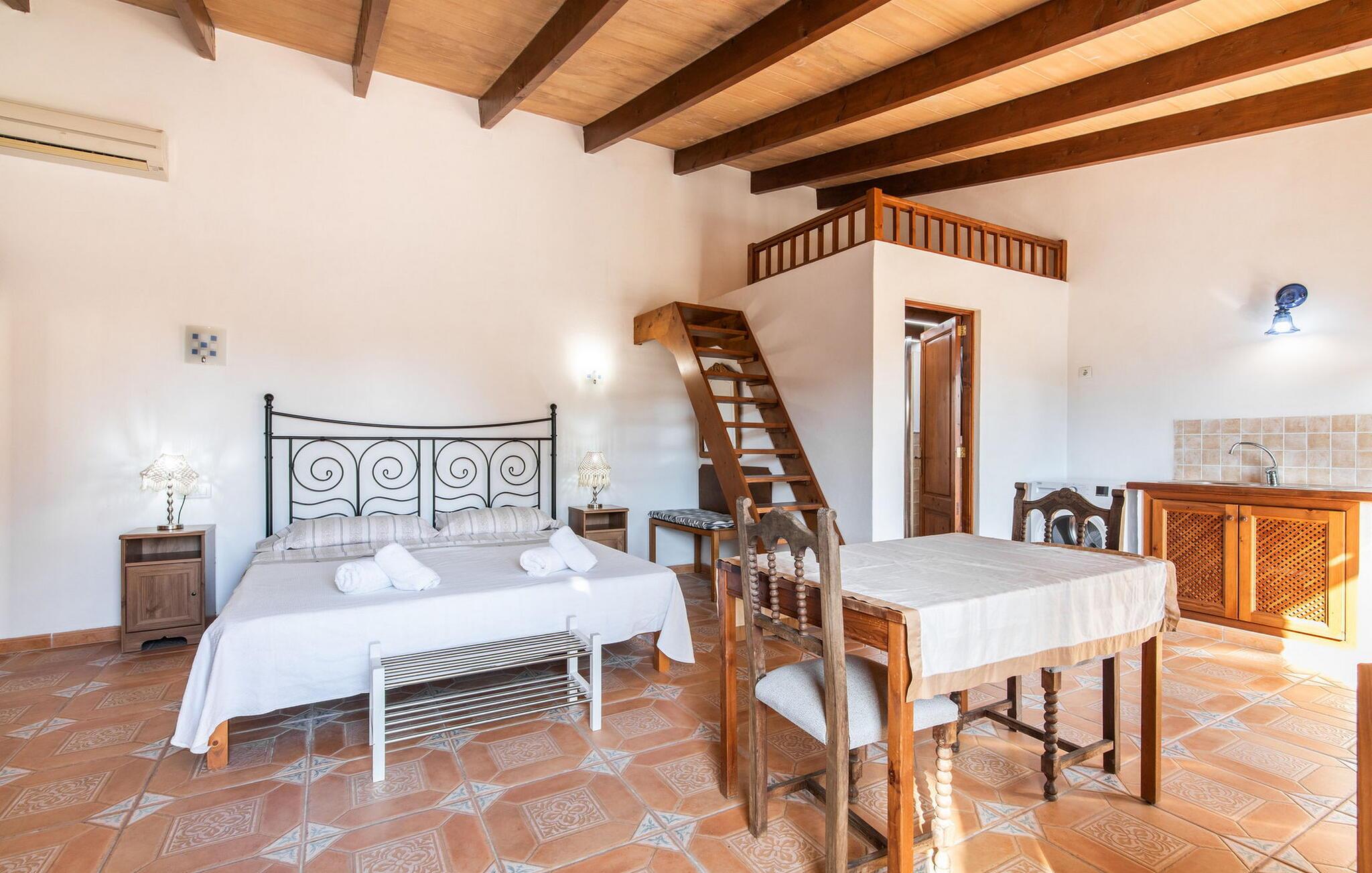 Der gesamte Wohnraum ist optimal in ein Haupthaus und ein schönes separates Studio aufgeteilt. Über die überdachte Terrasse betreten Sie das Hauptgebäude und gelangen so in das Wohnzimmer. Typische mallorquinische Dekorationen in Form von Bildern, Kunstgegenständen und Antiquitäten verleihen dem Haus eine einladende, persönliche Note. Die verwendeten Materialien tragen zur edlen Atmosphäre bei. Das Wohnzimmer ist großzügig angelegt und super gemütlich, mit mehreren Sofas und urigen Natursteinen an den Wänden, die auch im Rest des Hauses zu finden sind. Über der Couchecke führt eine Leiter hinauf zu einem Zwischenboden, auf dem sicher ein bis zwei Kinder gerne schlafen werden. Hier steht ein Bett mit den Maßen 1,4 x 2 zur Verfügung. Wohn- und Esszimmer sind durch einen hübschen Rundbogendurchgang miteinander verbunden. Am Esstisch können Sie gemeinsam ein gepflegtes Indoor-Essen genießen. Das Esszimmer verzweigt sich in einen Flur, der wiederum zu den beiden Schlafzimmern und Badezimmern führt. Die Küche ist geräumig und komplett ausgestattet mit Geschirrspüler, Kühl-/Gefrierkombination, Mikrowelle, Cerankochfeld, Backofen, Toaster, Filterkaffeemaschine, Nespresso und Wasserkocher. Hier ist so viel Platz, dass sogar ein weiterer Esstisch hineinpasst. Die Schlafzimmer im Erdgeschoss sind sehr wohnlich gestaltet und bieten eine hervorragende Grundlage für eine erholsame Nacht. Beide verfügen jeweils über einen großen Kleiderschrank und teilweise holzgetäfelte Wände. Hier stehen zwei miteinander kombinierbare Betten der Größe 1 x 2 m zur Verfügung, das andere Schlafzimmer verfügt über ein Bett der Größe 1,8 x 2 m. Alle Schlafzimmer sind klimatisiert, ebenso das Wohnzimmer. Das Badezimmer im Erdgeschoss ist mit Badewanne, WC, Bidet und Waschbecken ausgestattet. Darüber hinaus gibt es auf dieser Etage auch einen Waschraum mit Waschmaschine, Bügeleisen, Bügelbrett und Wäscheständer. Im ersten Stock gibt es ein großes, helles Doppelzimmer mit schöner Aussicht, sowie ein Duschbad. Das Haus wird mit einer Zentralheizung beheizt. Wasser kommt aus dem hauseigenen Brunnen.