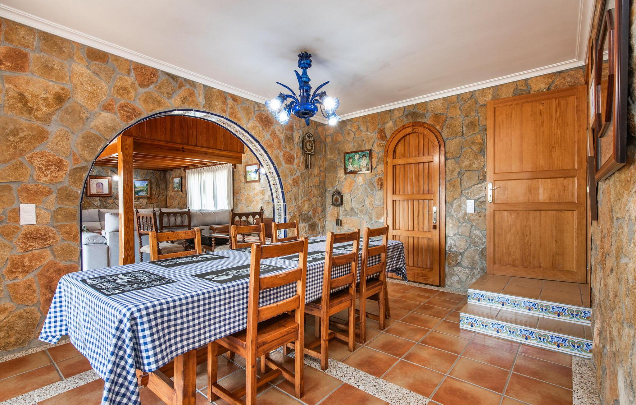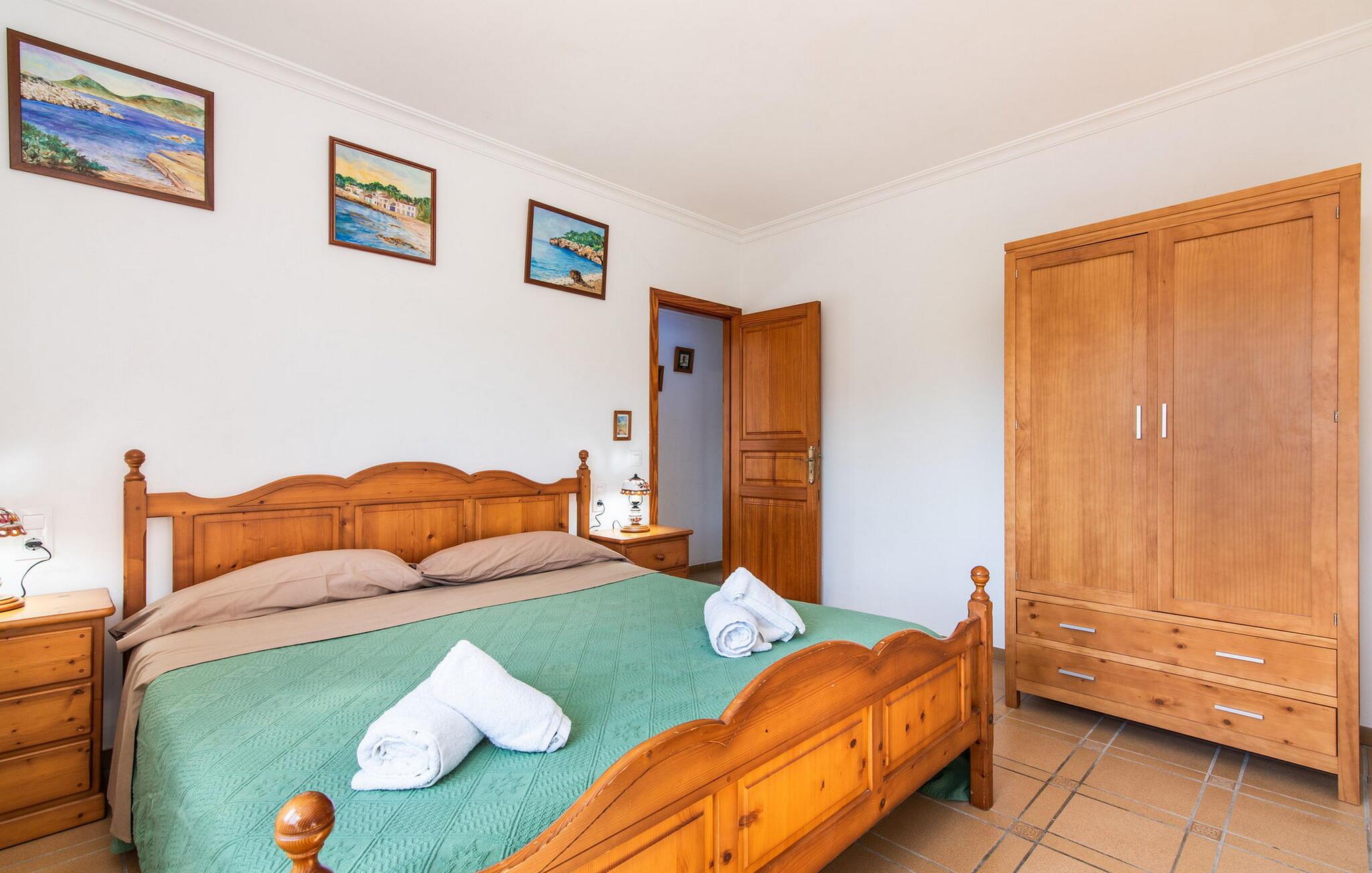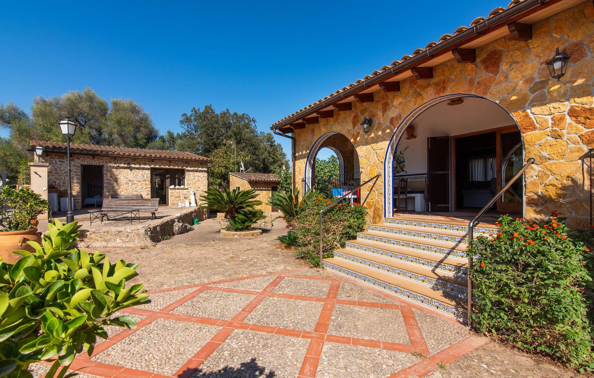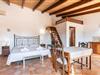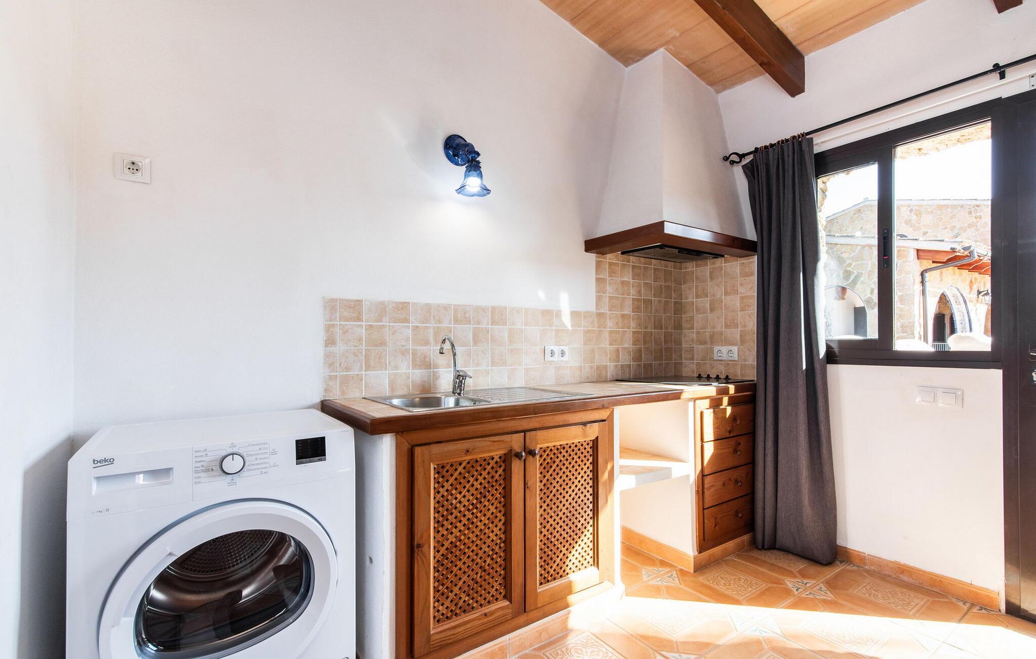 Der gesamte Wohnraum ist optimal in ein Haupthaus und ein schönes separates Studio aufgeteilt. Über die überdachte Terrasse betreten Sie das Hauptgebäude und gelangen so in das Wohnzimmer. Typische mallorquinische Dekorationen in Form von Bildern, Kunstgegenständen und Antiquitäten verleihen dem Haus eine einladende, persönliche Note. Die verwendeten Materialien tragen zur edlen Atmosphäre bei. Das Wohnzimmer ist großzügig angelegt und super gemütlich, mit mehreren Sofas und urigen Natursteinen an den Wänden, die auch im Rest des Hauses zu finden sind. Über der Couchecke führt eine Leiter hinauf zu einem Zwischenboden, auf dem sicher ein bis zwei Kinder gerne schlafen werden. Hier steht ein Bett mit den Maßen 1,4 x 2 zur Verfügung. Wohn- und Esszimmer sind durch einen hübschen Rundbogendurchgang miteinander verbunden. Am Esstisch können Sie gemeinsam ein gepflegtes Indoor-Essen genießen. Das Esszimmer verzweigt sich in einen Flur, der wiederum zu den beiden Schlafzimmern und Badezimmern führt. Die Küche ist geräumig und komplett ausgestattet mit Geschirrspüler, Kühl-/Gefrierkombination, Mikrowelle, Cerankochfeld, Backofen, Toaster, Filterkaffeemaschine, Nespresso und Wasserkocher. Hier ist so viel Platz, dass sogar ein weiterer Esstisch hineinpasst. Die Schlafzimmer im Erdgeschoss sind sehr wohnlich gestaltet und bieten eine hervorragende Grundlage für eine erholsame Nacht. Beide verfügen jeweils über einen großen Kleiderschrank und teilweise holzgetäfelte Wände. Hier stehen zwei miteinander kombinierbare Betten der Größe 1 x 2 m zur Verfügung, das andere Schlafzimmer verfügt über ein Bett der Größe 1,8 x 2 m. Alle Schlafzimmer sind klimatisiert, ebenso das Wohnzimmer. Das Badezimmer im Erdgeschoss ist mit Badewanne, WC, Bidet und Waschbecken ausgestattet. Darüber hinaus gibt es auf dieser Etage auch einen Waschraum mit Waschmaschine, Bügeleisen, Bügelbrett und Wäscheständer. Im ersten Stock gibt es ein großes, helles Doppelzimmer mit schöner Aussicht, sowie ein Duschbad. Das Haus wird mit einer Zentralheizung beheizt. Wasser kommt aus dem hauseigenen Brunnen.