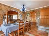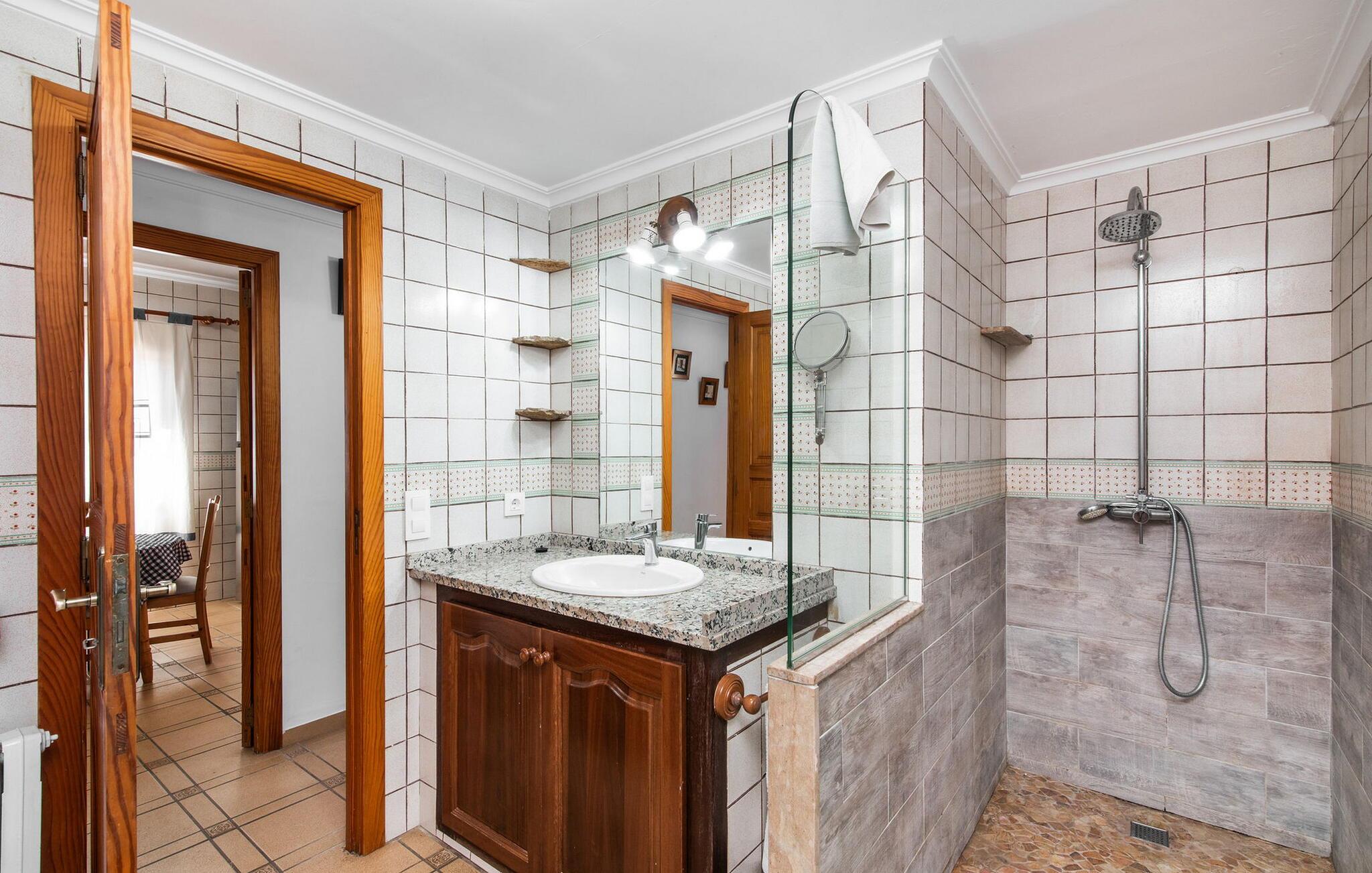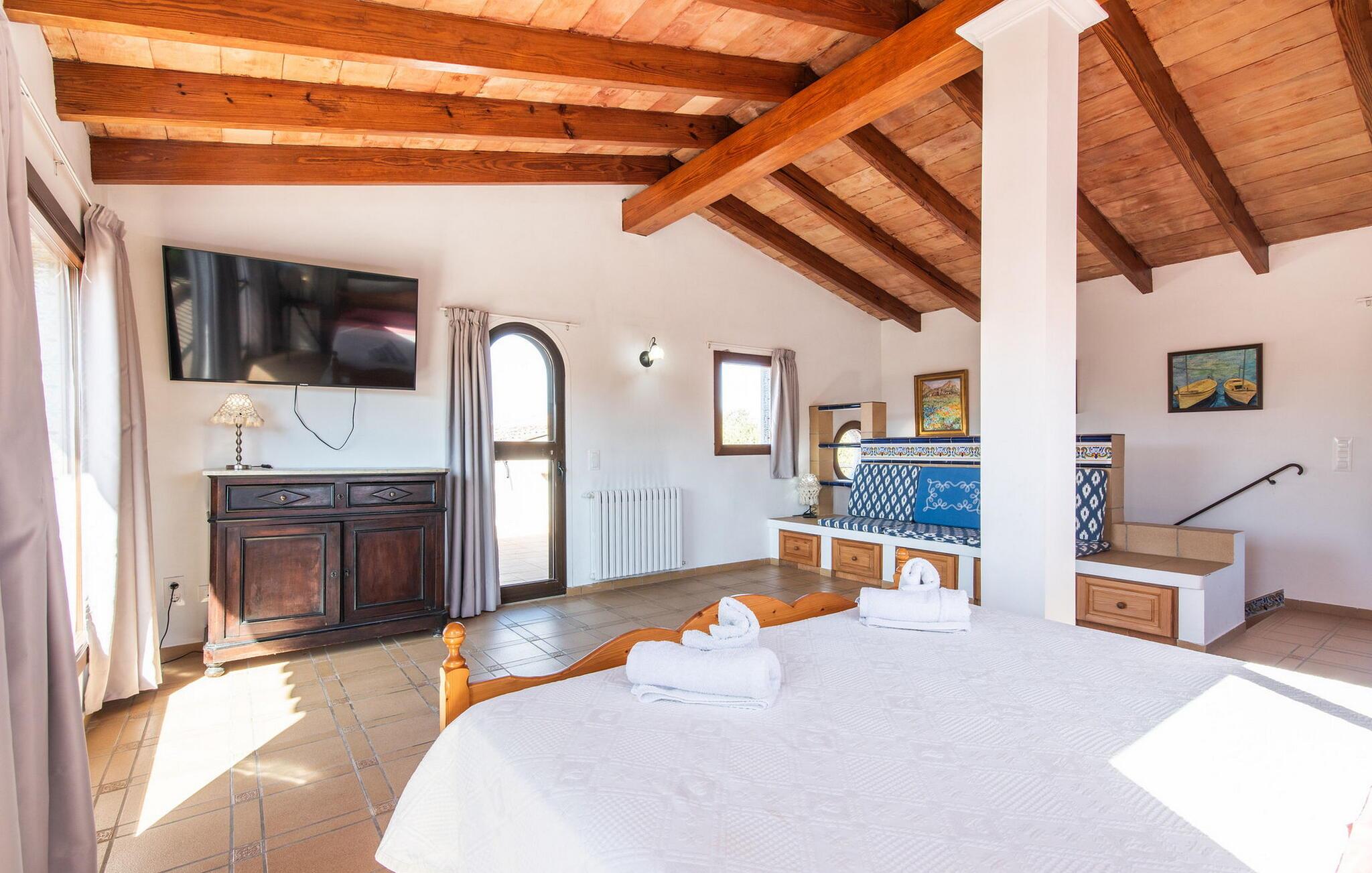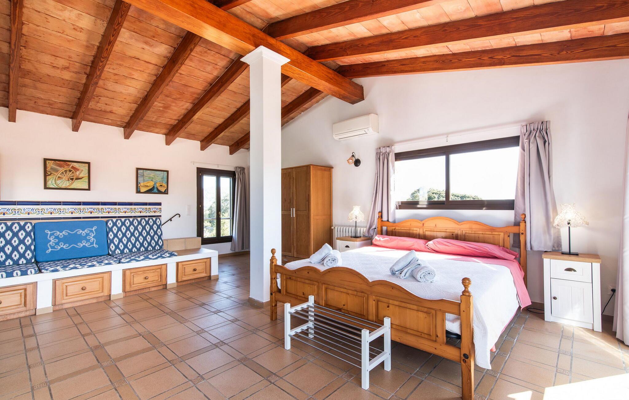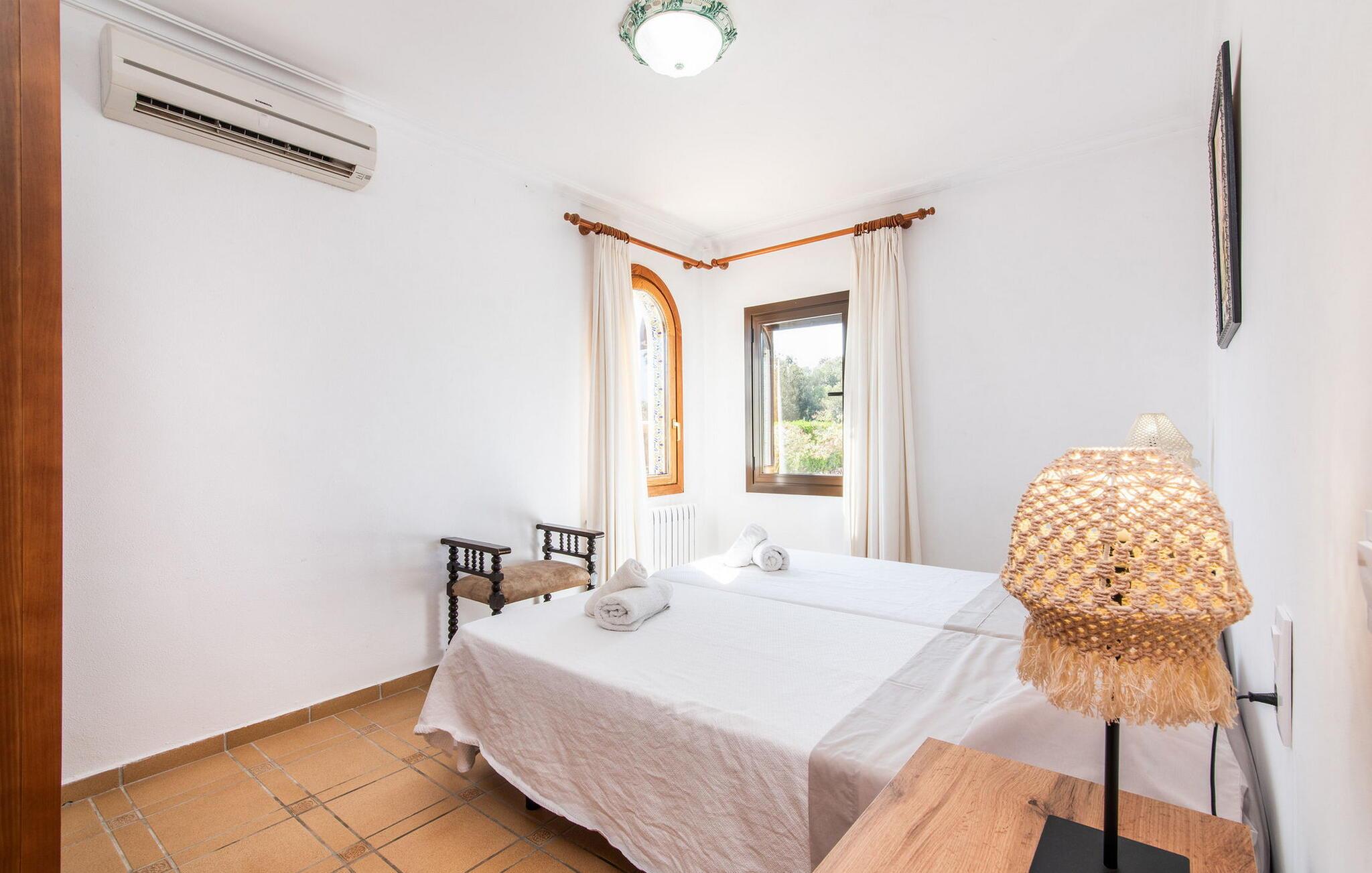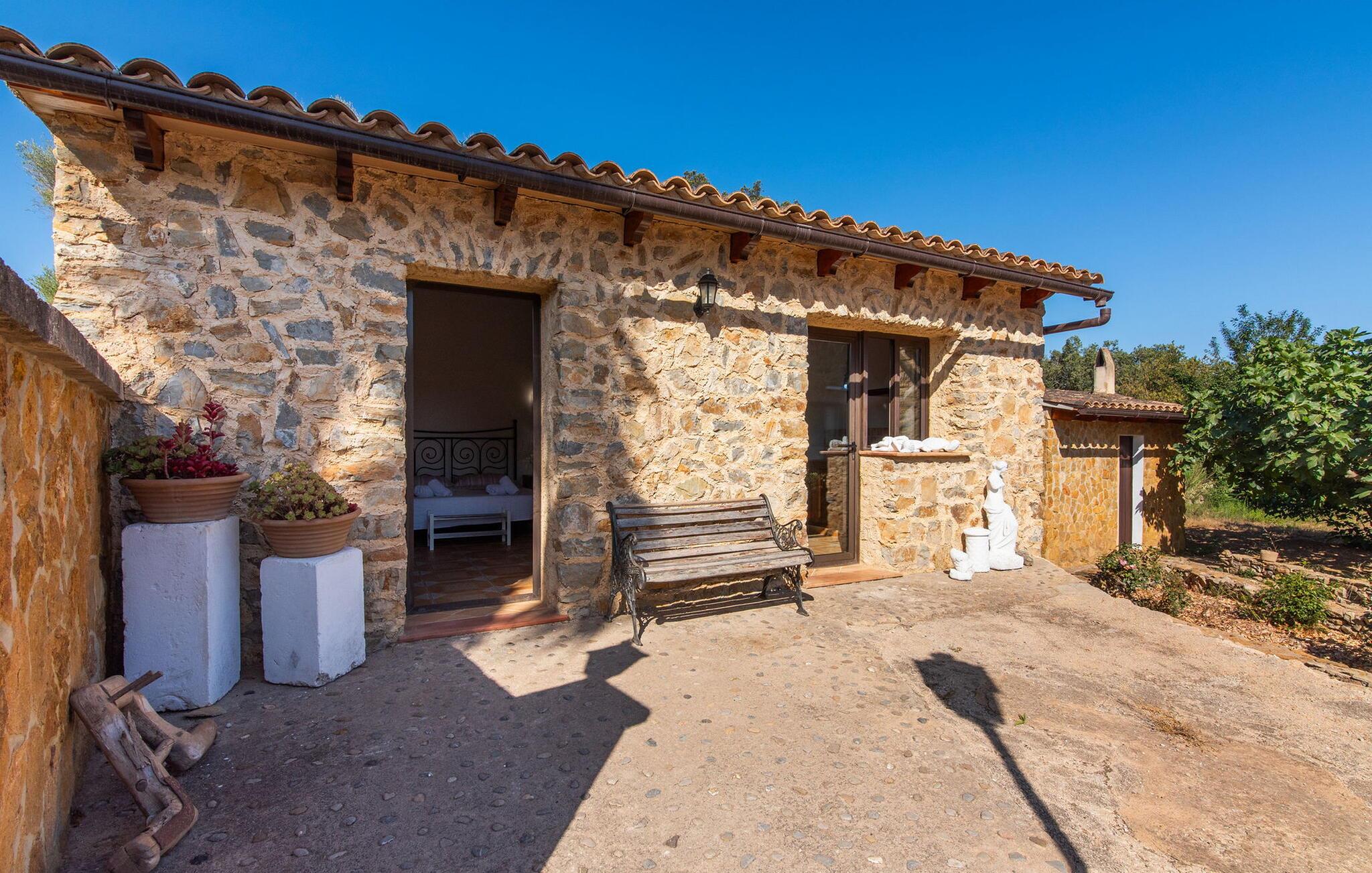 Der gesamte Wohnraum ist optimal in ein Haupthaus und ein schönes separates Studio aufgeteilt. Über die überdachte Terrasse betreten Sie das Hauptgebäude und gelangen so in das Wohnzimmer. Typische mallorquinische Dekorationen in Form von Bildern, Kunstgegenständen und Antiquitäten verleihen dem Haus eine einladende, persönliche Note. Die verwendeten Materialien tragen zur edlen Atmosphäre bei. Das Wohnzimmer ist großzügig angelegt und super gemütlich, mit mehreren Sofas und urigen Natursteinen an den Wänden, die auch im Rest des Hauses zu finden sind. Über der Couchecke führt eine Leiter hinauf zu einem Zwischenboden, auf dem sicher ein bis zwei Kinder gerne schlafen werden. Hier steht ein Bett mit den Maßen 1,4 x 2 zur Verfügung. Wohn- und Esszimmer sind durch einen hübschen Rundbogendurchgang miteinander verbunden. Am Esstisch können Sie gemeinsam ein gepflegtes Indoor-Essen genießen. Das Esszimmer verzweigt sich in einen Flur, der wiederum zu den beiden Schlafzimmern und Badezimmern führt. Die Küche ist geräumig und komplett ausgestattet mit Geschirrspüler, Kühl-/Gefrierkombination, Mikrowelle, Cerankochfeld, Backofen, Toaster, Filterkaffeemaschine, Nespresso und Wasserkocher. Hier ist so viel Platz, dass sogar ein weiterer Esstisch hineinpasst. Die Schlafzimmer im Erdgeschoss sind sehr wohnlich gestaltet und bieten eine hervorragende Grundlage für eine erholsame Nacht. Beide verfügen jeweils über einen großen Kleiderschrank und teilweise holzgetäfelte Wände. Hier stehen zwei miteinander kombinierbare Betten der Größe 1 x 2 m zur Verfügung, das andere Schlafzimmer verfügt über ein Bett der Größe 1,8 x 2 m. Alle Schlafzimmer sind klimatisiert, ebenso das Wohnzimmer. Das Badezimmer im Erdgeschoss ist mit Badewanne, WC, Bidet und Waschbecken ausgestattet. Darüber hinaus gibt es auf dieser Etage auch einen Waschraum mit Waschmaschine, Bügeleisen, Bügelbrett und Wäscheständer. Im ersten Stock gibt es ein großes, helles Doppelzimmer mit schöner Aussicht, sowie ein Duschbad. Das Haus wird mit einer Zentralheizung beheizt. Wasser kommt aus dem hauseigenen Brunnen.