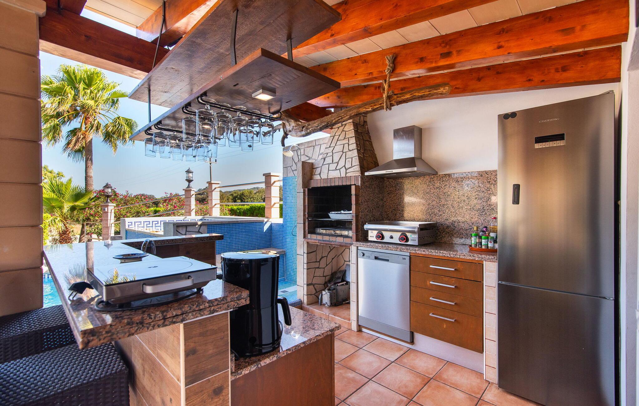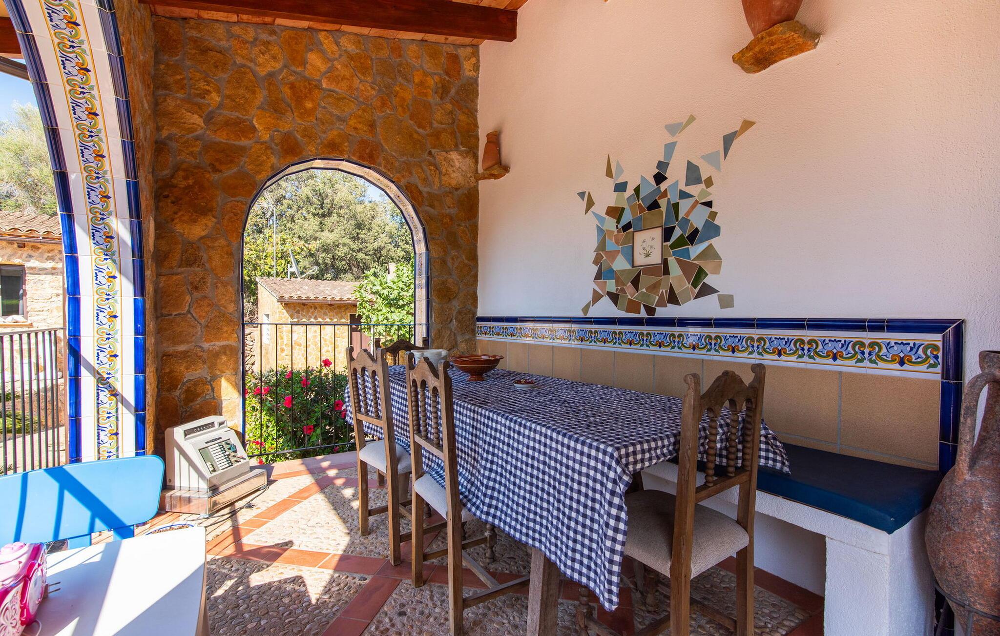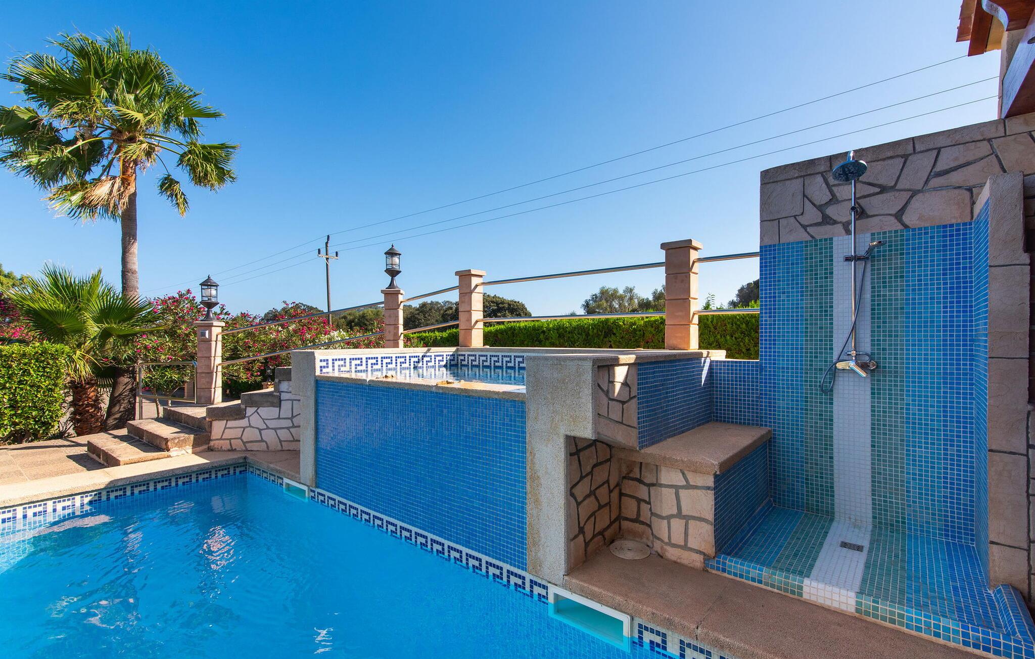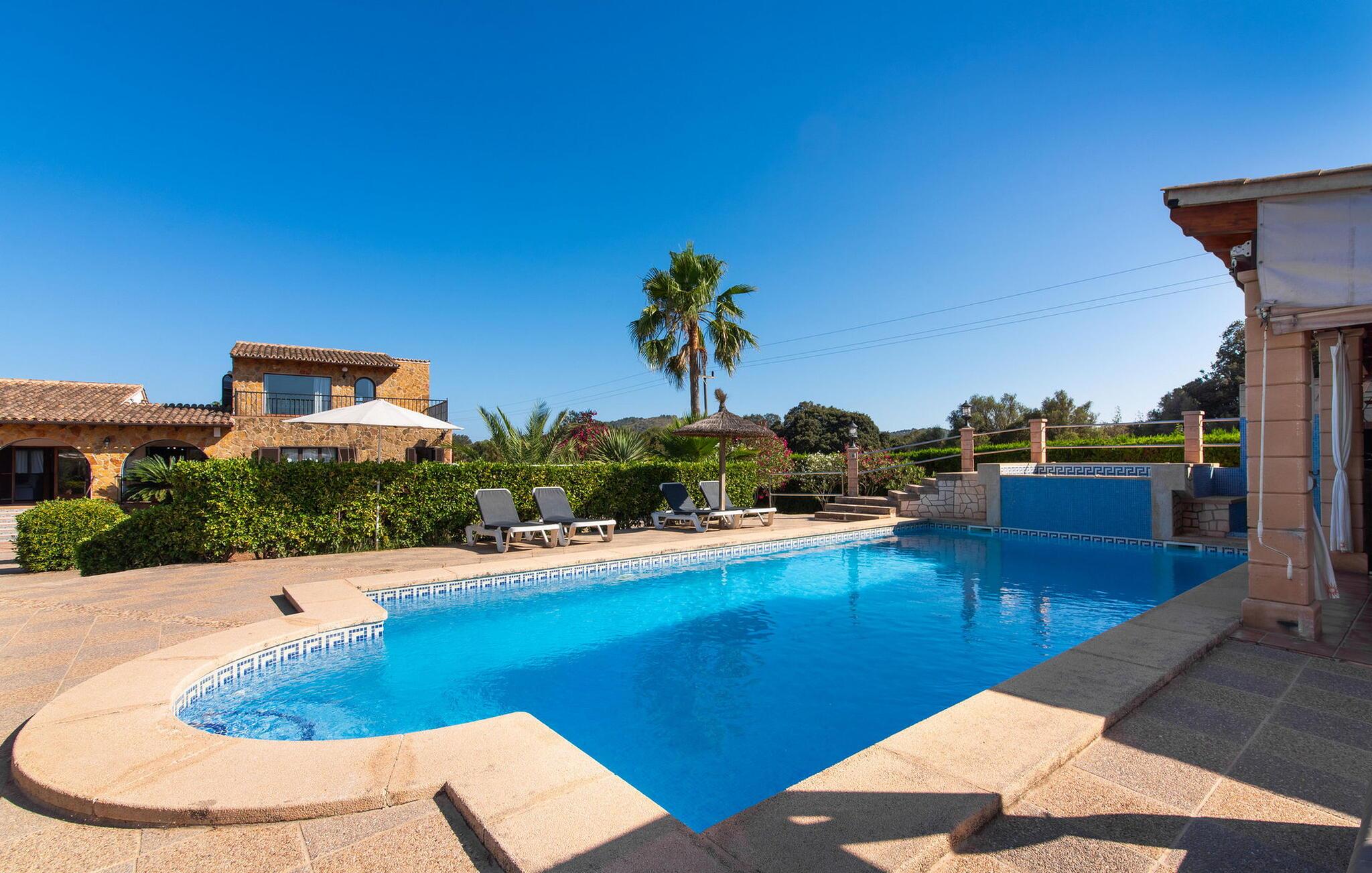 Das malerische Landhaus „Na Peixet“ wurde auf einem idyllisch und ruhig gelegenen Grundstück mit herrlicher mediterraner Vegetation errichtet. Die Villa zeigt typisch mallorquinische Architektur und Baumaterialien wie Naturstein, Lehmziegel und Eichenholz. Terrassen und Gartenwege rund um das Haus wurden dekorativ mit Flusskieseln gestaltet und verleihen dem Anwesen, auch durch viele weitere besondere Details, ein ganz individuelles Flair. Der Ausblick von diesem Ferienhaus ist absolut sensationell: Man sieht sowohl die Burg von Artà als auch das Castillo von Capdepera. Im ersten Stock gibt es zwei Dachterrassen, von denen Sie einen fantastischen Ausblick genießen können. Herzstück des Außenbereichs ist der leicht erhöhte Pool umgeben von grünem Gras und einer Lounge-Terrasse. Eine Außendusche befindet sich praktischerweise auch direkt in der Nähe, ebenso wie die geniale Veranda, der stilvoll überdachte Teil, unter dem Sie bei einer leichten Brise und geschützt vor der Sonne sitzen können. Zwischen Pool und Haus liegt der heimelige Grillplatz mit ummauertem Grill, der besonders an lauen Abenden zu leckeren Grillsessions einlädt. Auch an kühlen Abenden und im Winter können Sie hier gemütlich sitzen – dafür sorgen die vorhandenen modernen Heizstrahler und das winddichte Glas. Direkt daneben finden Sie ein weiteres Highlight des Außenbereichs: den kleinen Spielplatz. Die Kleinen können nach Herzenslust spielen und sich austoben. Eine Tischtennisplatte steht zur Verfügung, ebenso ein an der Außenwand befestigter Basketballkorb. Die überdachte Terrasse am Haus ist windgeschützt, sodass Sie hier beispielsweise bis spät in die Nacht bei einem guten Glas Wein und herrlicher Aussicht sitzen können. An Wochenenden ist die Burg von Artà sogar beleuchtet. Die Villa ist eingezäunt (ca. 1 m hoch). Sie können direkt am Ferienhaus parken und das Grundstück ist mit Hilfe eines Tors abschließbar.