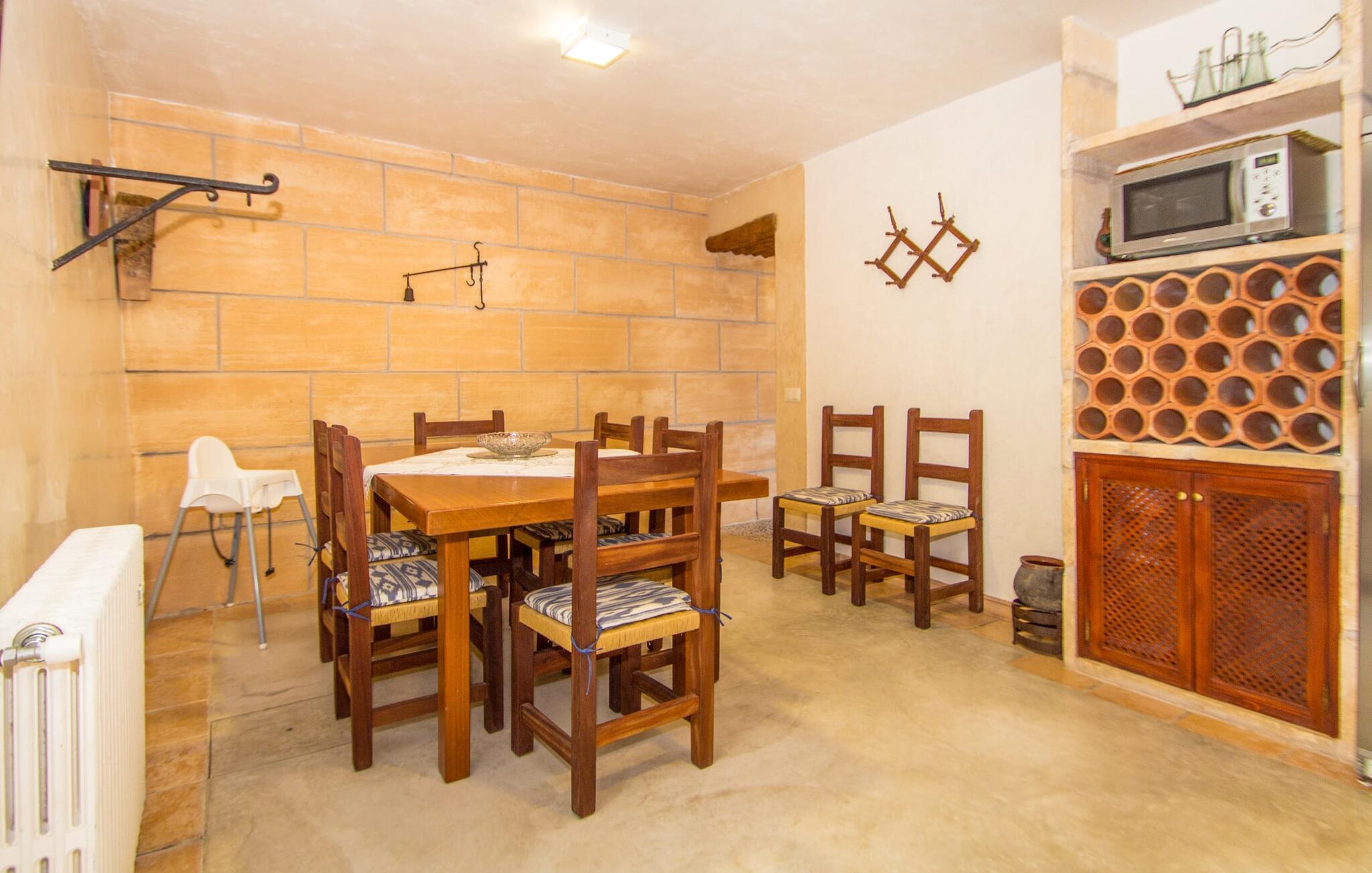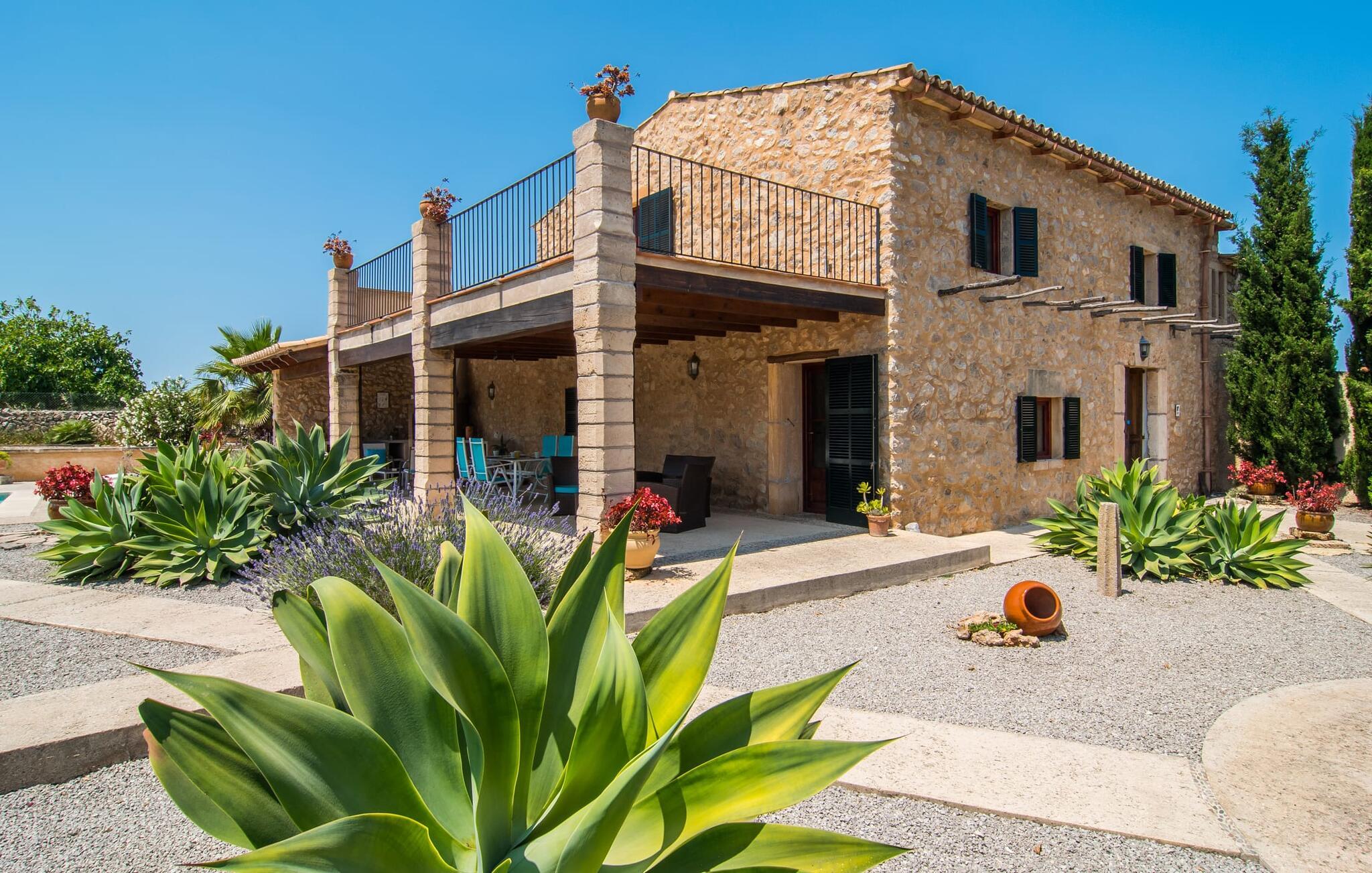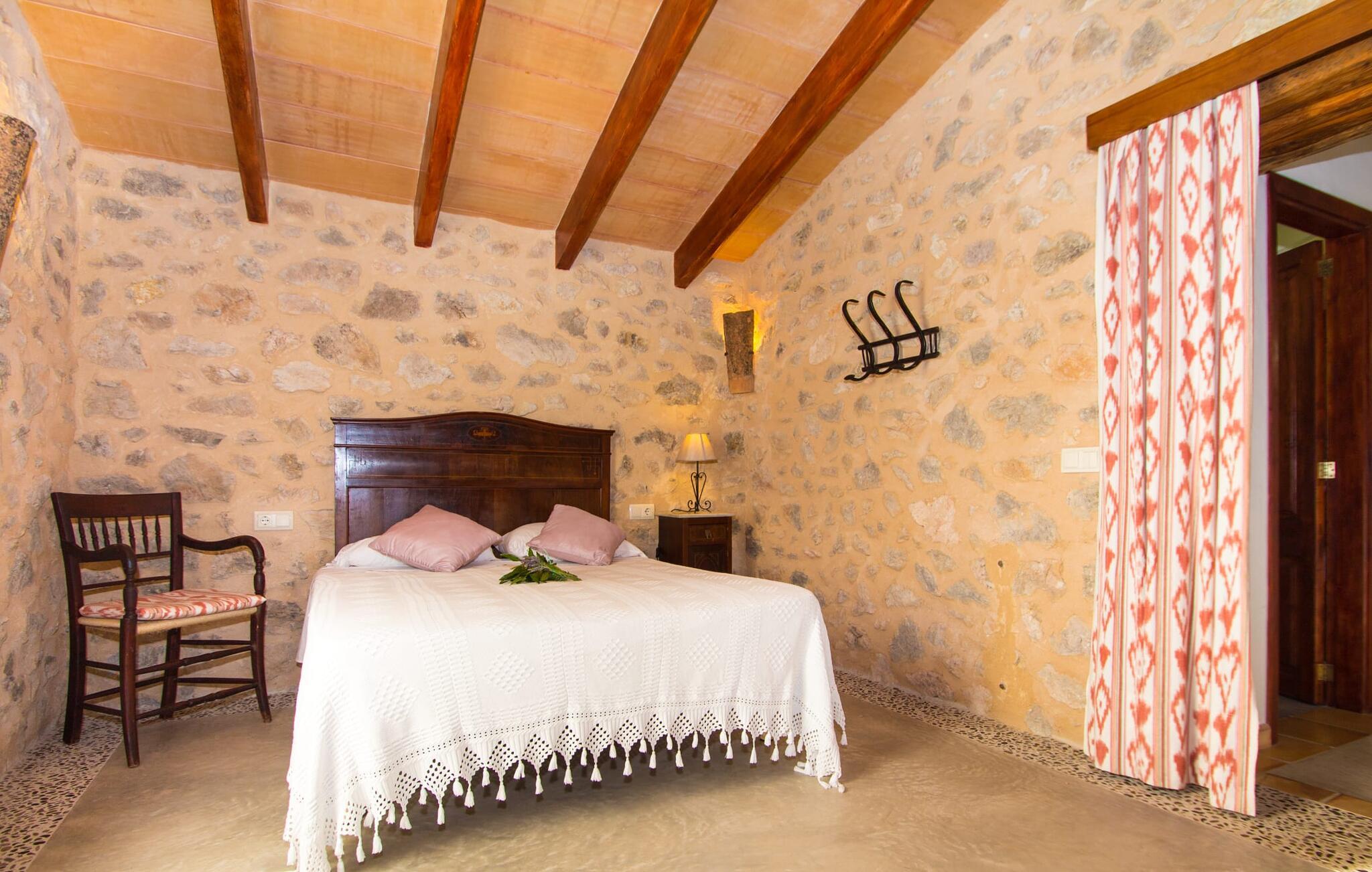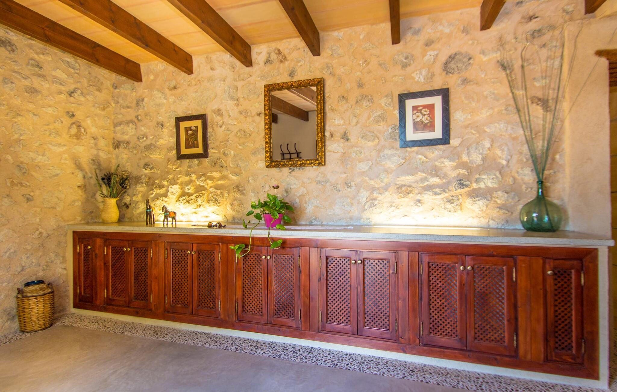 Wenn Sie das Innere der Villa betreten, werden Sie von einer gemütlichen Kombination aus Ursprünglichkeit und moderner Ausstattung begrüßt. Der einzigartige Wohnbereich bildet mit seinen rustikalen Natursteinwänden, sichtbaren Deckenbalken und einem perfekt harmonierenden Steinboden ein einzigartiges Highlight. In diesem Bereich sind helle, moderne Sofas angeordnet, auf denen Sie zu jeder Tageszeit ausgiebig entspannen können. Originelle Beleuchtung und Dekoration runden das individuelle Flair stimmungsvoll ab, in dem Sie als Gast garantiert gerne verweilen möchten. Für diejenigen, die möchten, bietet dieser Raum dank des hier installierten großen Flachbildfernsehers mit Satellitenanschluss die Möglichkeit, sich mit einem guten Film zu unterhalten. Die großzügige, im typisch mallorquinischen Stil eingerichtete Küche bietet neben dem Essbereich alles, was Sie für den täglichen Bedarf benötigen, darunter eine Kaffeemaschine, einen Wasserkocher und viele weitere Features. Auf ganz besondere Art und Weise gestaltete Schlafzimmer bieten die ideale Grundlage für einen erholsamen Schlaf. Hierzu stehen ein Bett in der Größe 1,60x2,00m und zwei in der Größe 0,90x1,90 zur Verfügung. Hier findet jeder seinen Schlafplatz ganz nach seinem Geschmack. Die beiden Badezimmer sind sowohl funktional als auch dekorativ gestaltet und sorgen für viel natürliches Licht. Bügeleisen und Haartrockner sind im Haus vorhanden, so dass Sie keinen Gepäckraum verschwenden müssen, indem Sie Ihren eigenen von zu Hause mitbringen.