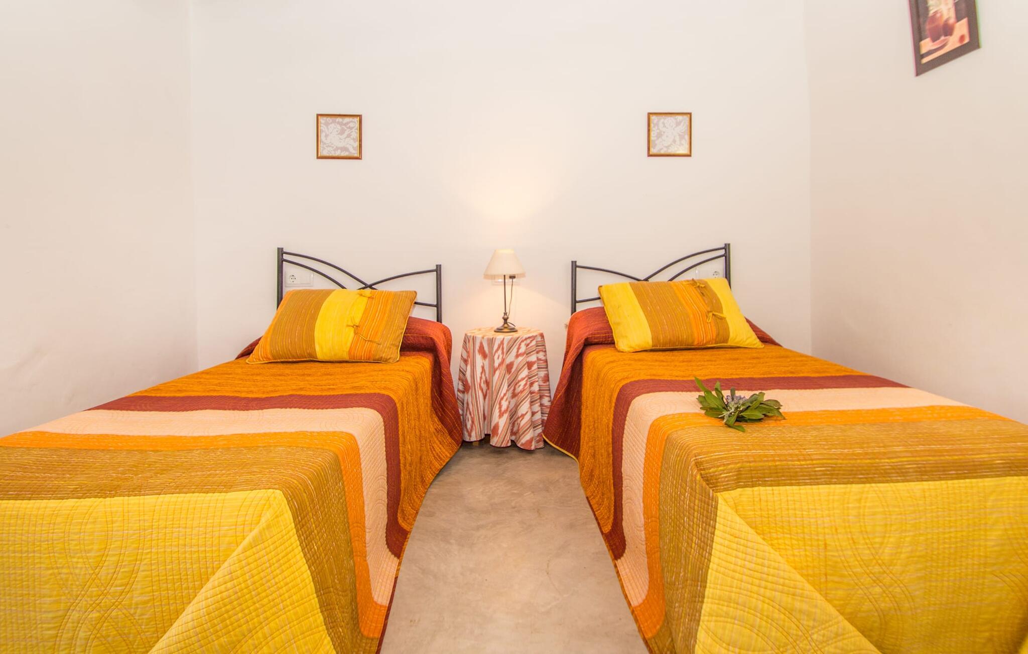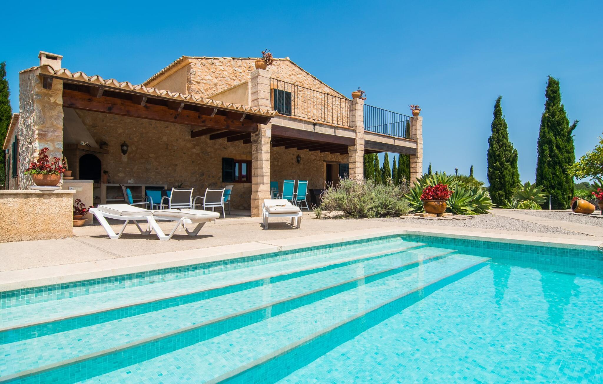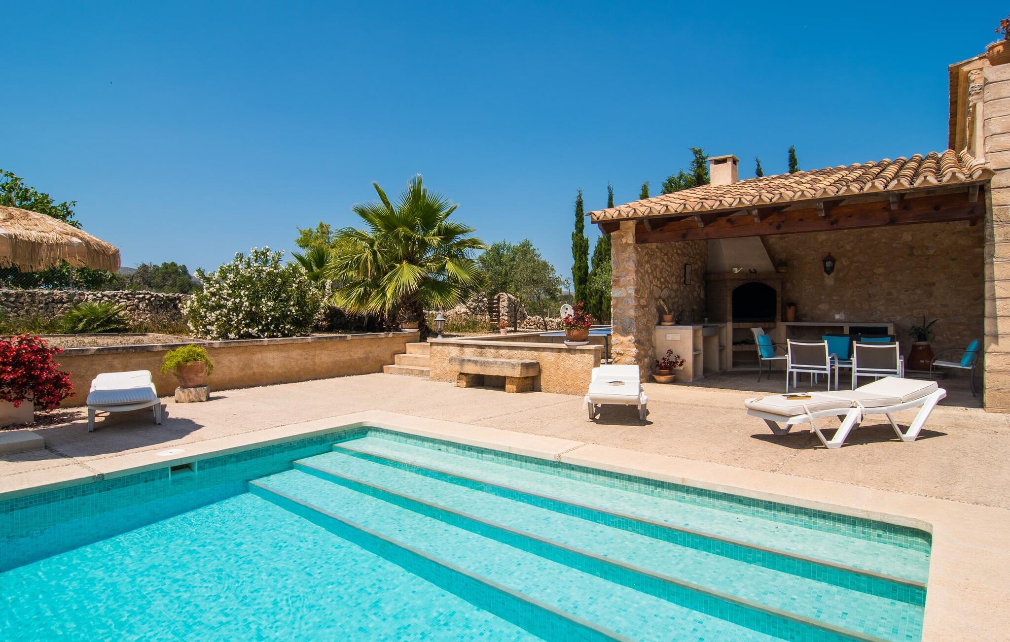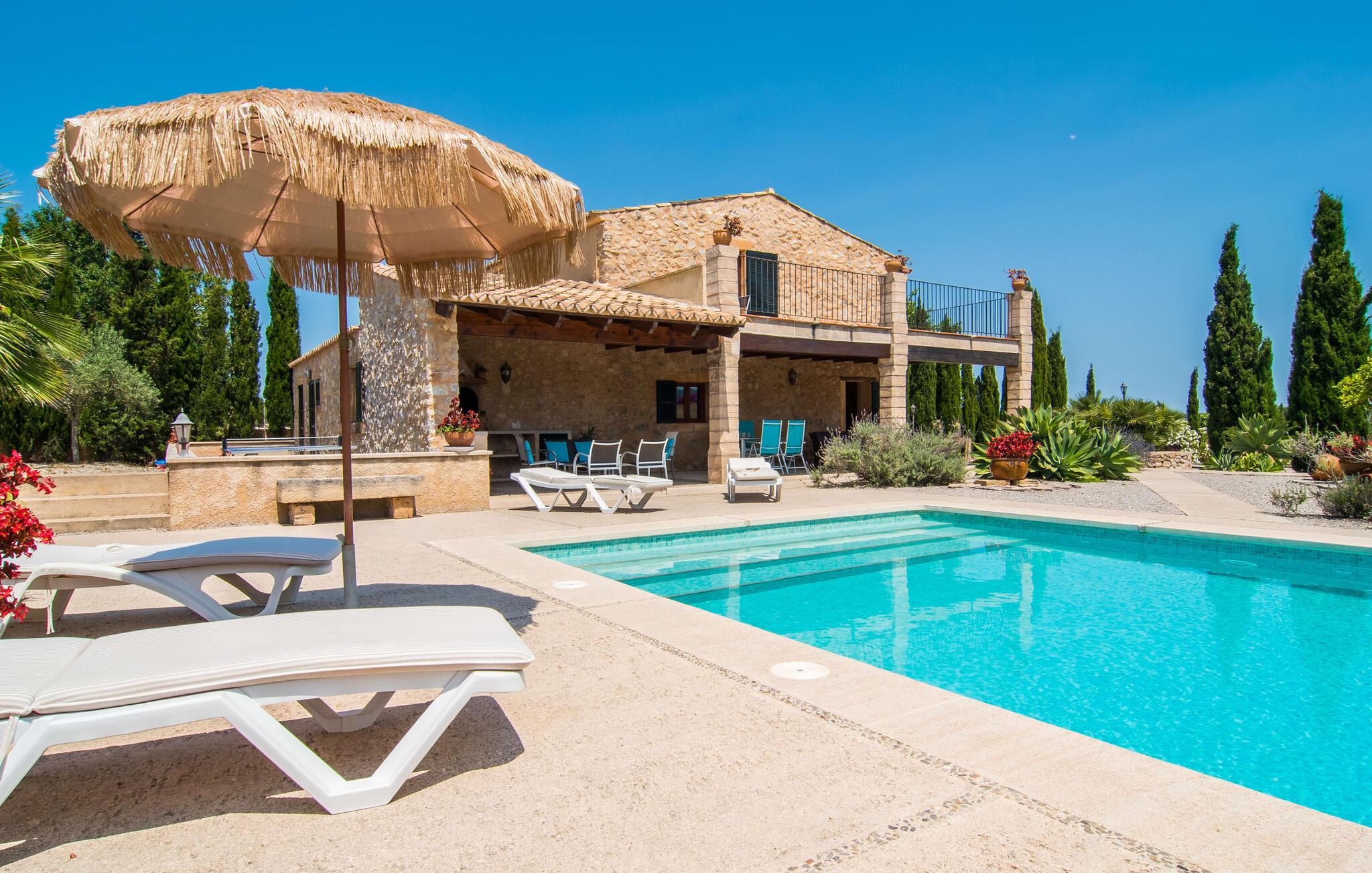 Wenn Sie das Innere der Villa betreten, werden Sie von einer gemütlichen Kombination aus Ursprünglichkeit und moderner Ausstattung begrüßt. Der einzigartige Wohnbereich bildet mit seinen rustikalen Natursteinwänden, sichtbaren Deckenbalken und einem perfekt harmonierenden Steinboden ein einzigartiges Highlight. In diesem Bereich sind helle, moderne Sofas angeordnet, auf denen Sie zu jeder Tageszeit ausgiebig entspannen können. Originelle Beleuchtung und Dekoration runden das individuelle Flair stimmungsvoll ab, in dem Sie als Gast garantiert gerne verweilen möchten. Für diejenigen, die möchten, bietet dieser Raum dank des hier installierten großen Flachbildfernsehers mit Satellitenanschluss die Möglichkeit, sich mit einem guten Film zu unterhalten. Die großzügige, im typisch mallorquinischen Stil eingerichtete Küche bietet neben dem Essbereich alles, was Sie für den täglichen Bedarf benötigen, darunter eine Kaffeemaschine, einen Wasserkocher und viele weitere Features. Auf ganz besondere Art und Weise gestaltete Schlafzimmer bieten die ideale Grundlage für einen erholsamen Schlaf. Hierzu stehen ein Bett in der Größe 1,60x2,00m und zwei in der Größe 0,90x1,90 zur Verfügung. Hier findet jeder seinen Schlafplatz ganz nach seinem Geschmack. Die beiden Badezimmer sind sowohl funktional als auch dekorativ gestaltet und sorgen für viel natürliches Licht. Bügeleisen und Haartrockner sind im Haus vorhanden, so dass Sie keinen Gepäckraum verschwenden müssen, indem Sie Ihren eigenen von zu Hause mitbringen.