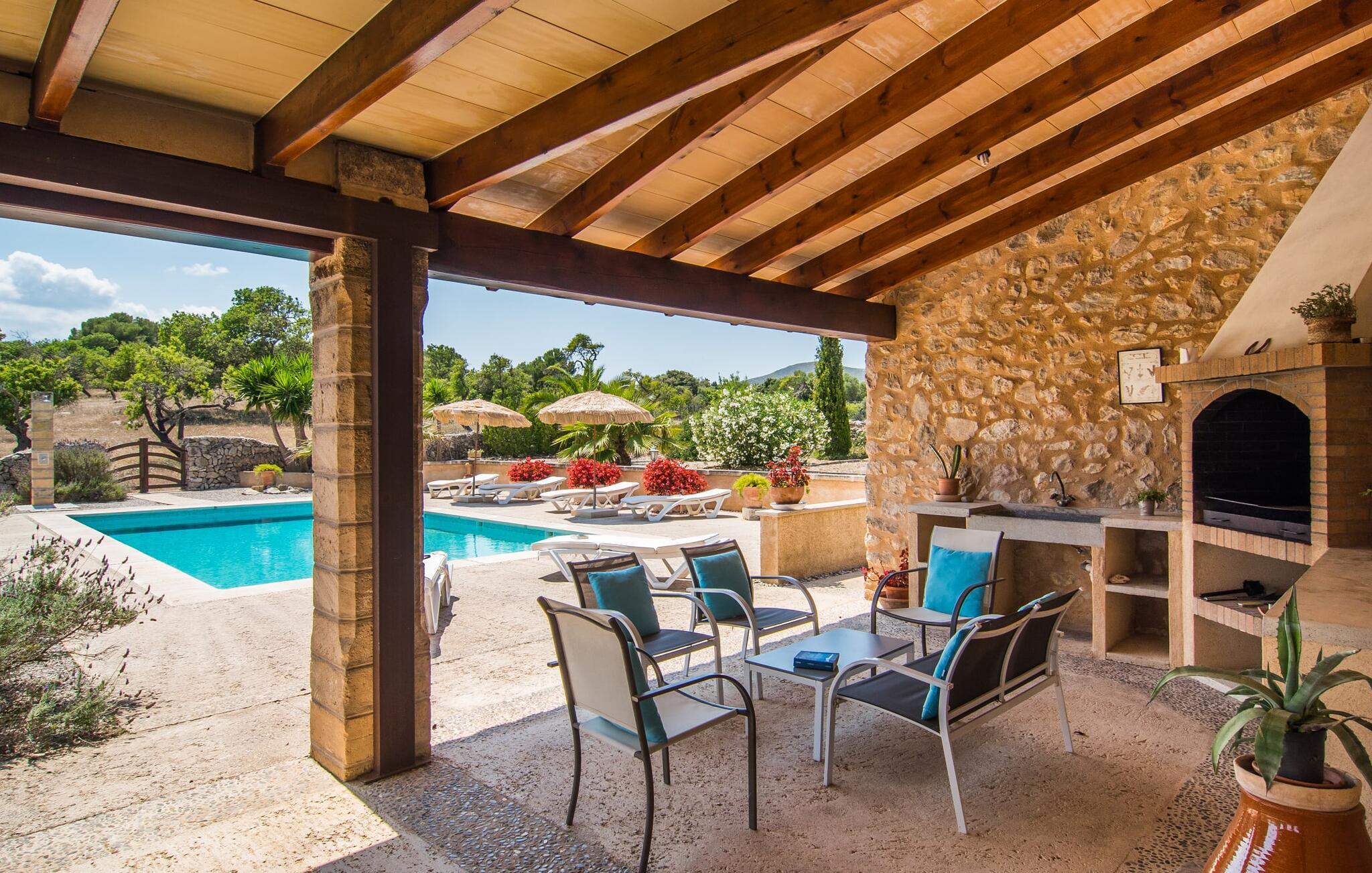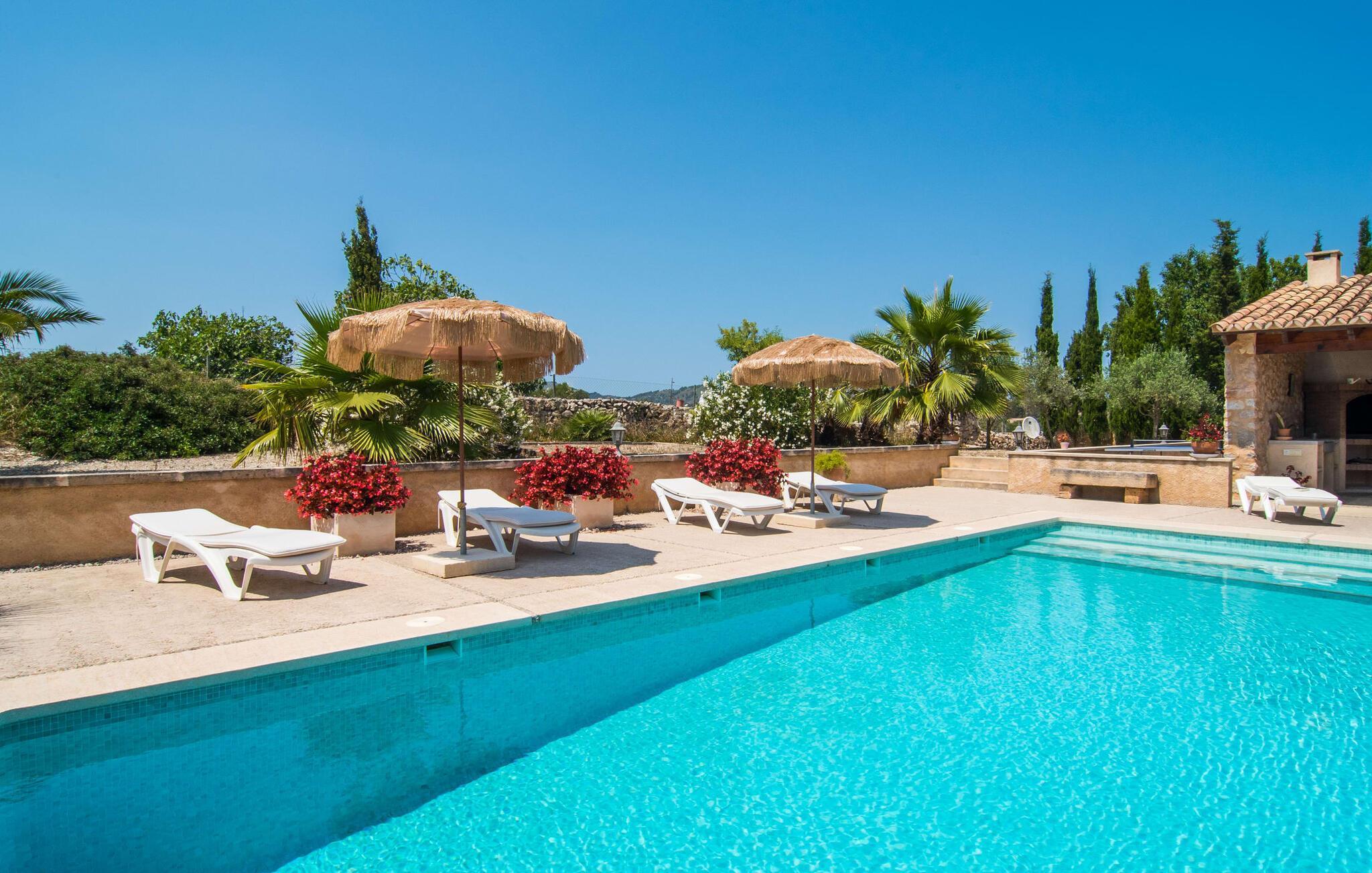 Die charmante Villa „Nonga“ liegt zwischen Artà (4 km) und San Llorenc (10 km) auf einem 42.000 Quadratmeter großen, liebevoll gestalteten Grundstück. Da es keine direkten Nachbarn gibt, können Sie sich während Ihres Aufenthalts völlig privat fühlen. Wenn Sie also auf der Suche nach erholsamer Ruhe sind, dann sind Sie bei uns genau richtig. Gepflegte Kies- und Terrassenflächen, dekorativ und locker durch kleine Wege, hübsche Bepflanzung, Treppen und Mäuerchen gegliedert, prägen das geschmackvolle Außenambiente und laden zum gemütlichen Verweilen im Freien ein. Insgesamt stehen hierfür 10 sehr schöne Sitzgelegenheiten im Freien bereit. Ergänzt werden sie durch sechs bequeme Liegen, die direkt am Pool platziert sind und zum Entspannen einladen. Das große Schwimmbecken ist bequem über eine römische Treppe erreichbar, flach und variiert in der Tiefe zwischen 0,80 m und 2,20 m. An warmen Tagen können Sie sich hier wunderbar erfrischen. Von der großen überdachten Terrasse direkt neben dem Haus haben Sie einen tollen Blick auf den Poolbereich, so dass etwaige mitreisende, im Wasser spielende Kinder gut beaufsichtigt werden können. Auf verschiedenen Sesseln und Stühlen lässt es sich in luftigem Schatten elegant speisen und dabei den fantastischen Blick über die Gartenlandschaft genießen. Für deftige Grillabende steht Ihnen ein BBQ zur Verfügung, mit dem Sie an lauen Abenden ein kulinarisches Essen zaubern und den Tag in geselliger Runde ausklingen lassen können.