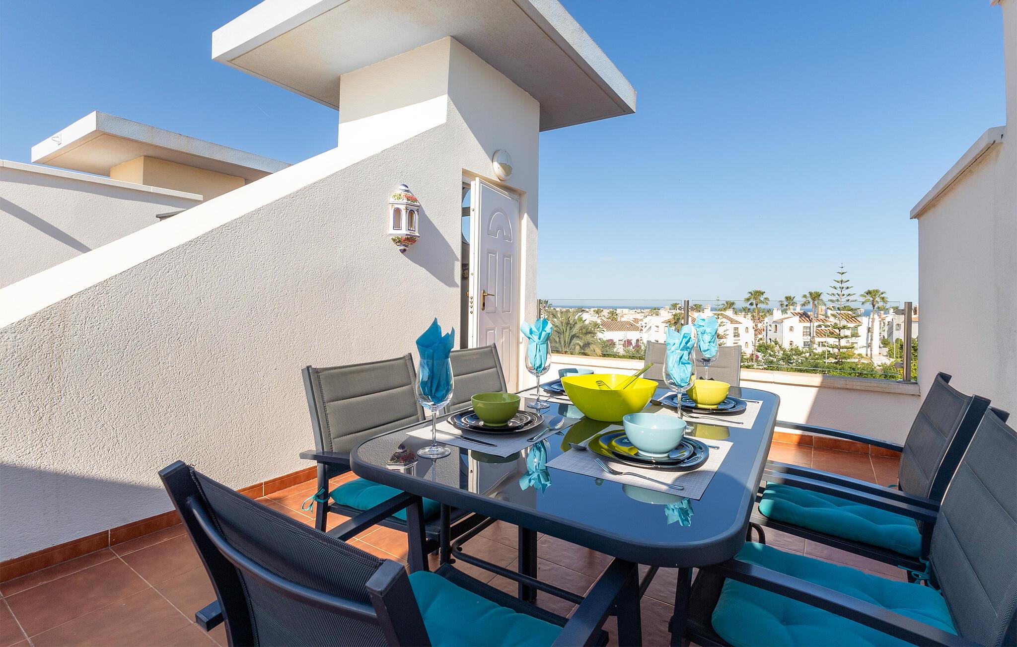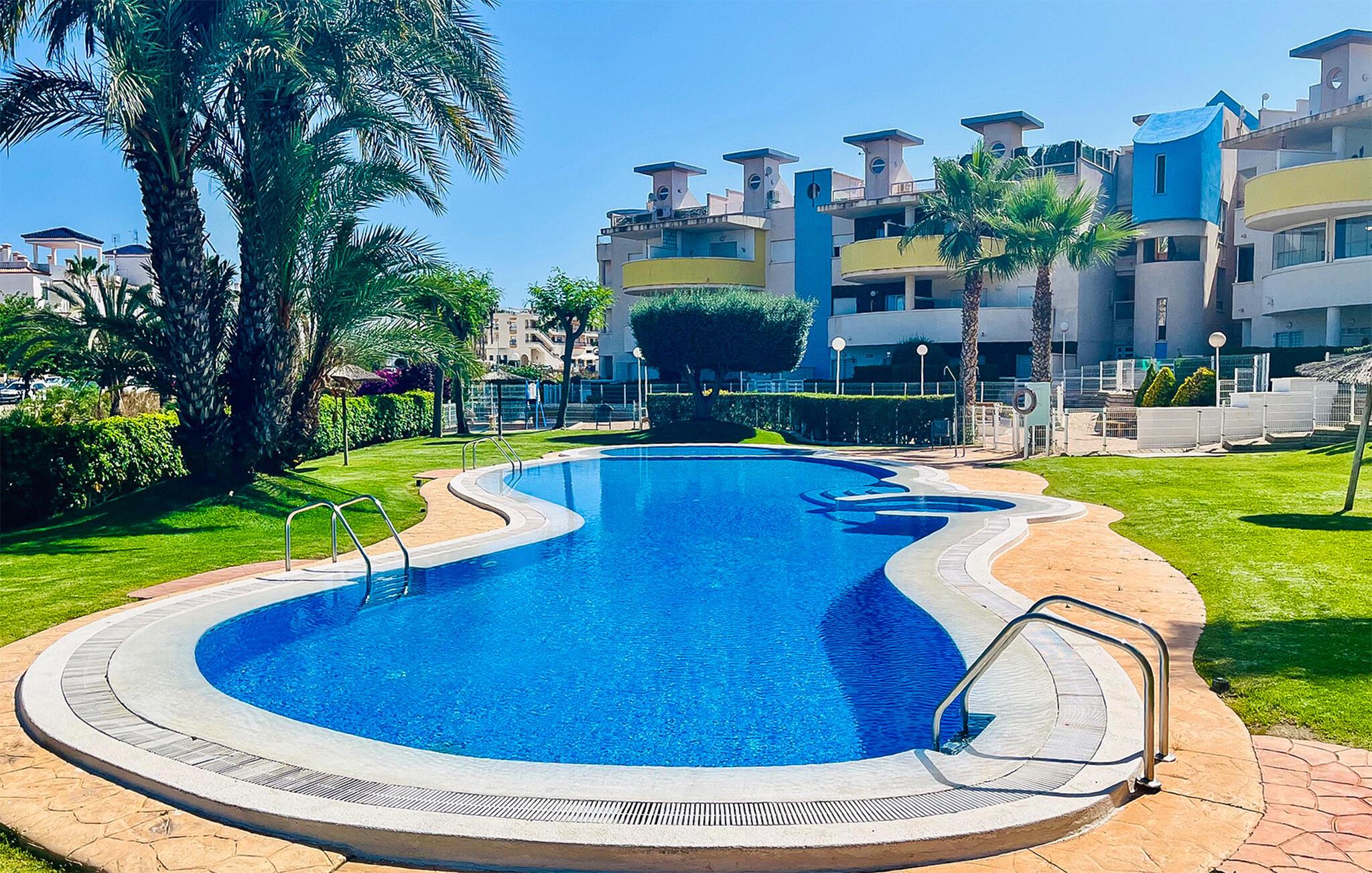 Freuen Sie sich auf entspannte Stunden auf der privaten Terrasse mit herrlichem Weitblick. Genießen Sie hier die Sonne auf bequemen Stühlen oder richten Sie ein Essen unter freiem Himmel aus. Abkühlung finden Sie im gepflegten Gemeinschaftspool, der umgeben ist von Palmen und einer Rasenfläche.