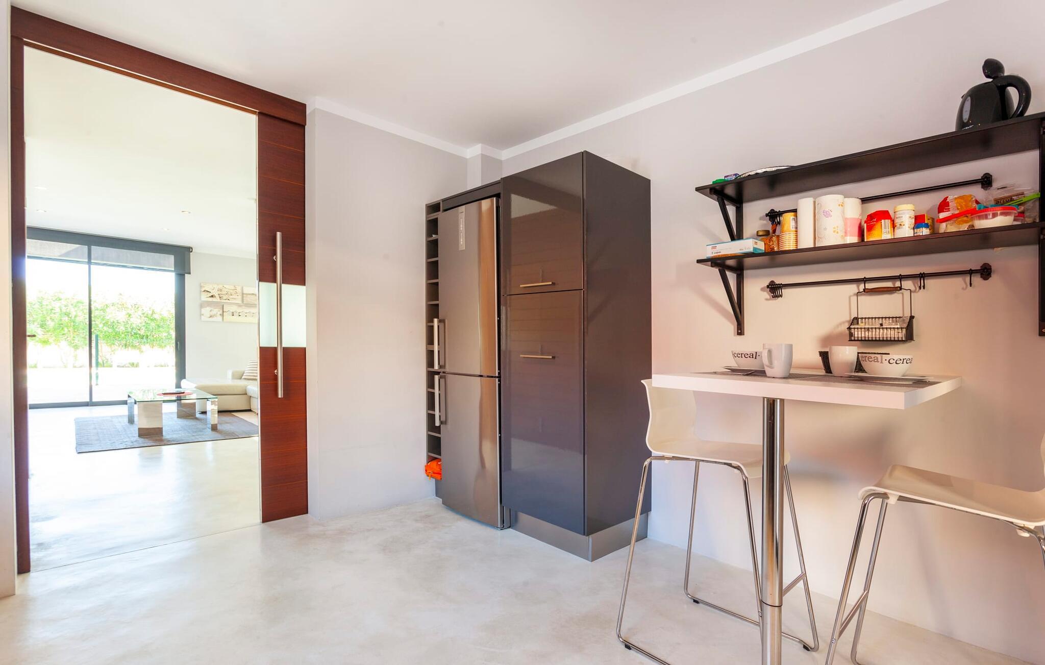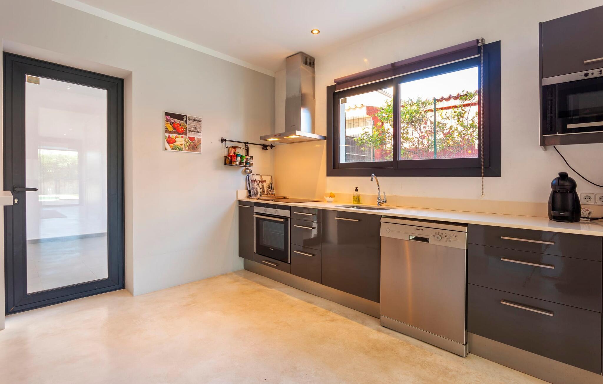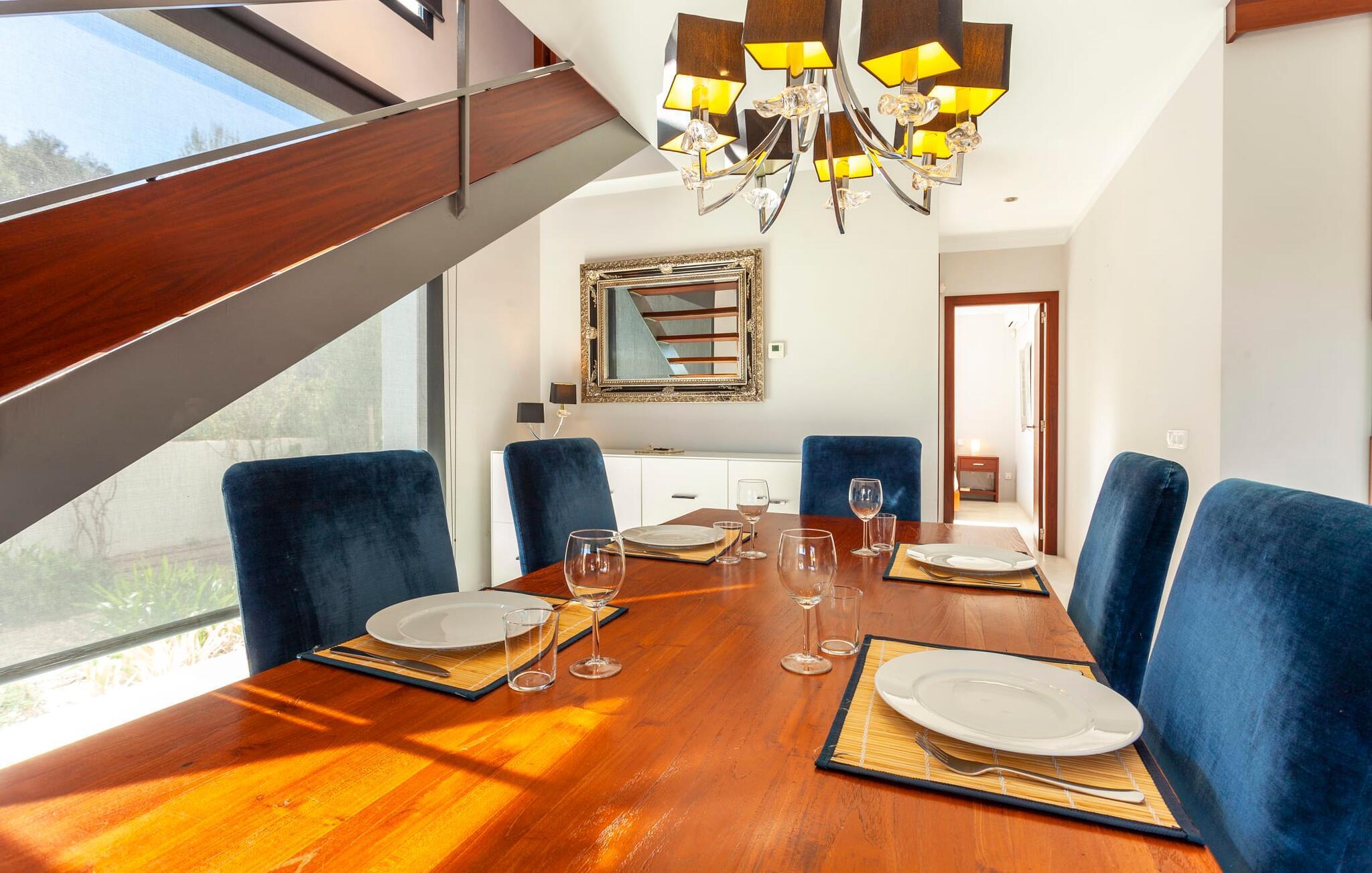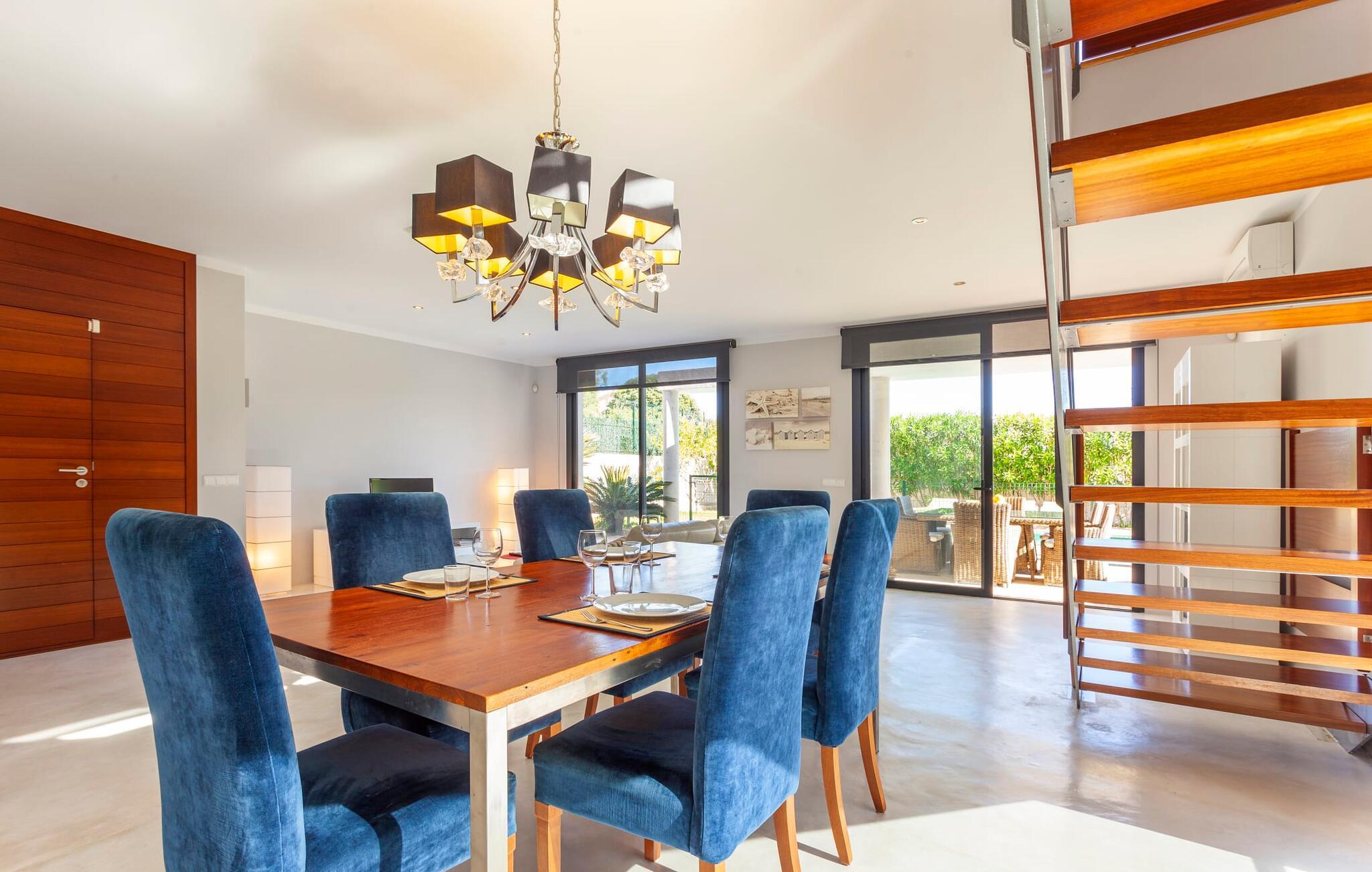Das Innere der voll klimatisierten Villa passt perfekt zum modernen Äußeren. Klare Linien und harmonische, natürliche Farben dominieren, und dank des geschulten Blicks der Dekorateure für Details wie Möbel, Wohnaccessoires und Stoffe wurde eine zurückhaltende, aber einladend warme Wohnatmosphäre geschaffen. Sowohl Paare als auch Familien mit Kindern fühlen sich hier sofort zuhause. Alle Räume sind durch große Fenster wunderbar hell. Im Erdgeschoss befindet sich ein Doppelzimmer mit Bad sowie die schicke graue Küche mit kleinem Tisch für den Morgenkaffee und der offene Wohn- und Essbereich. Während das große Sofa dazu einlädt, stundenlang zu faulenzen und fernzusehen, finden Sie direkt daneben einen langen Esstisch mit eleganten Stühlen mit Satinpolsterung, der im stimmungsvollen Licht des Kronleuchters erstrahlt. Hier können Sie in Ruhe zusammensitzen, schmackhafte Mahlzeiten genießen und die erlebnisreichen Urlaubstage Revue passieren lassen.