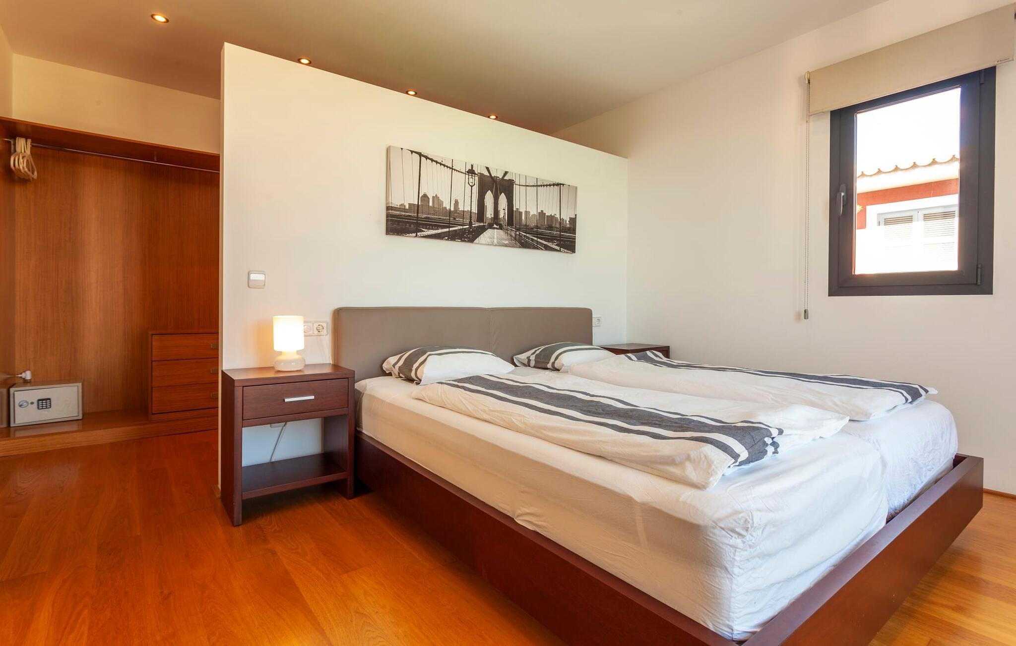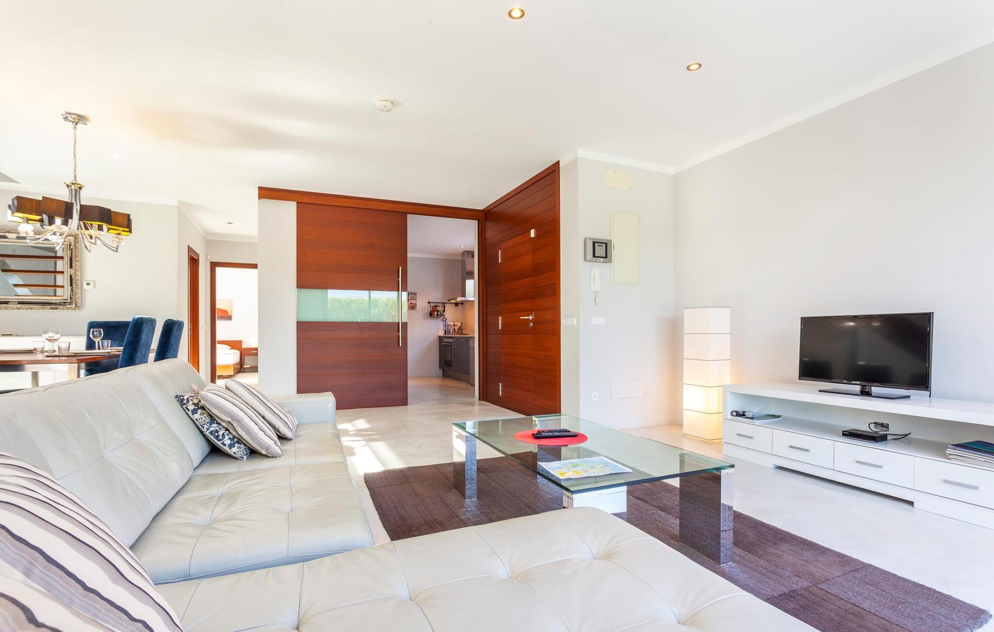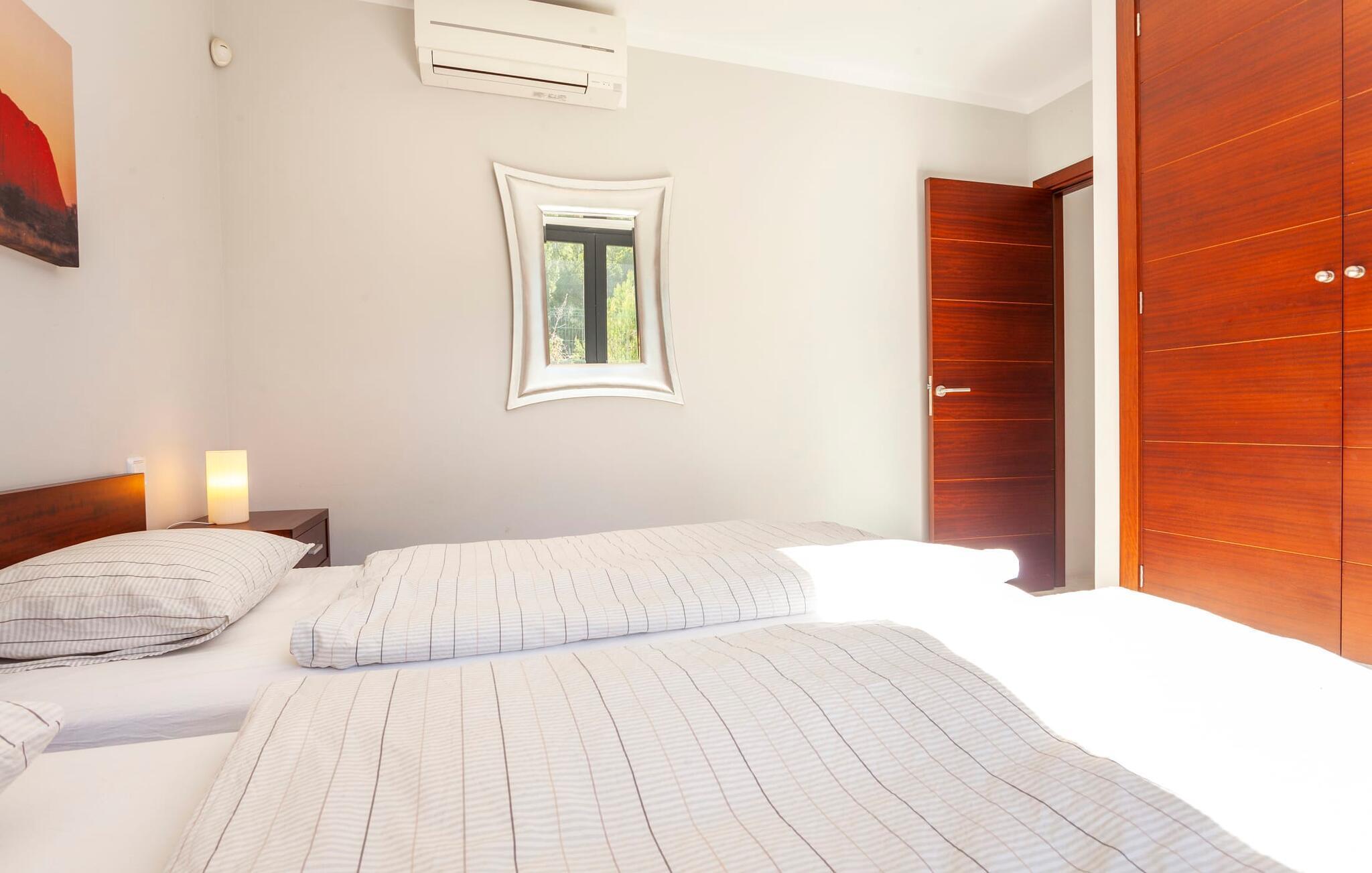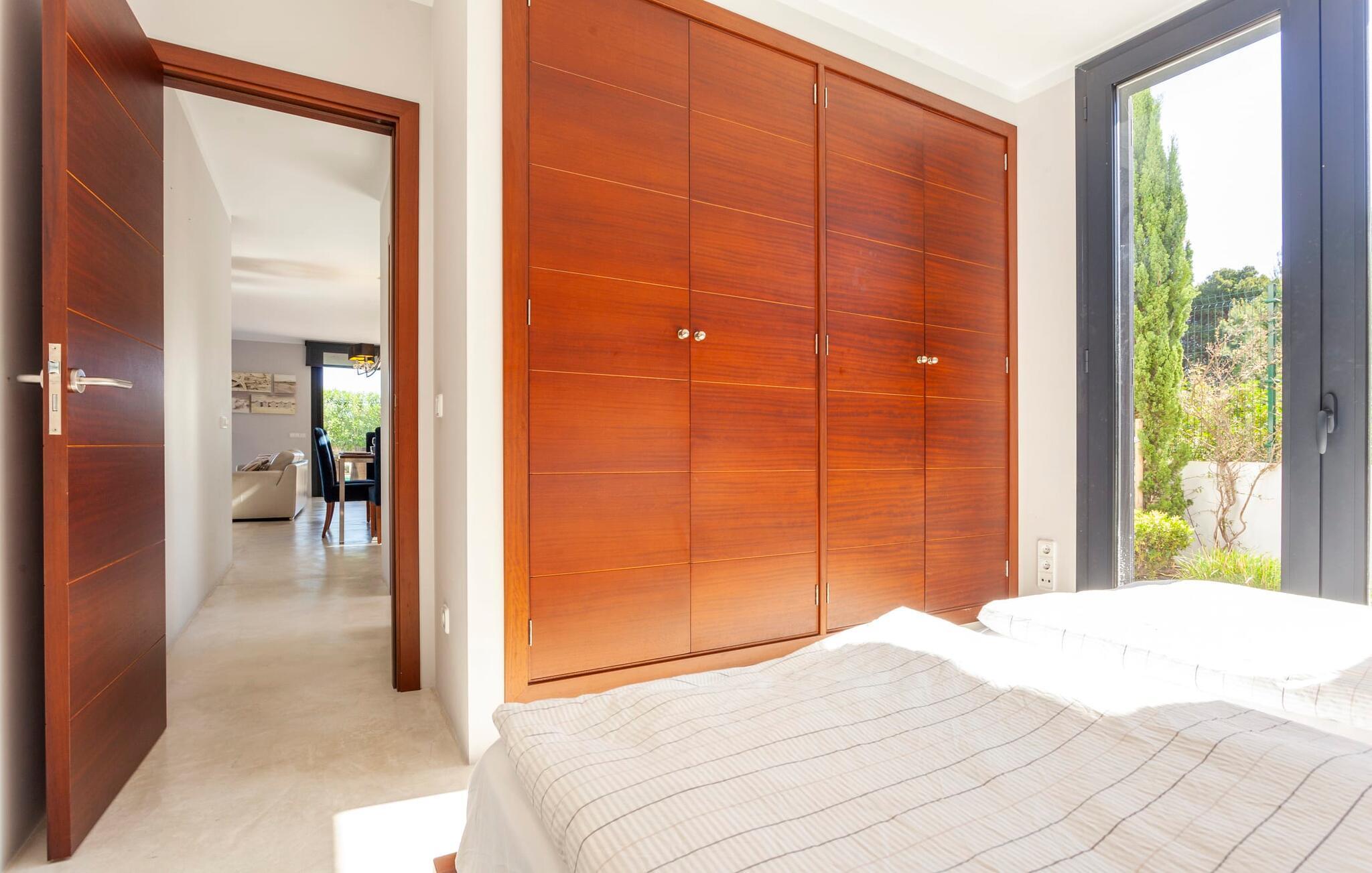Das Innere der voll klimatisierten Villa passt perfekt zum modernen Äußeren. Klare Linien und harmonische, natürliche Farben dominieren, und dank des geschulten Blicks der Dekorateure für Details wie Möbel, Wohnaccessoires und Stoffe wurde eine zurückhaltende, aber einladend warme Wohnatmosphäre geschaffen. Sowohl Paare als auch Familien mit Kindern fühlen sich hier sofort zuhause. Alle Räume sind durch große Fenster wunderbar hell. Im Erdgeschoss befindet sich ein Doppelzimmer mit Bad sowie die schicke graue Küche mit kleinem Tisch für den Morgenkaffee und der offene Wohn- und Essbereich. Während das große Sofa dazu einlädt, stundenlang zu faulenzen und fernzusehen, finden Sie direkt daneben einen langen Esstisch mit eleganten Stühlen mit Satinpolsterung, der im stimmungsvollen Licht des Kronleuchters erstrahlt. Hier können Sie in Ruhe zusammensitzen, schmackhafte Mahlzeiten genießen und die erlebnisreichen Urlaubstage Revue passieren lassen.